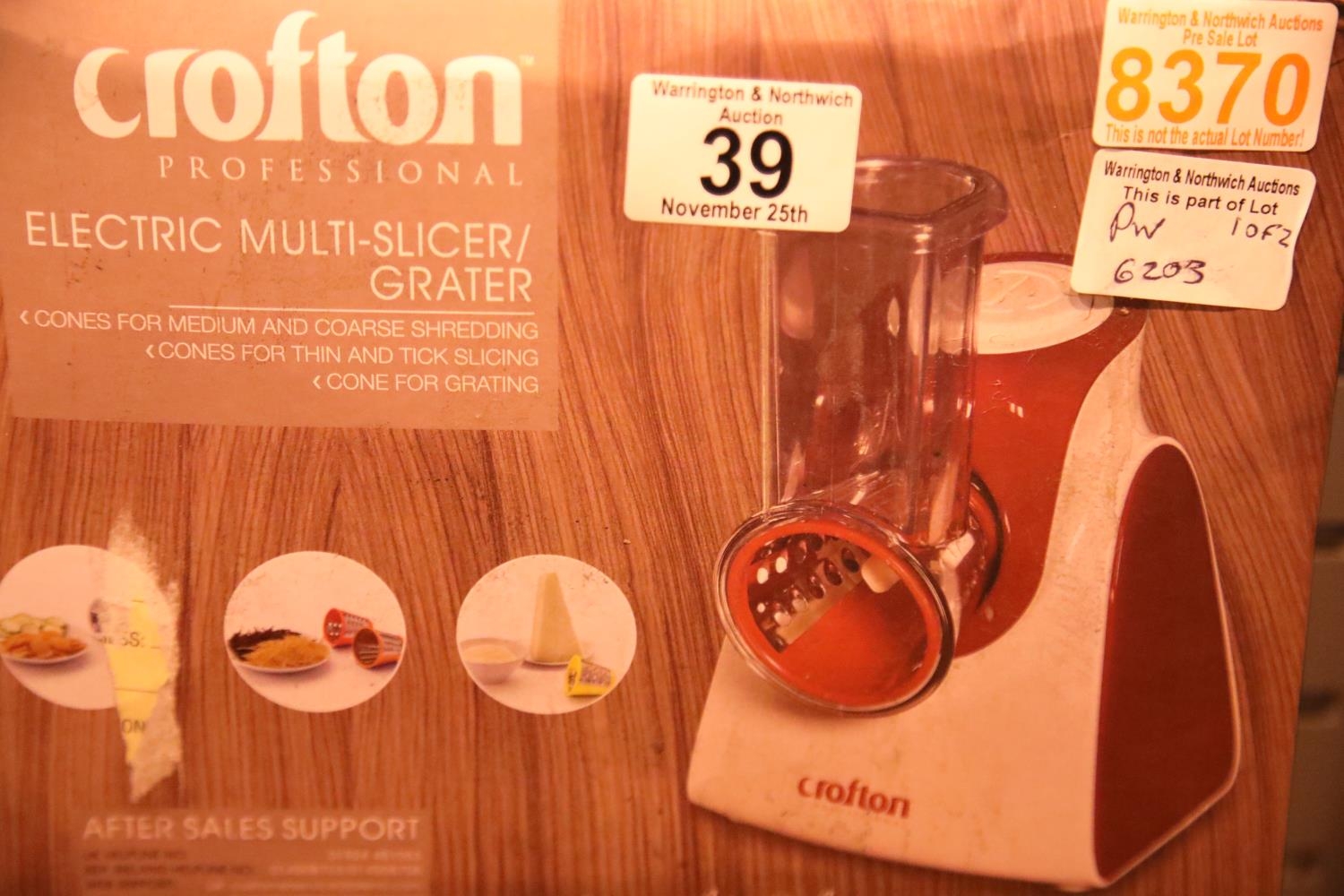 Two boxed crofton electric multi slicer/graters. Not available for in-house P&P