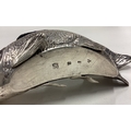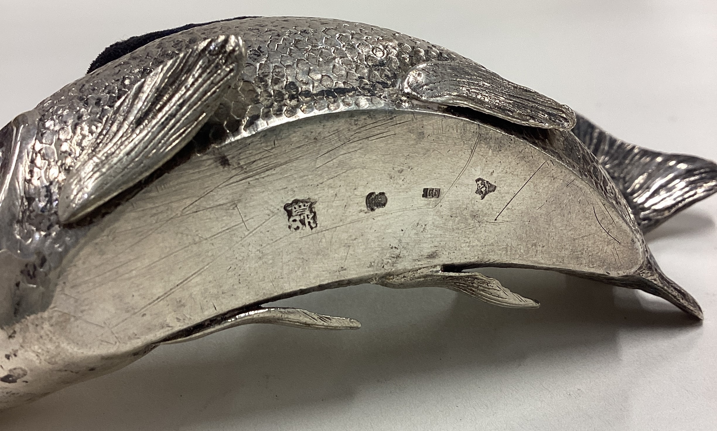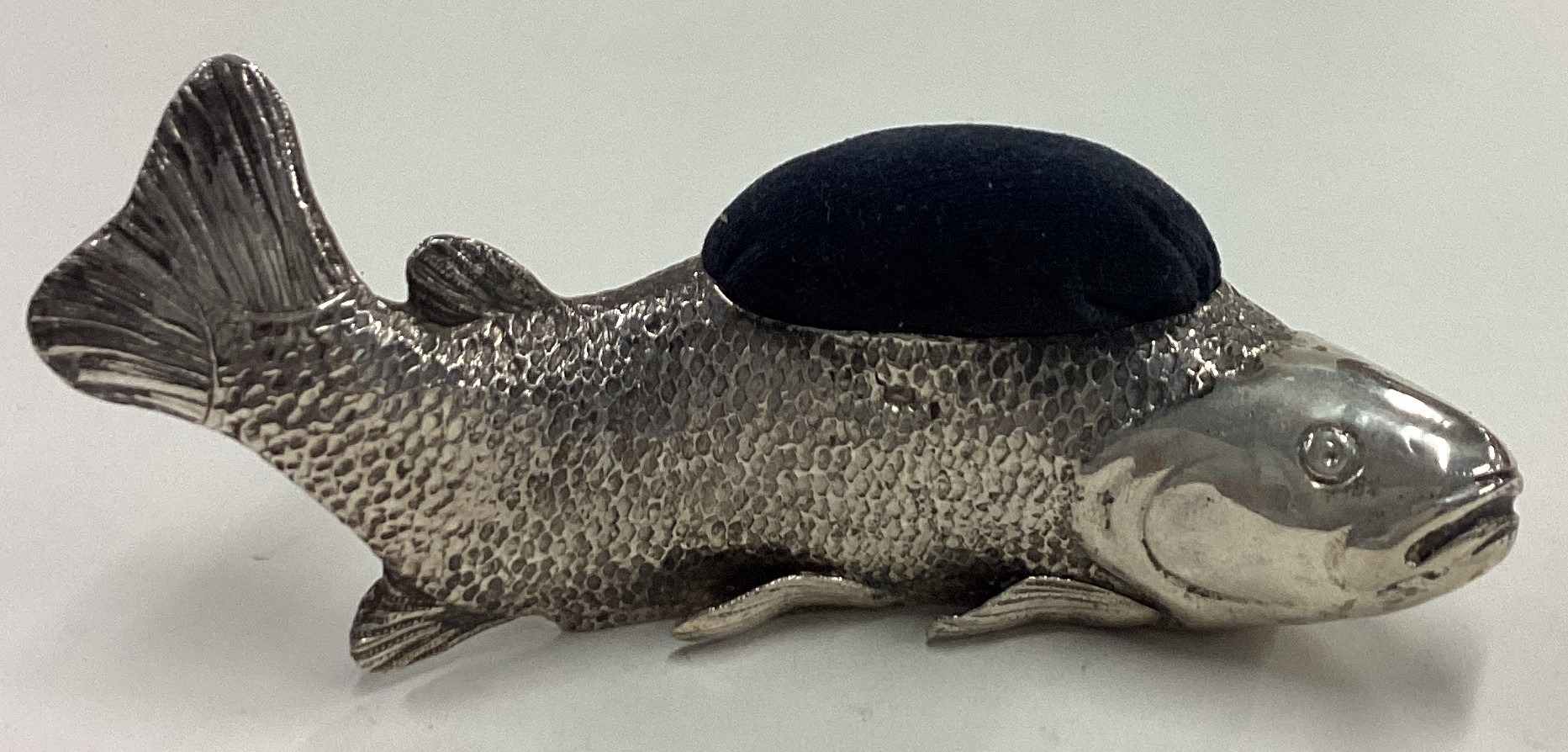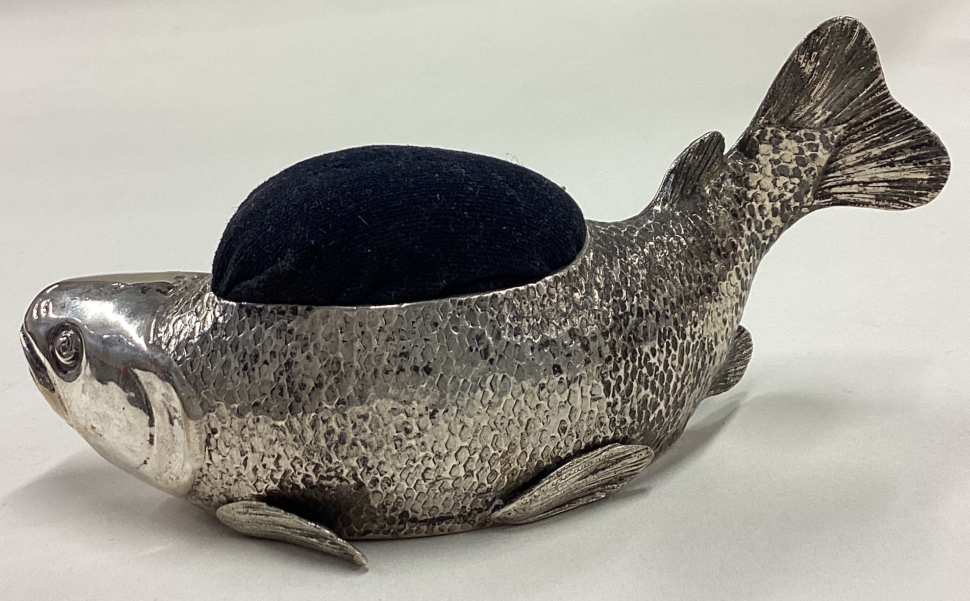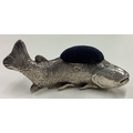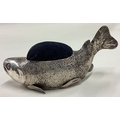 A large 19th Century silver articulated fish pin cushion. Marked to base. Approx. 156 grams of gross weight. Est. £20 - £30.
