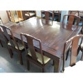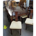 HARDWOOD DINING ROOM SUITE comprising a SET OF 6 SINGLE CHAIRS with plain splat backs, panel seat with fitted squab cushions covered in pattern self coloured fawn fabric, on square tapering front support with moulded borders and spade feet; and the RECTANGULAR DINING TABLE with plain apron on four square tapering legs, 3'8" wide, 4'8" long (112cm x 142cm), extending with 3 loose leaves with aprons to 9'8" (295cm)