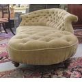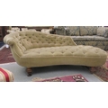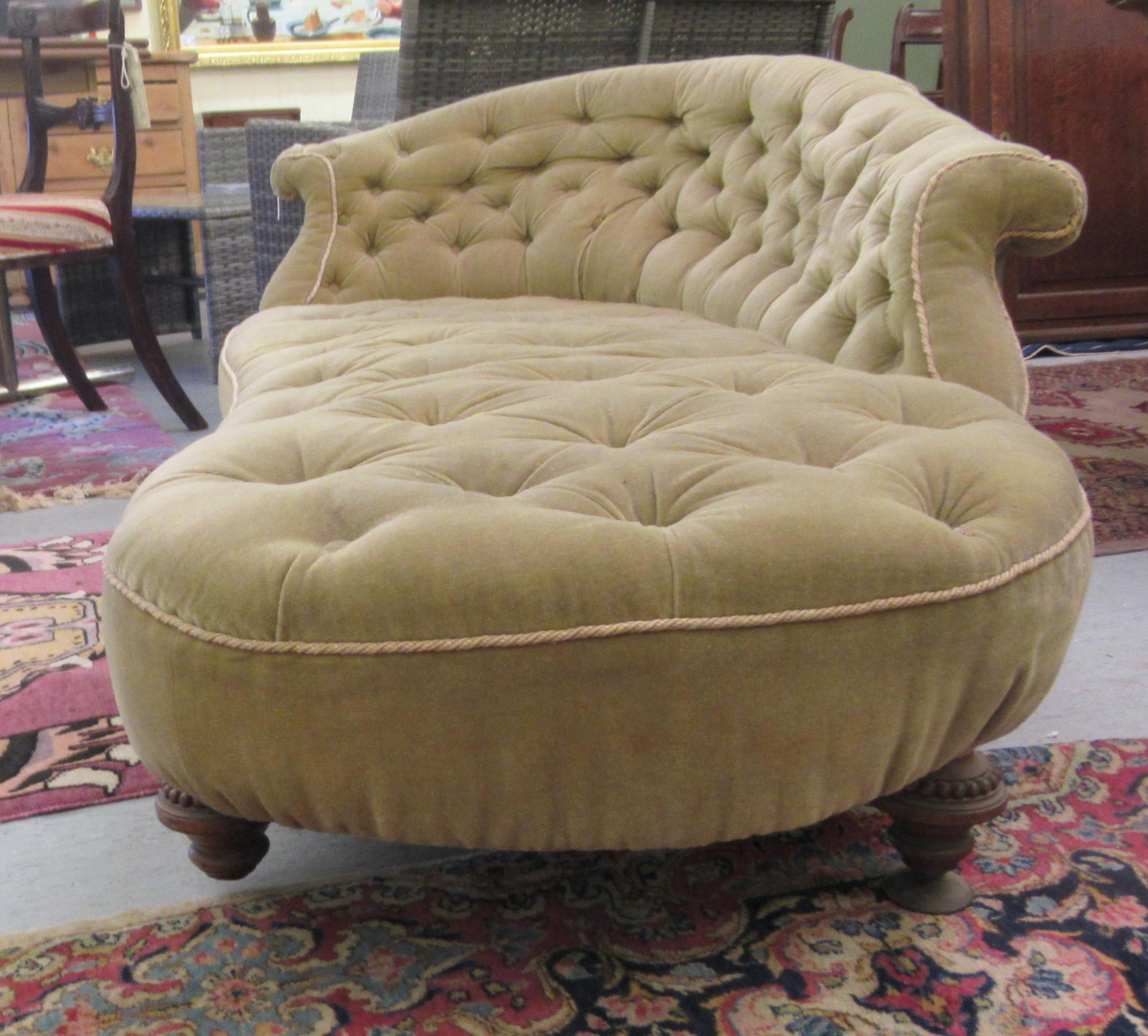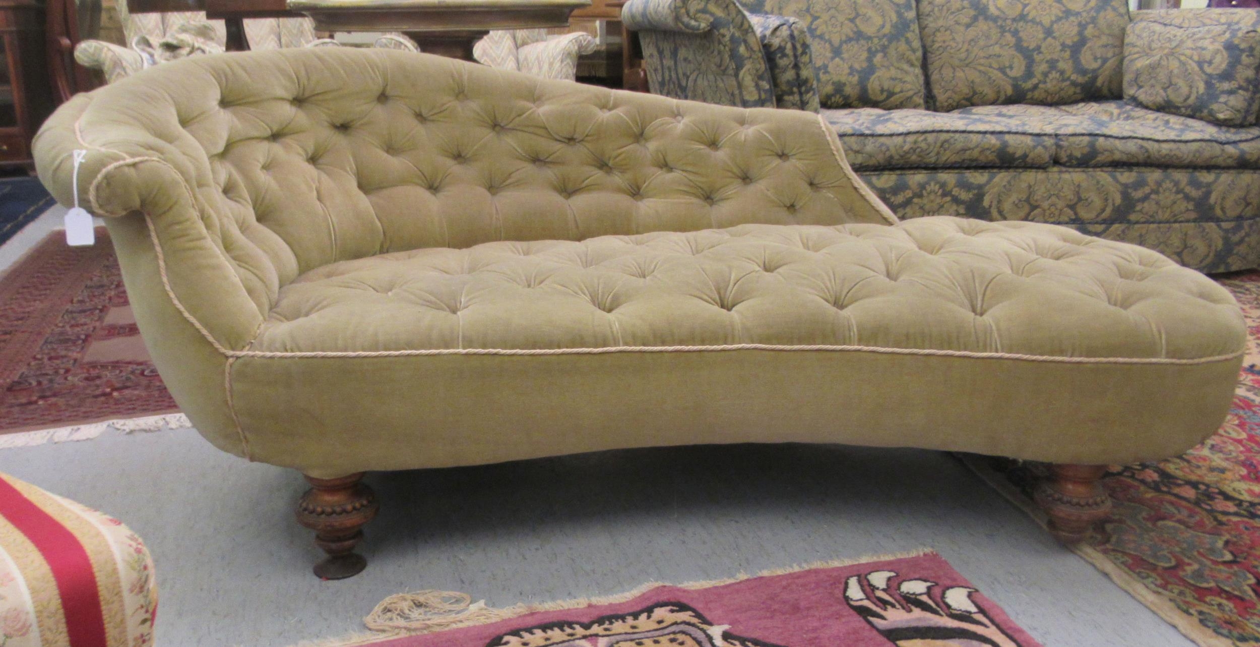 An Edwardian chaise longue, later upholstered in green fabric, raised on turned feet