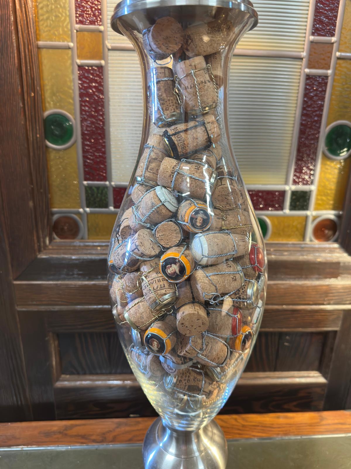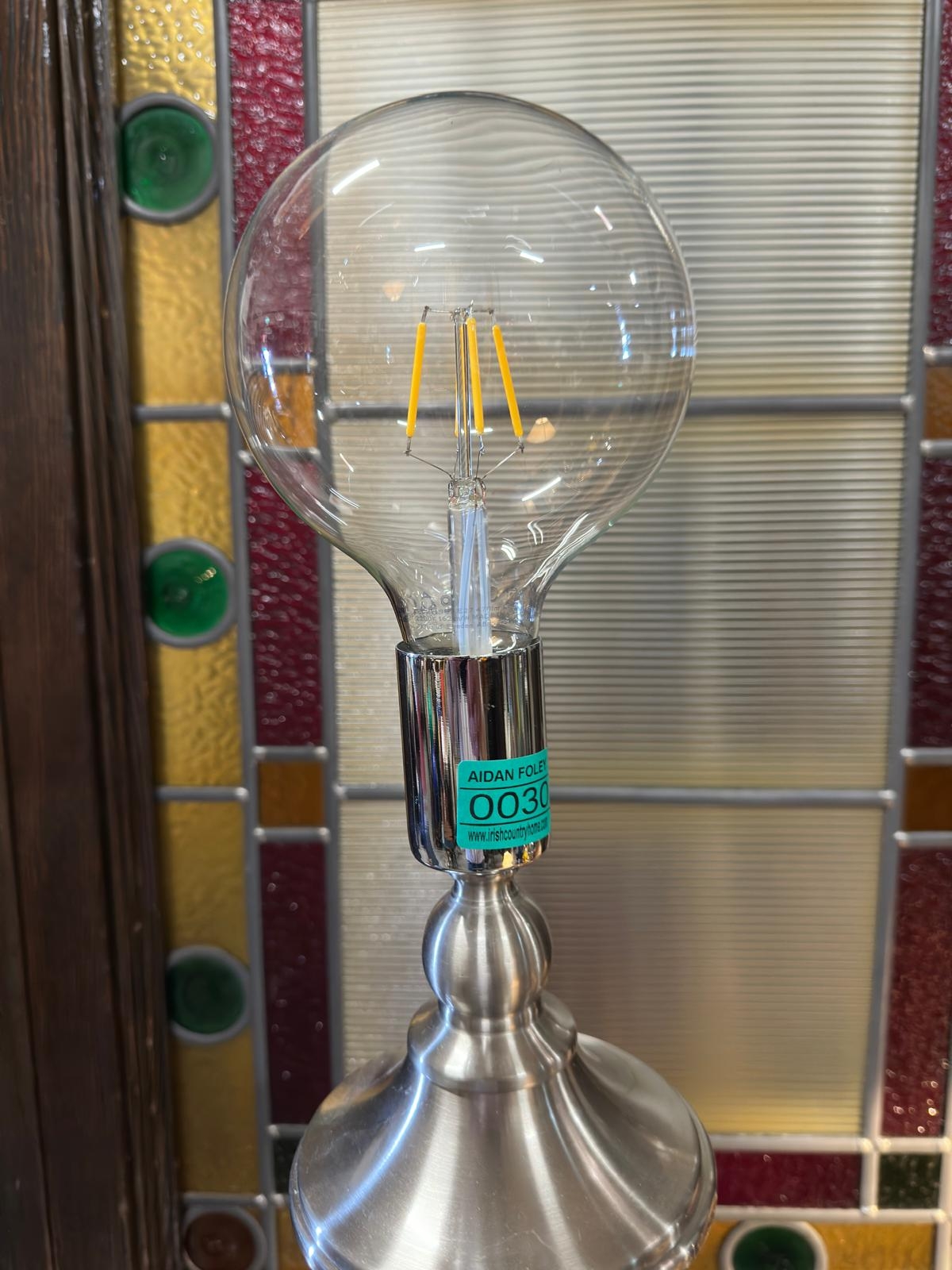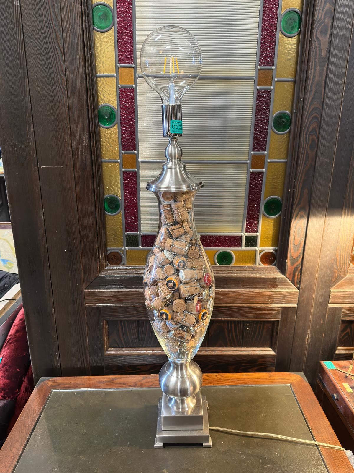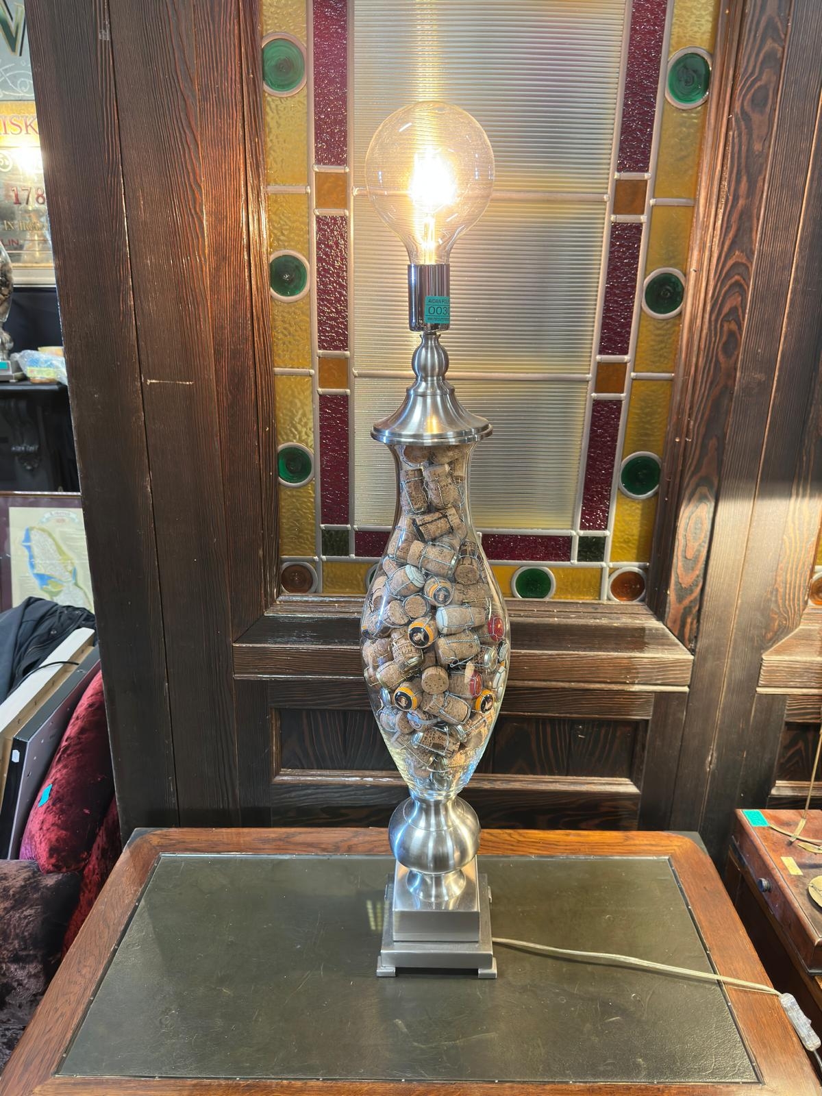 Limited Edition Table Lamp - Champagne Cork filled base, Chrome and Glass with large filiment Bulb - special piece