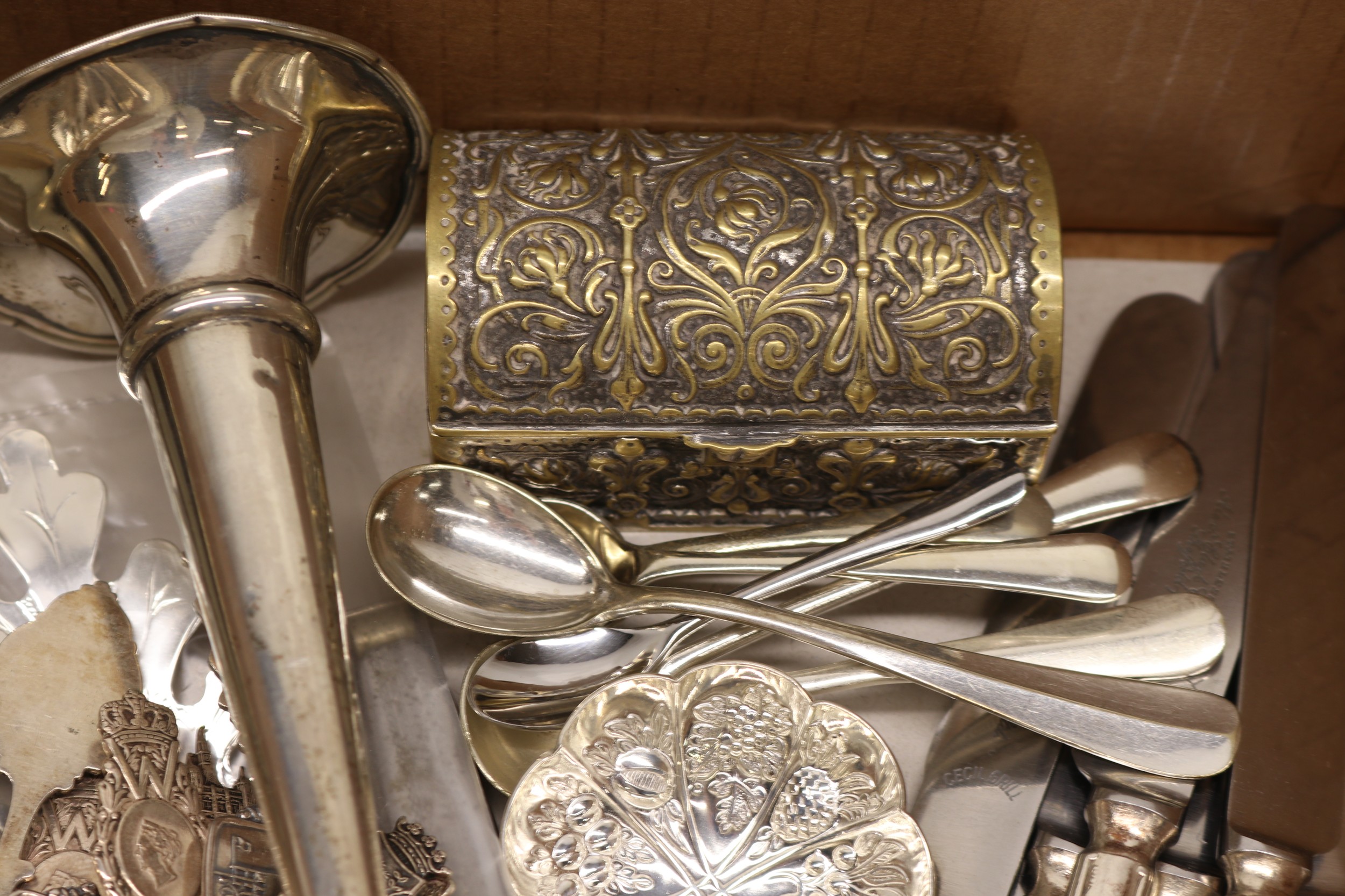 Collection of silver plate & metal items comprising Art Nouveau chased brass jewellery trinket chest; Art Deco cake serving set with shovel & cutter; trumpet-shaped bud vase; Elkington & Co dinner knives; woodworm leaf-design absinth spoon; Solingen multitool with pouch; pipe smokers tool; fruit serving spoon; cheese knives; selection of Kings Pattern serving spoons & fish knives, souvenir spoons, etc. (c59)