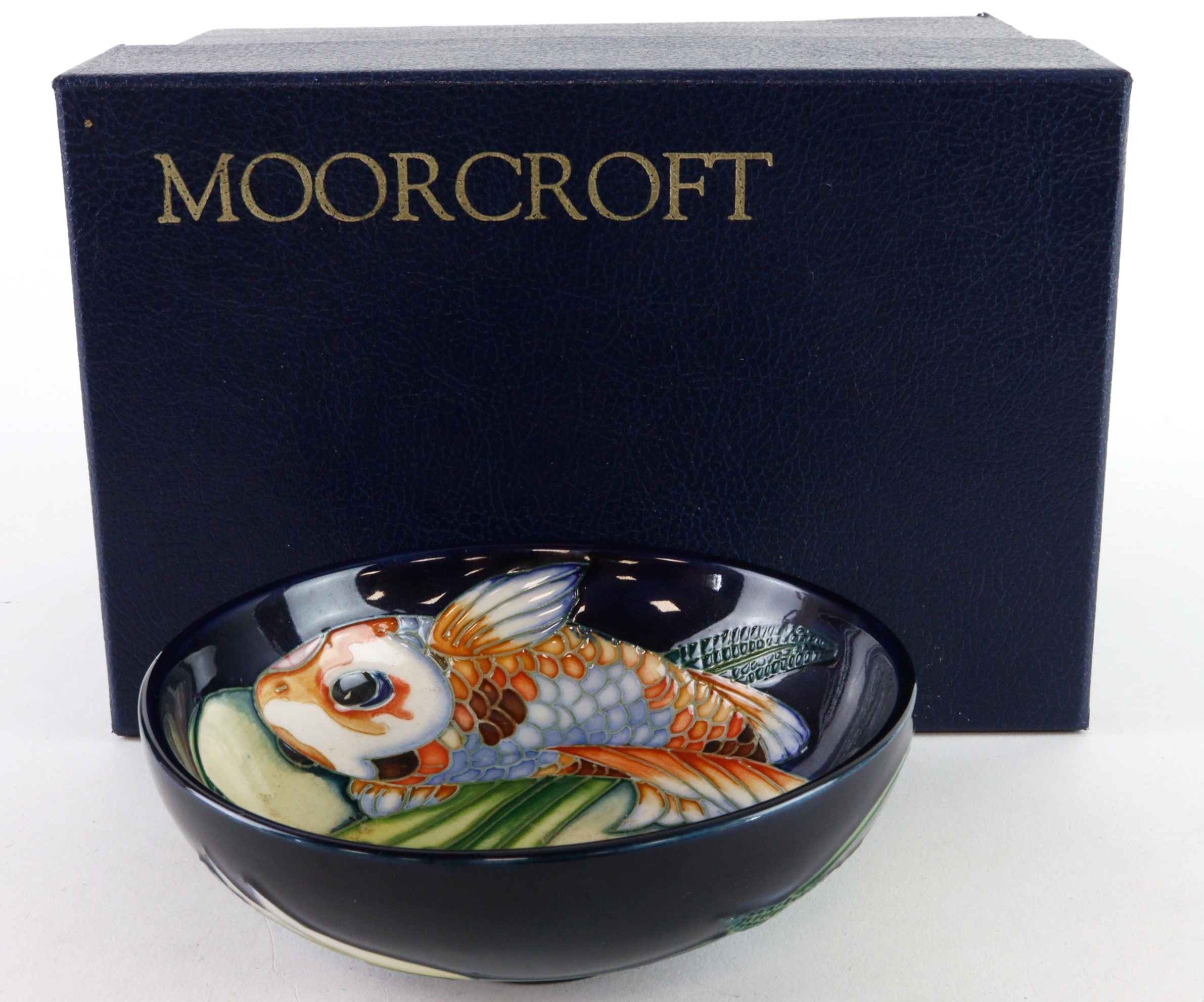 Moorcroft 'Quiet Waters' pattern dish, dated 2002, makers marks to base, diameter 11.5cm approx., contained in a Moorcroft box