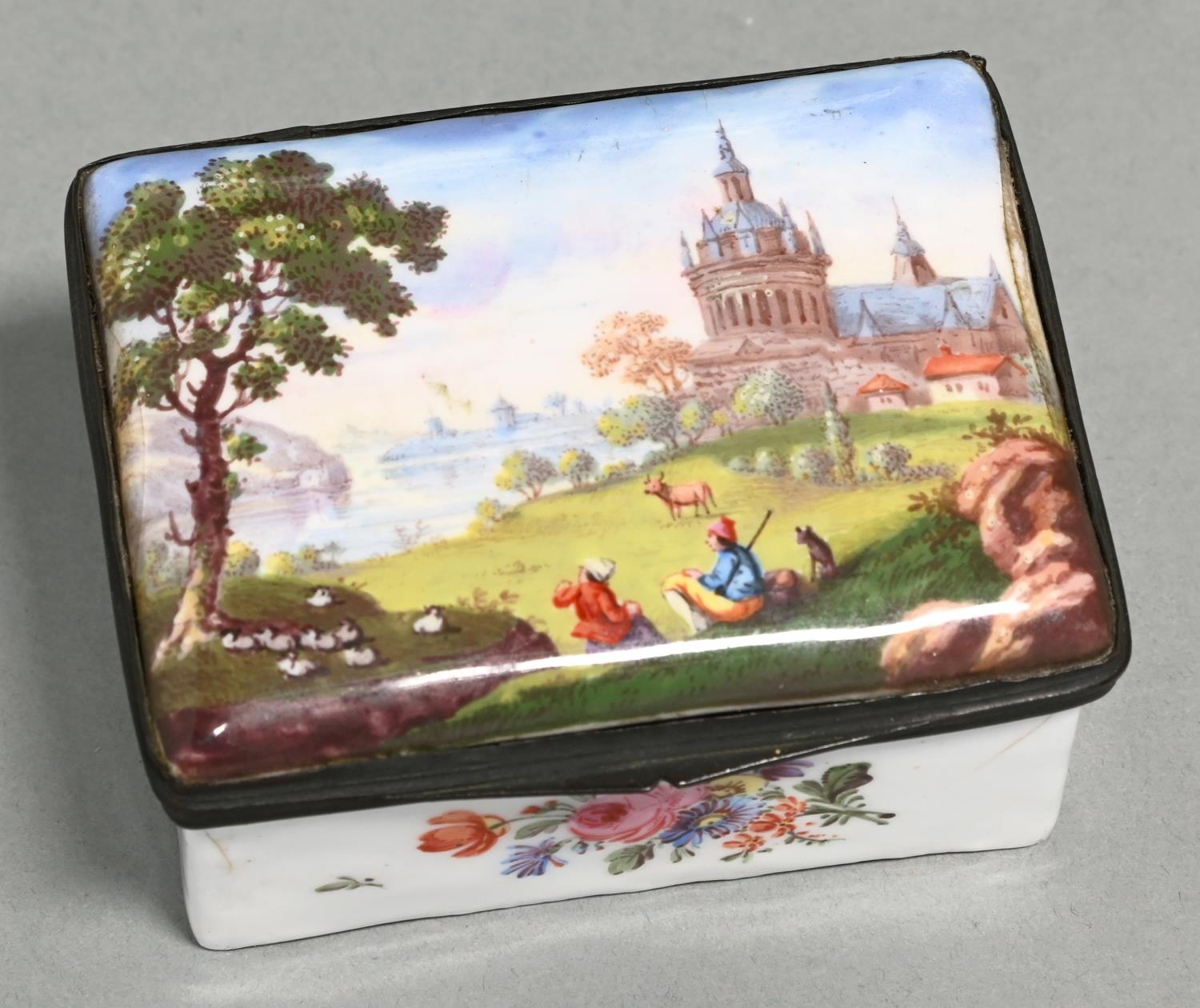A Continental enamel bonbonniere, 19th c, the lid painted with shepherds in a pastural landscape with distant buildings, the sides with flowers, metal mount with shaped thumbpiece, 85mm l