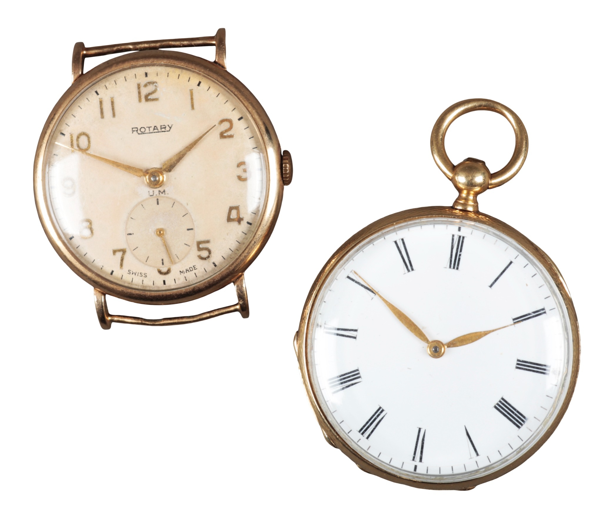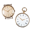 with manual wind movement, white dial, subsidiary seconds dial, gold Arabic numerals, gold hands, circa 1950s, case diameter approx. 32mm, gross weight c. 15.74 grams; together with a gold-plated open face pocket watch (2)