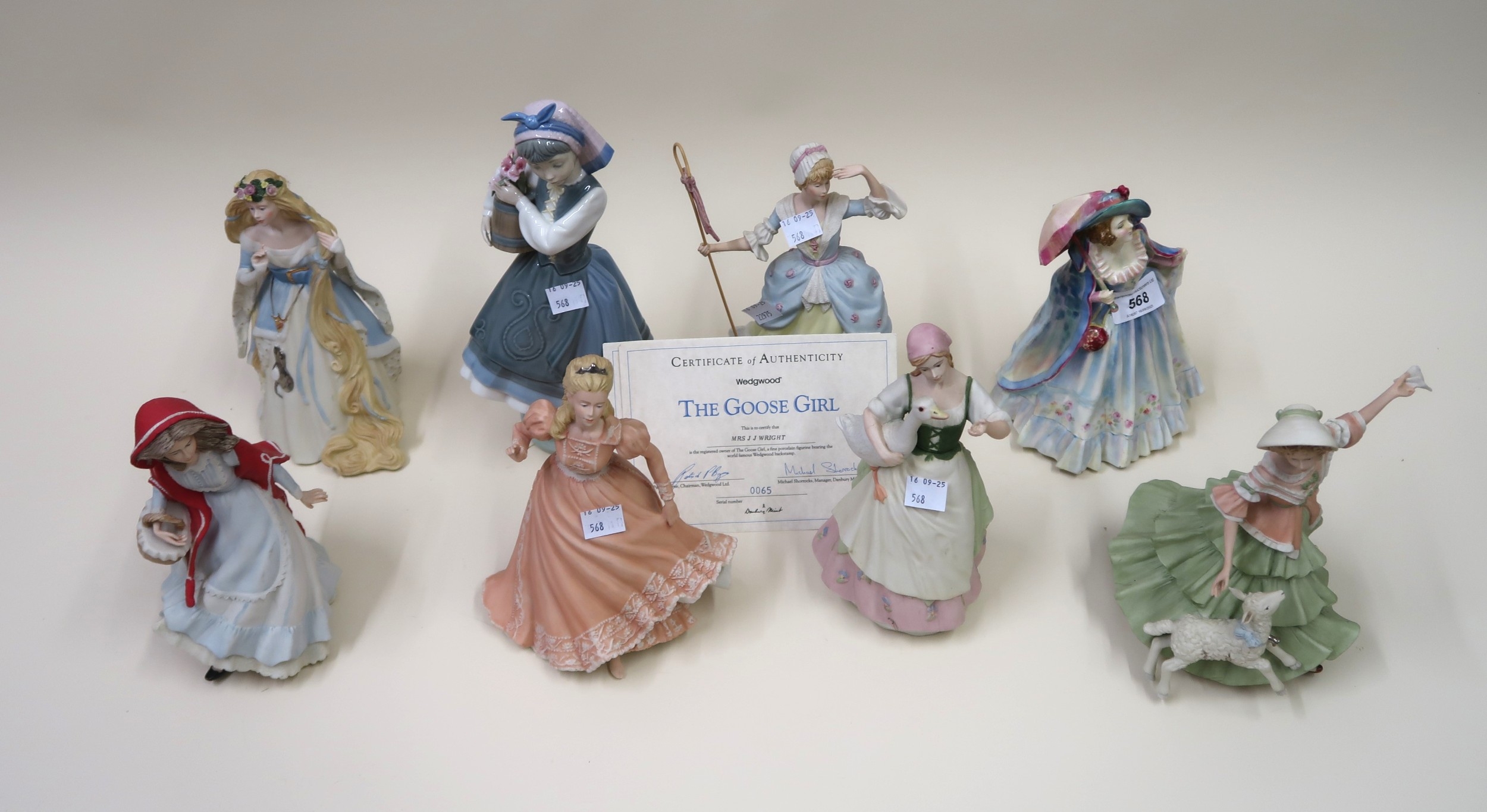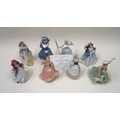 Royal Doulton figure, ' Mirabelle ' (at fault), together with six modern Wedgwood matt glazed figures and a Lladro figure of a girl carrying flowers