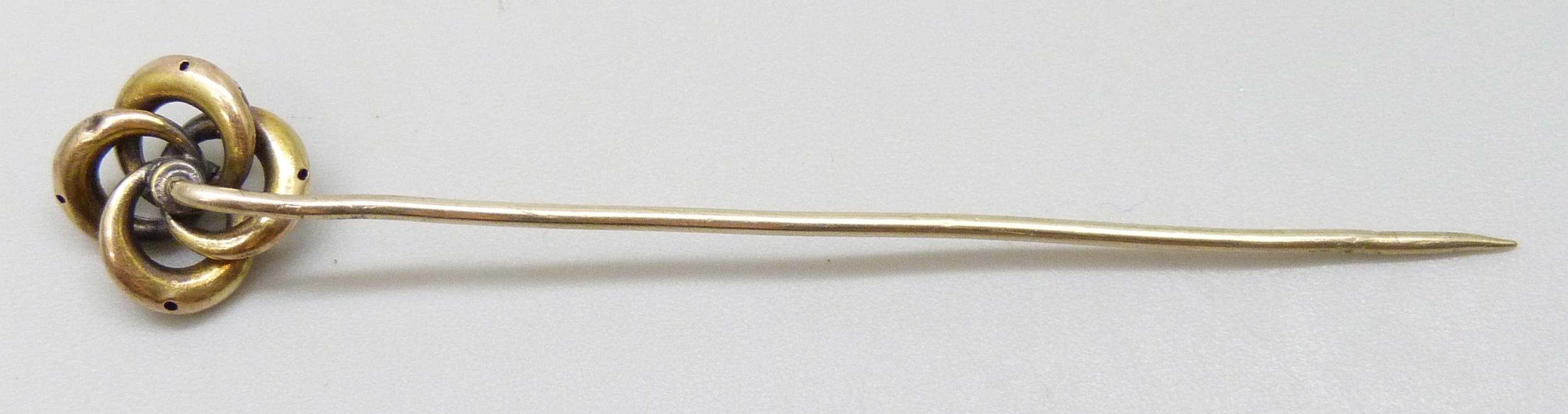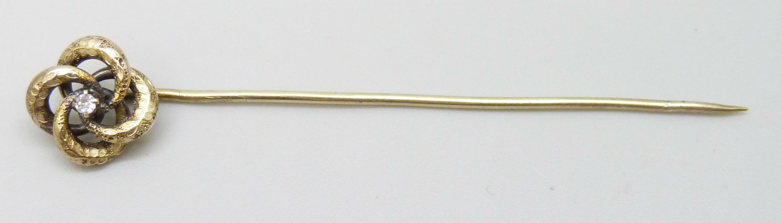 A Victorian yellow metal diamond set knot design stick pin, 1.4g, 6.5cm