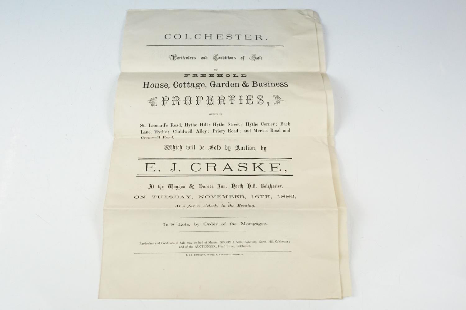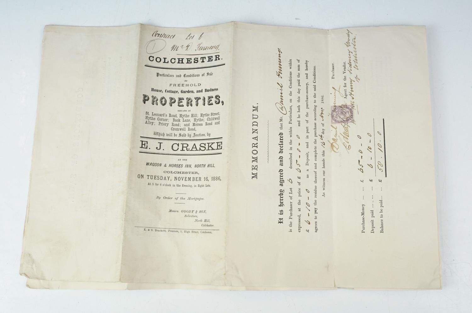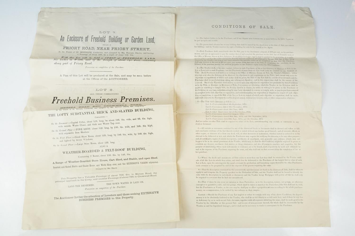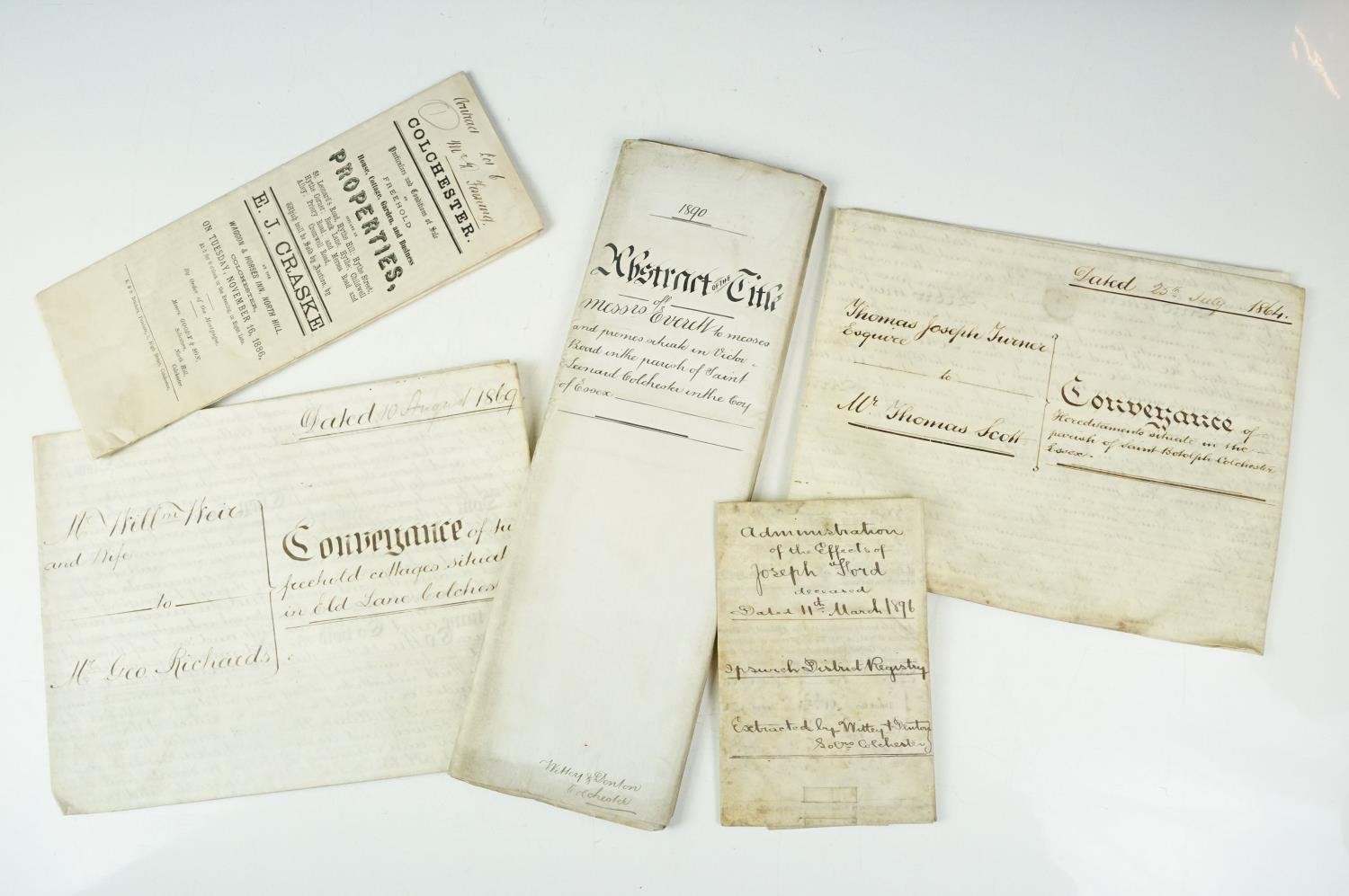 Ephemera - two indentures, 1863 and 1869, Particulars and Conditions of Sale for Properties sold by auction by EJ Craske, 1886, an Abstract of the Title, 1890 and a letter from the High Court of Justice relating to a person dying intestate in 1896 (5)