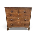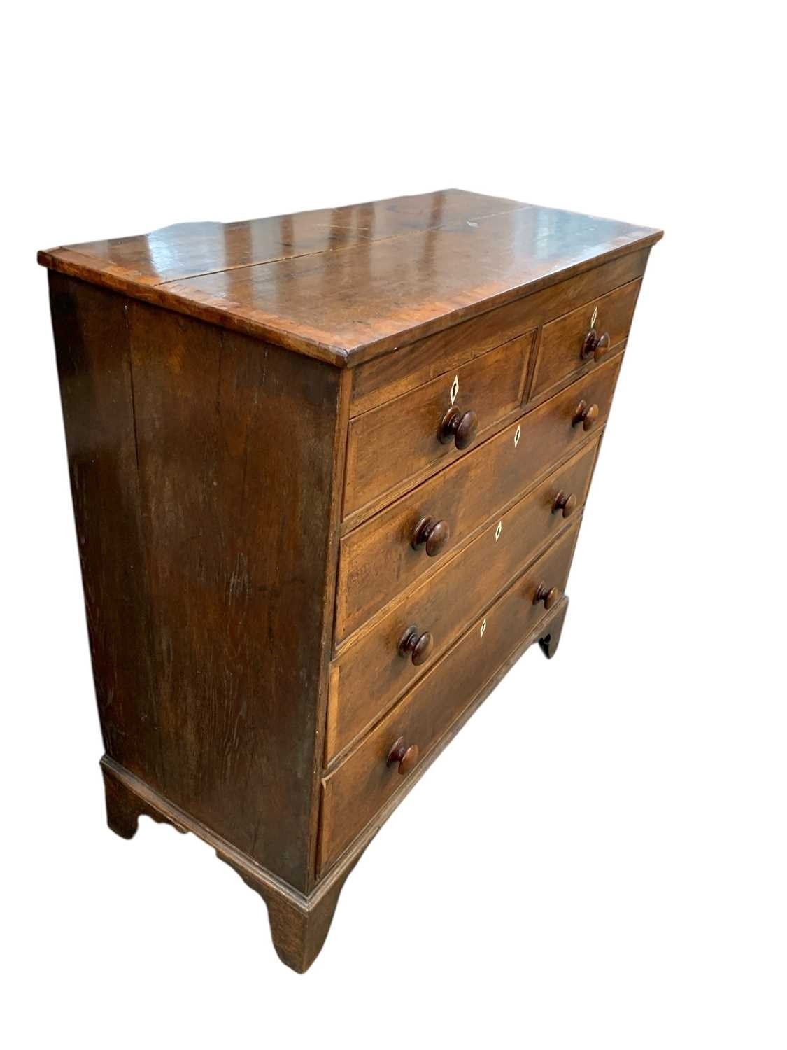 A 19th century oak and crossbanded chest. Fitted two short and three long drawers with turned wooden knobs, on bracket feet, height 108cm, width 107cm, depth 48cm.