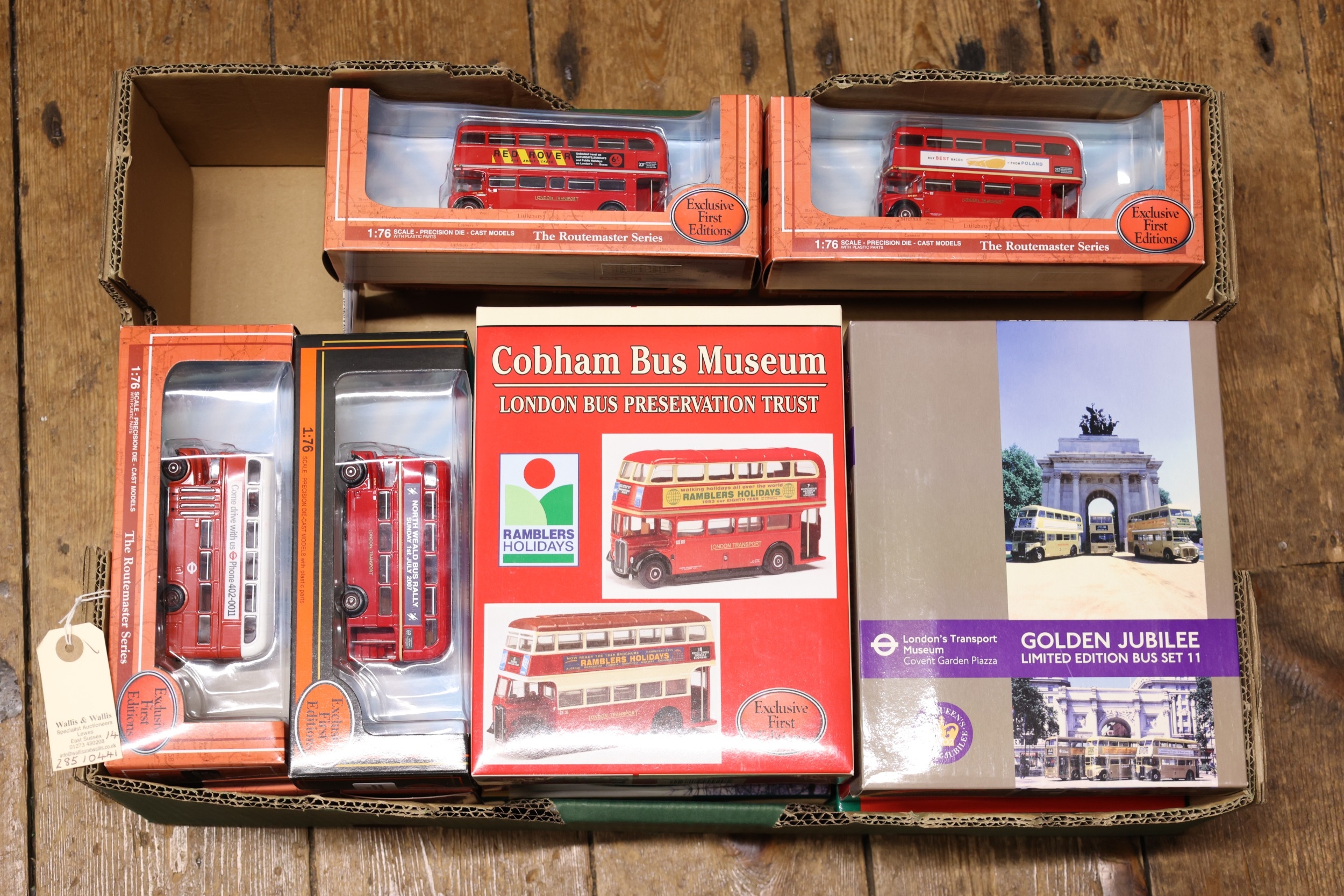 6 EFE 2/3 vehicle sets. Routemasters Set No.10, RM Sovereign/RML Stagecoach. No.11 Golden Jubilee, AEC RT, Routemaster and Leyland Titan. No.12 Routemaster Prototypes. No.13 London Country GS & RF. Plus No.14, Dartford 1963, AEC Renown and an RT. Plus another set, Cobham Bus Museum, London Bus Preservation Trust, AEC RT and Guy Arab. Also 7x The Routemaster Series, 6 London Transport and an Arriva example. One is a Subscriber Special -Last Day Of Route 38. Plus another Routemaster, L.T. North Weald 2007. All boxed. Contents Mint. (14) £60-80