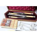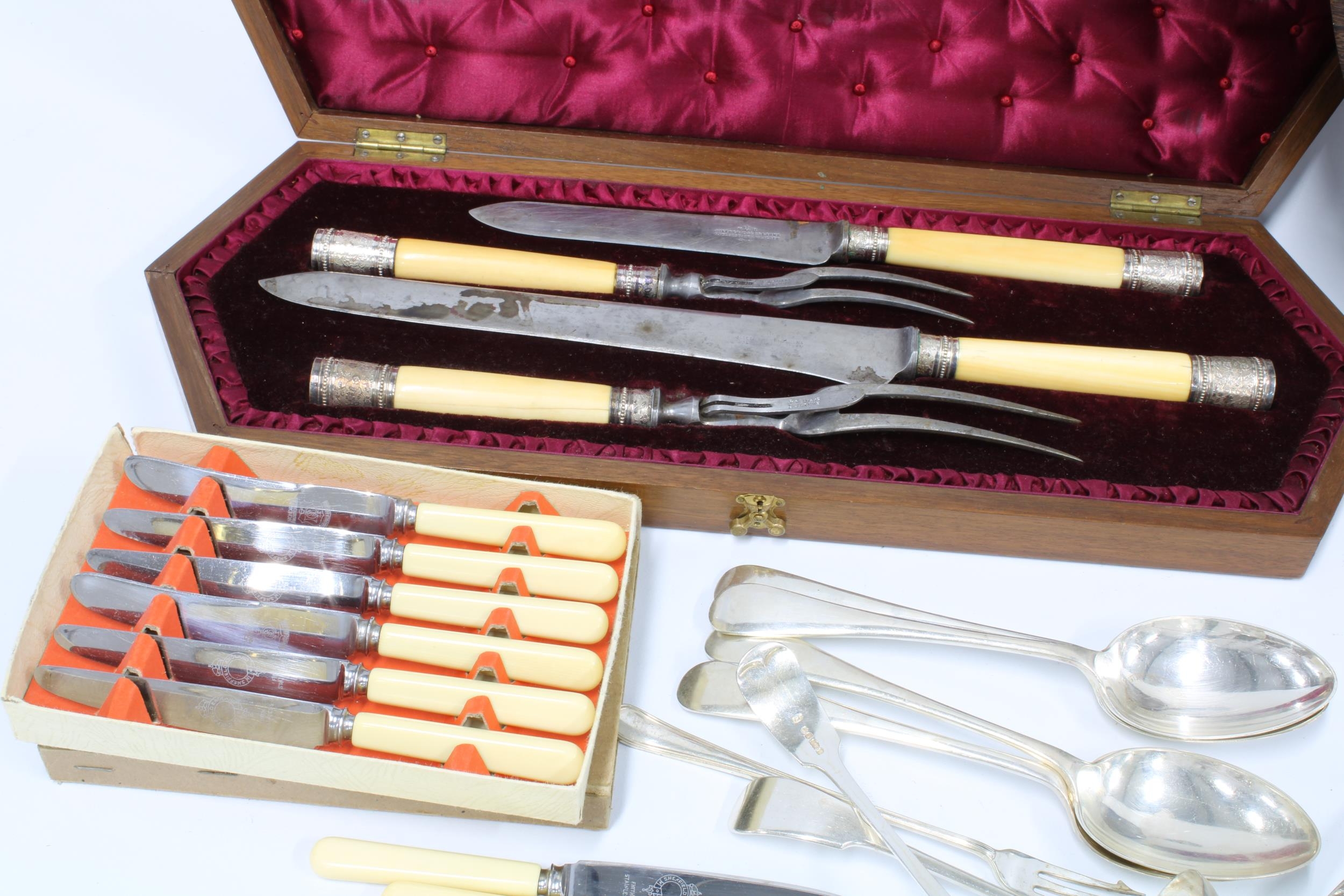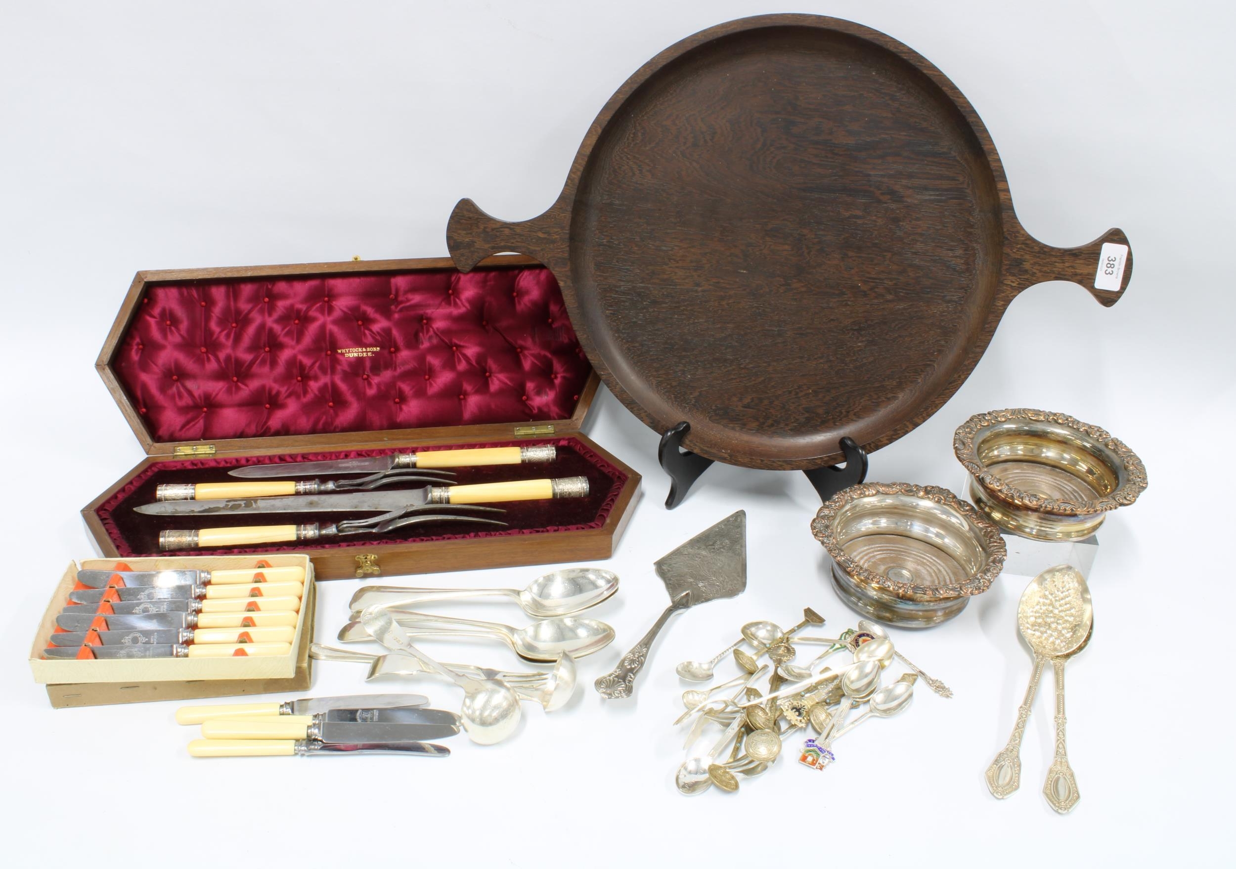 Mixed lot to include a pair of silver plate on copper wine coasters, wooden tray, four piece carving set with composite handles, Epns berry spoons and other flatware together with a small collection of souvenir teaspoons, etc (a lot)