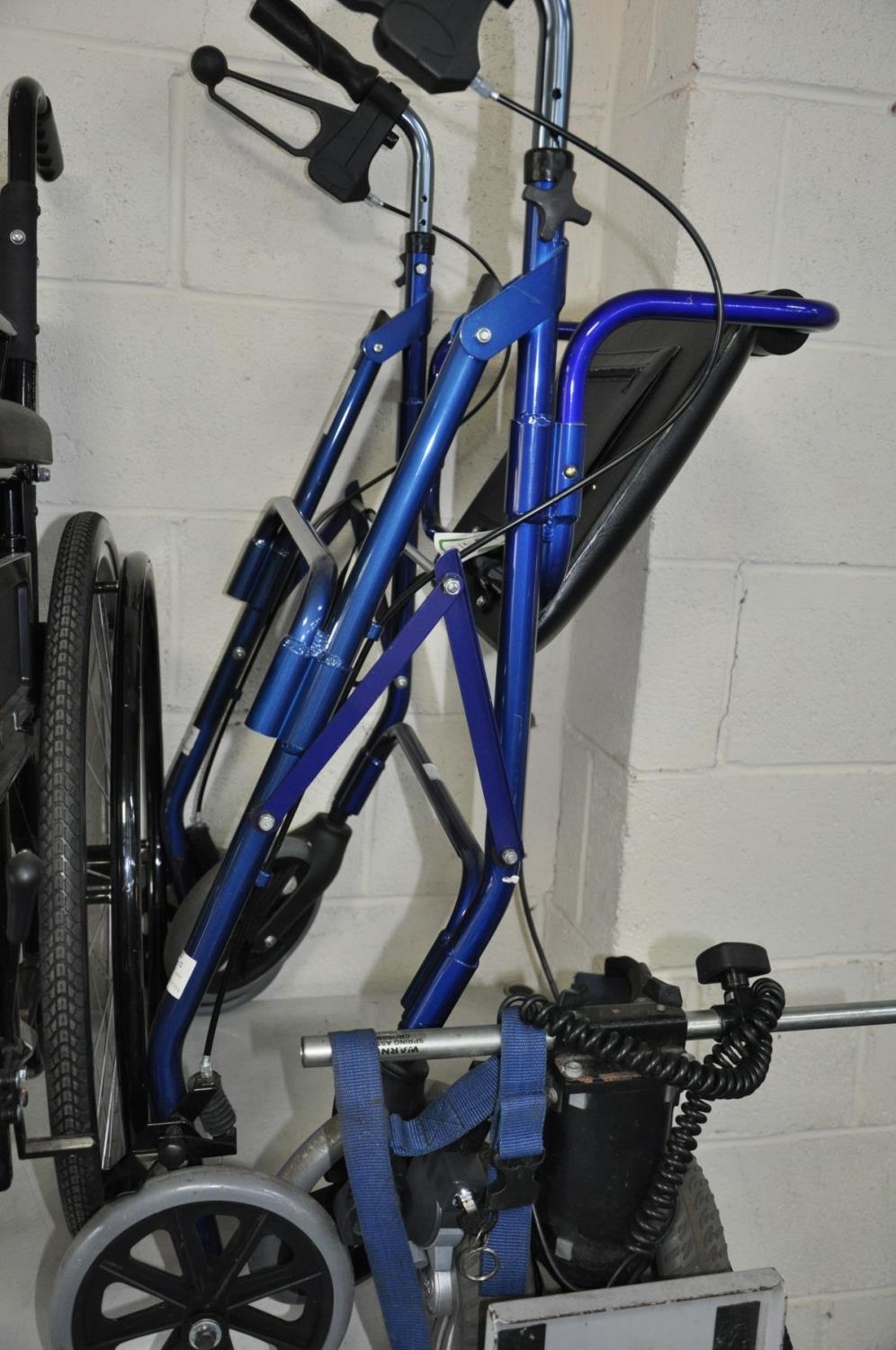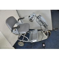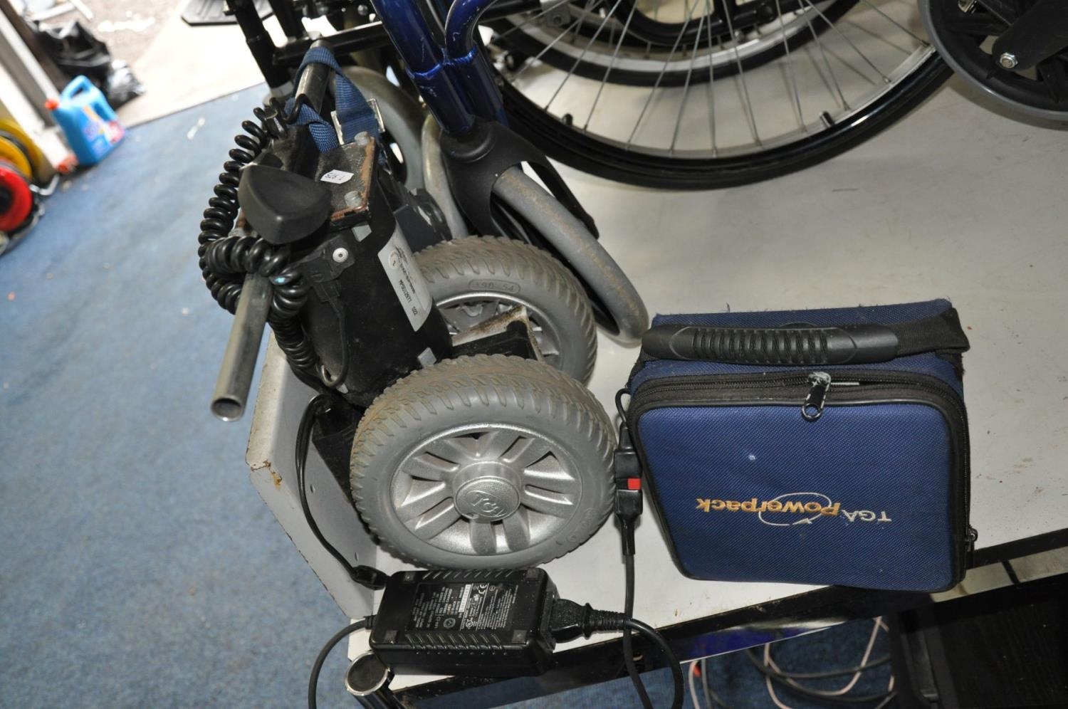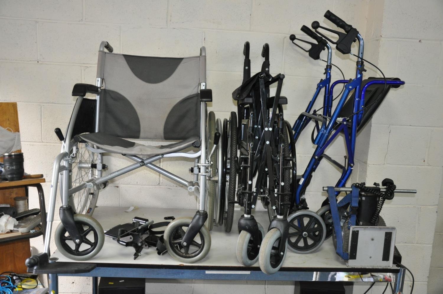 AN ENIGMA FOLDING WHEELCHAIR (missing one footrest), another folding wheelchair, a Disability walker and a Powertec wheelchair converter with charger and one battery (PAT pass and ?????)