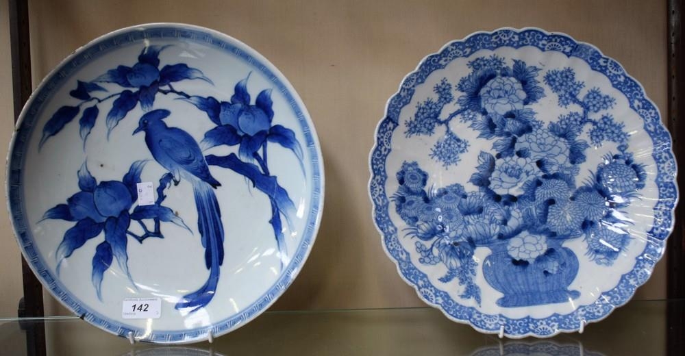 A late 19th century Oriental plate, bird on branch; another, similar, Prunus and Chrysanthemums (2)