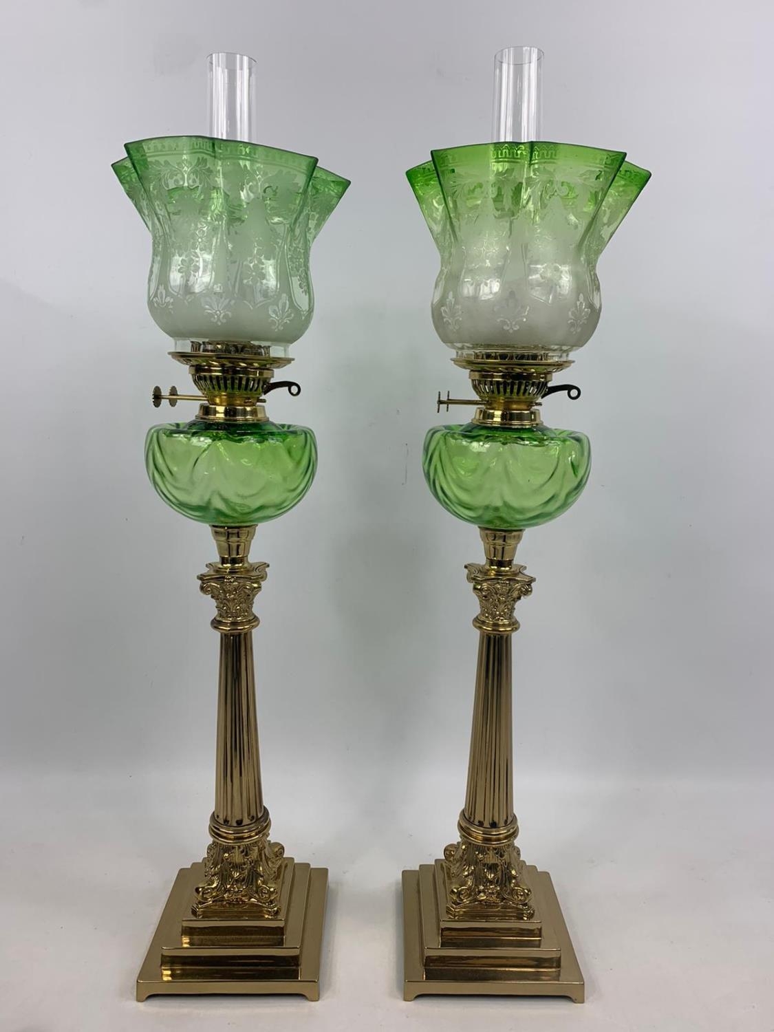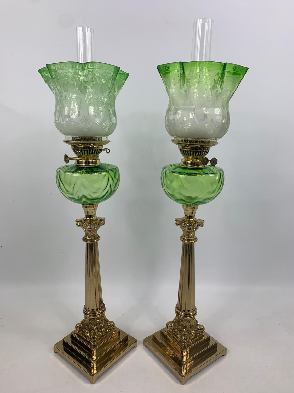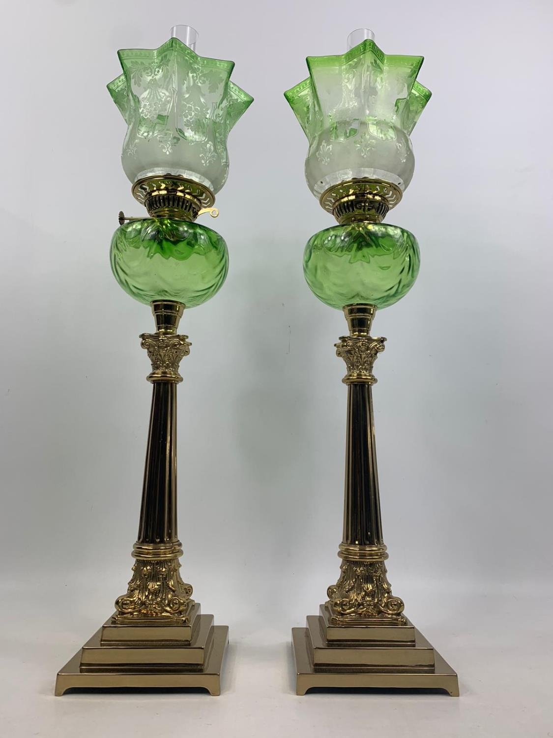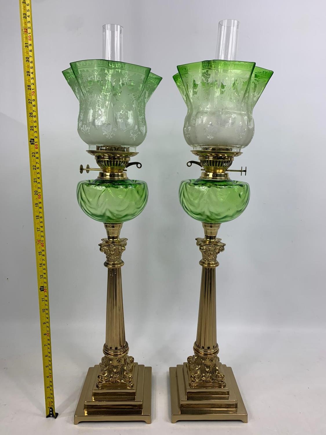 Pair of tall Victorian style oil lamps with Corinthian style pillars, 84cm