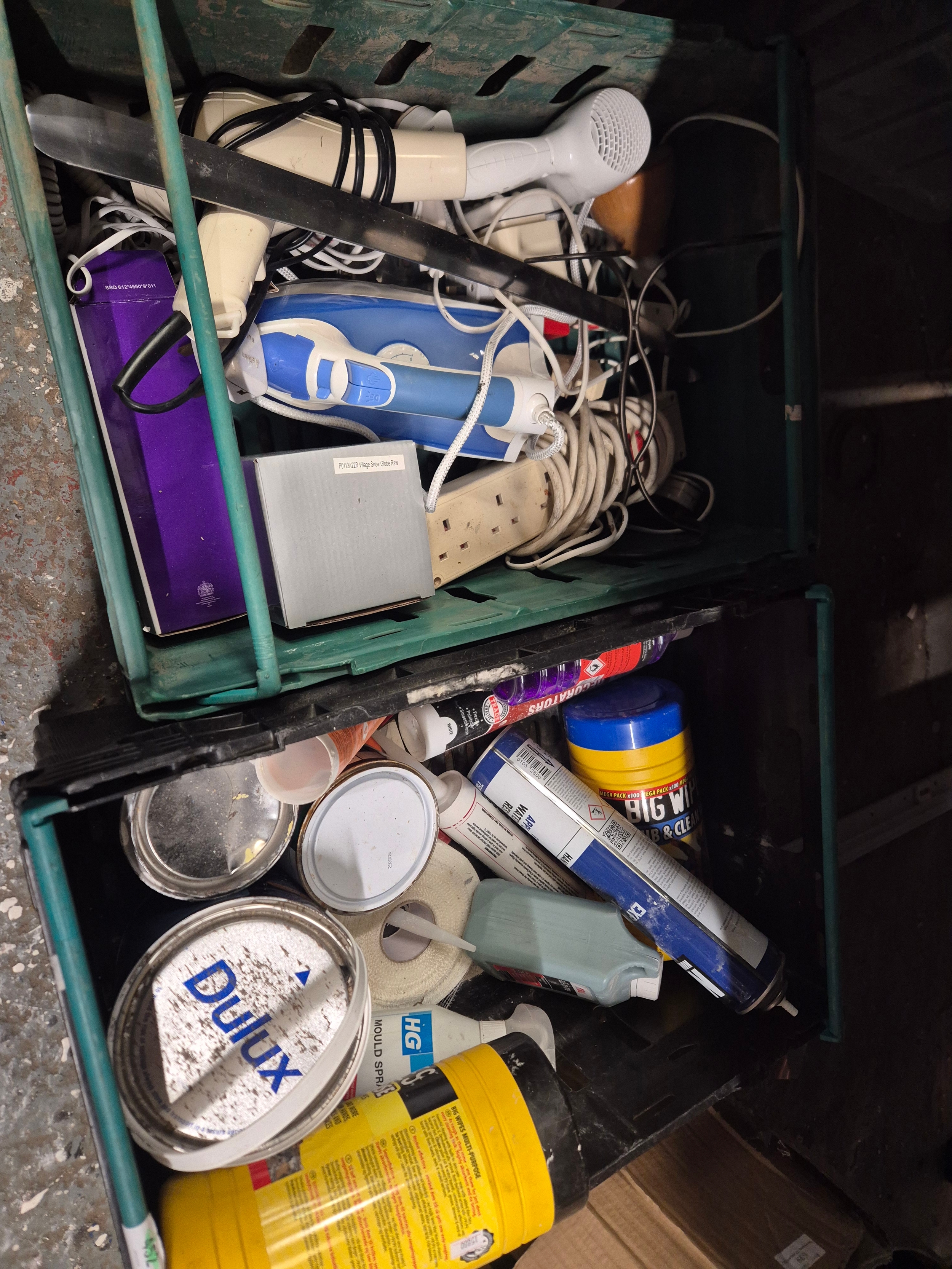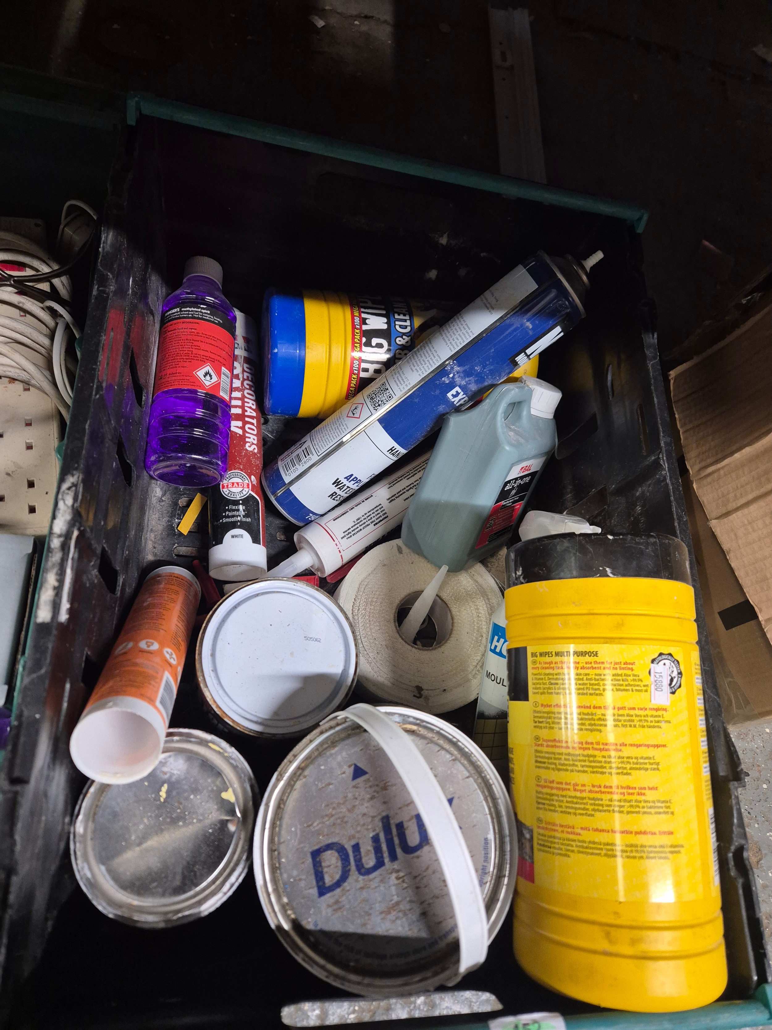 2 trays of paint, DIY and electricals (crates not included)