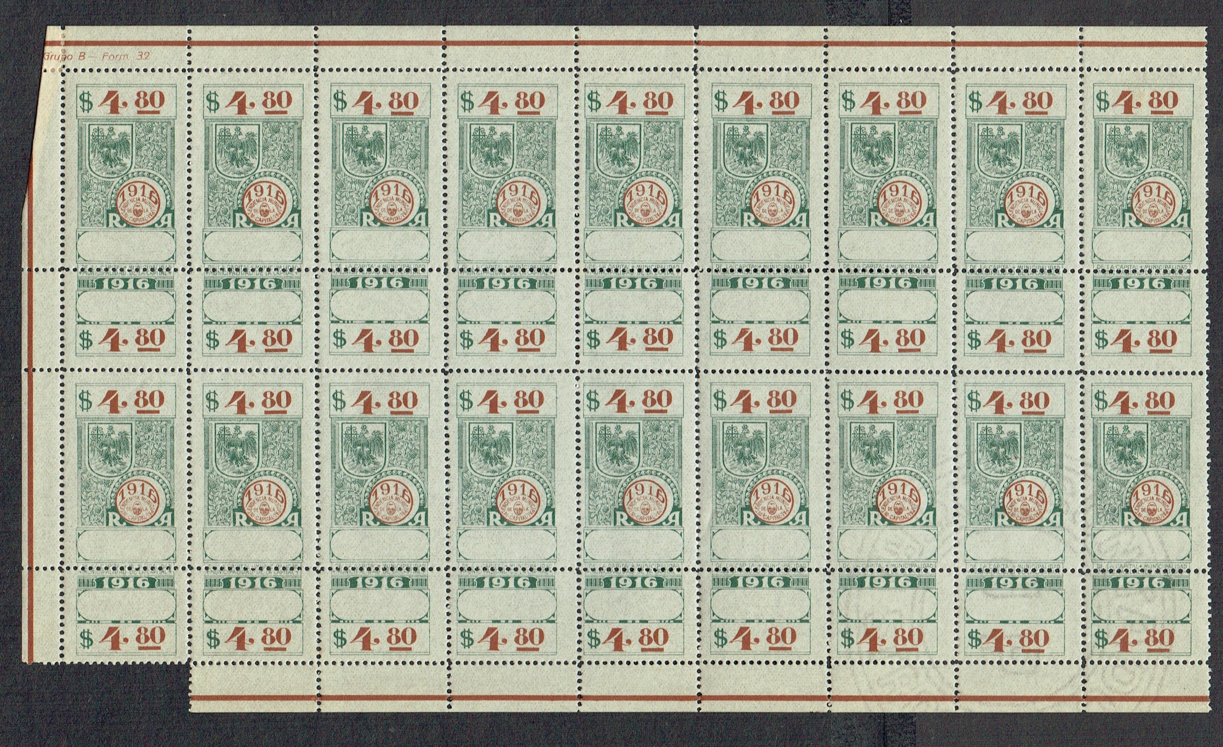 REVENUES & CINDERELLA - Argentina: 1916 $4.80 Intendencia Municipal de la Capital Unused in brown and green in a watermarked sheet of 18. Missing margin at left. Scarce block.