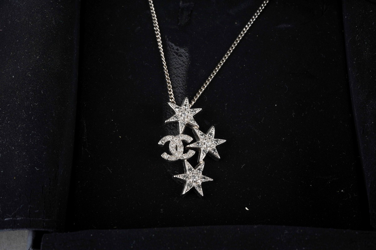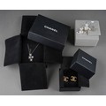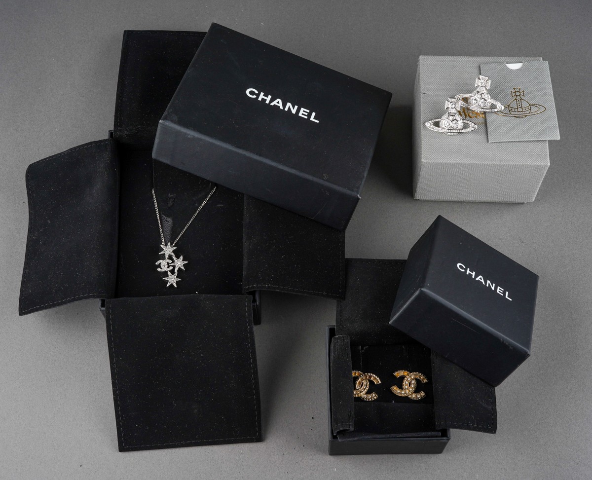 A collection of designer items to include Vivienne Westwood and Chanel. Each with designer case. Necklace AF.