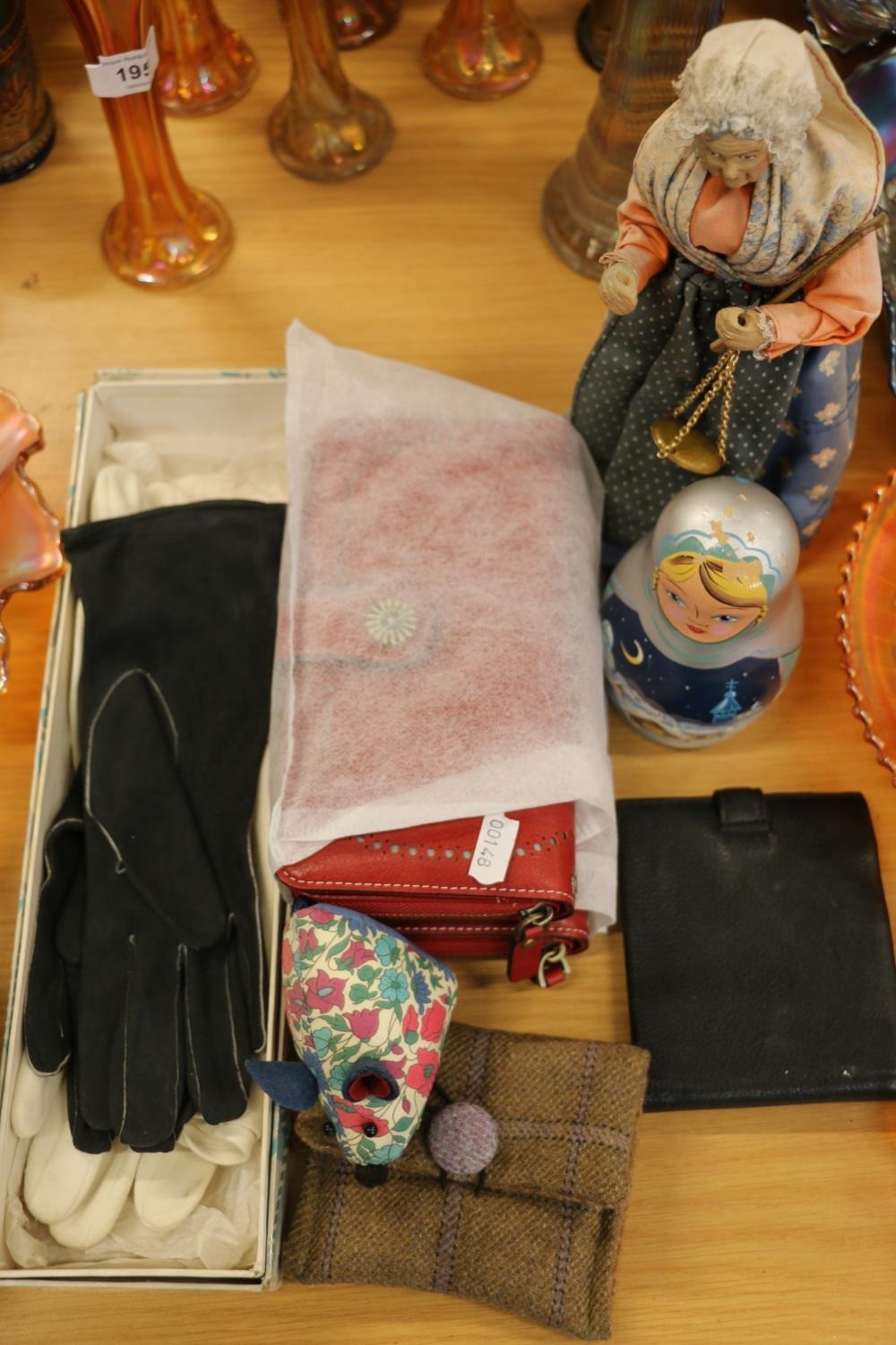 Russian doll, old model of a grandmother, purses, gloves, etc.