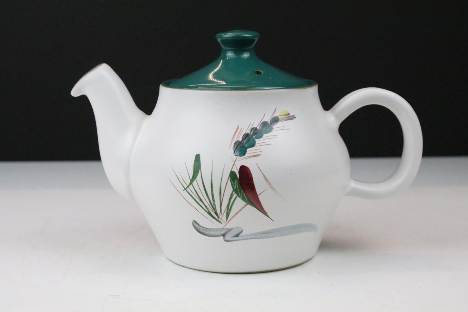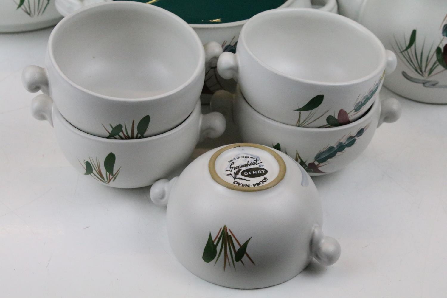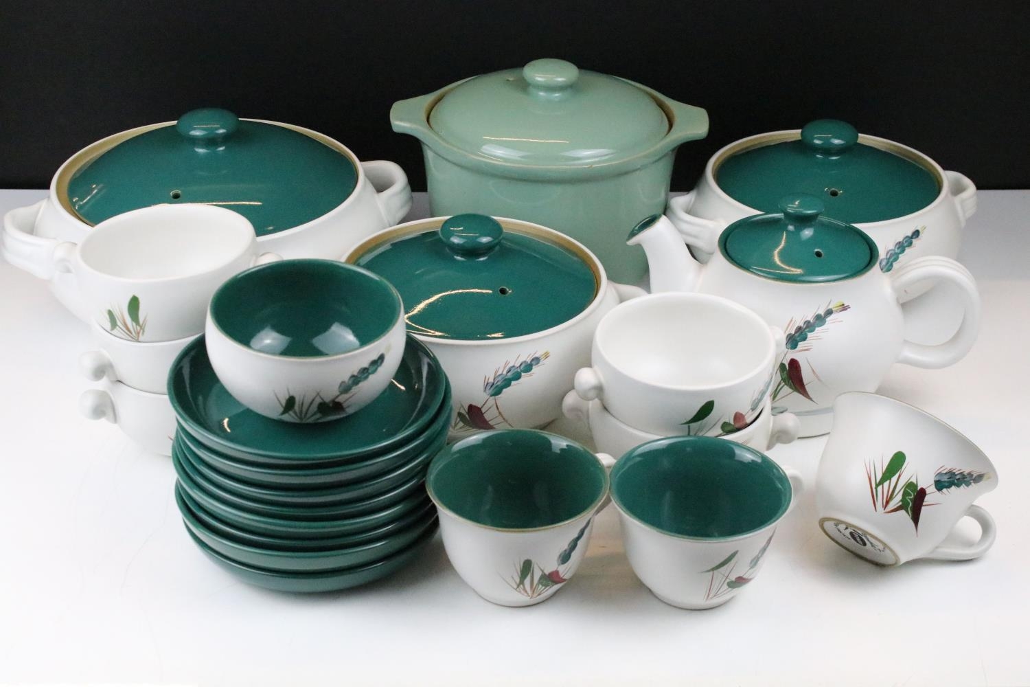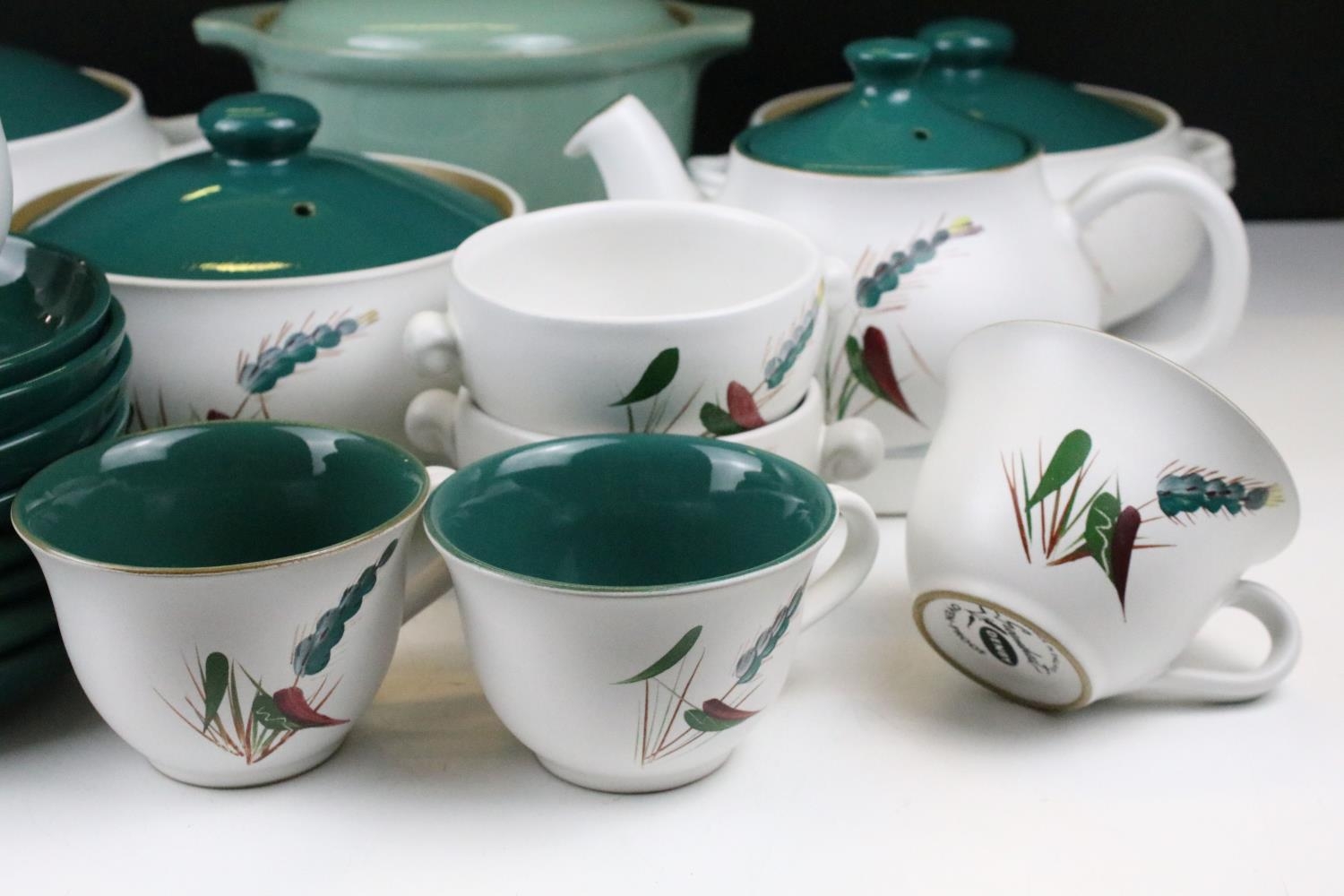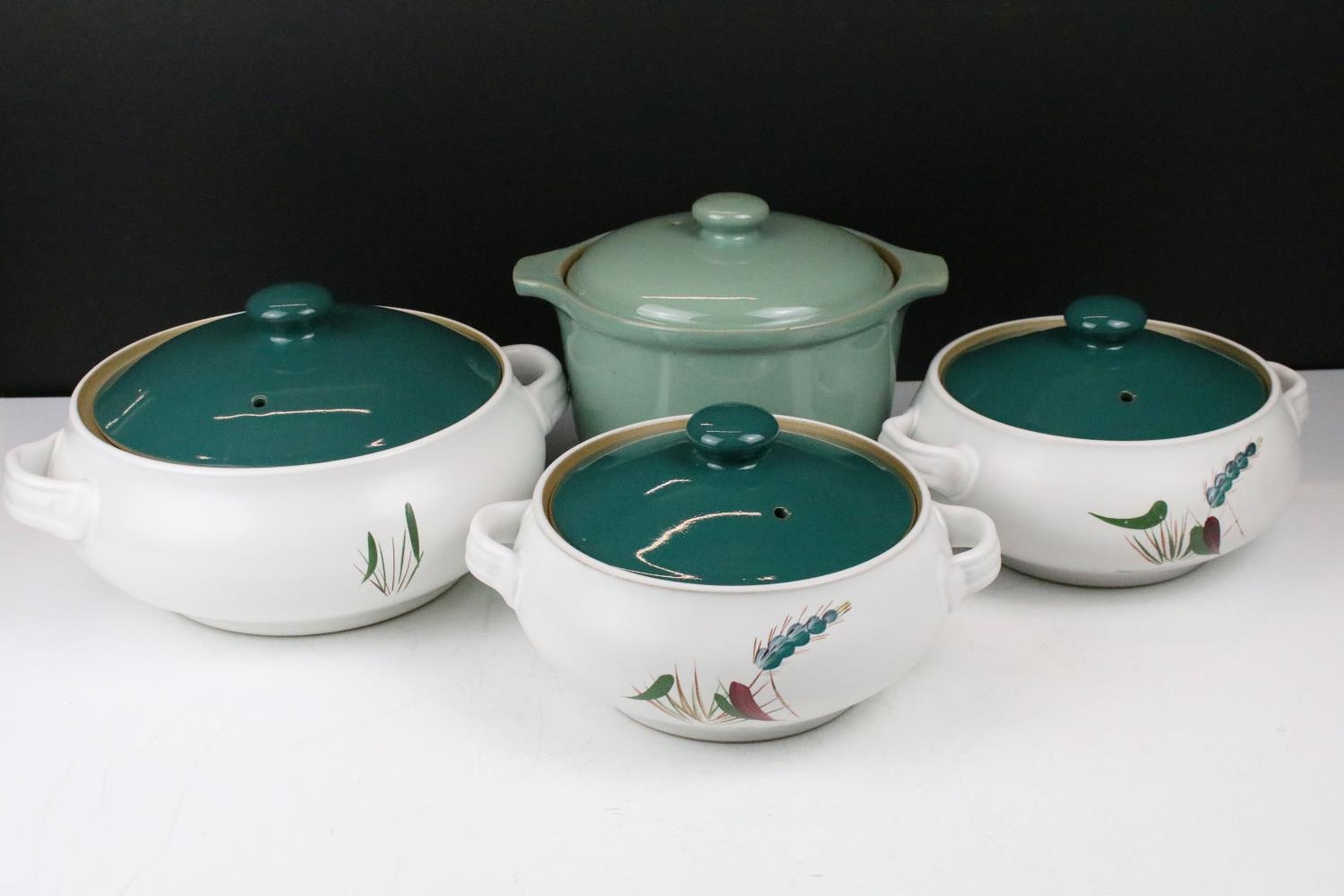Denby 'Greenwheat' pattern ceramics to include a tea set and tureens, plus a Denby green glazed covered dish. (2)