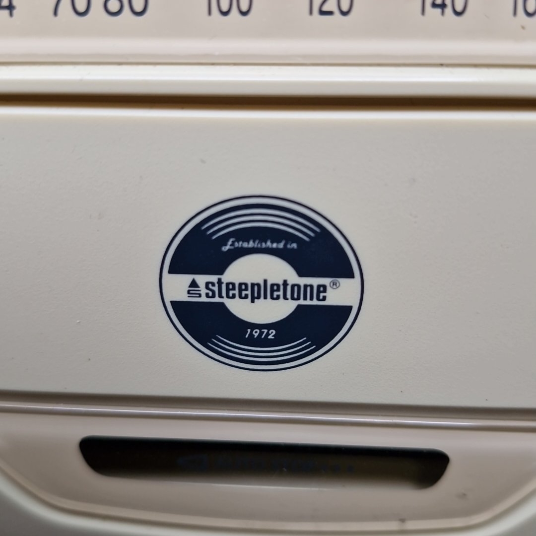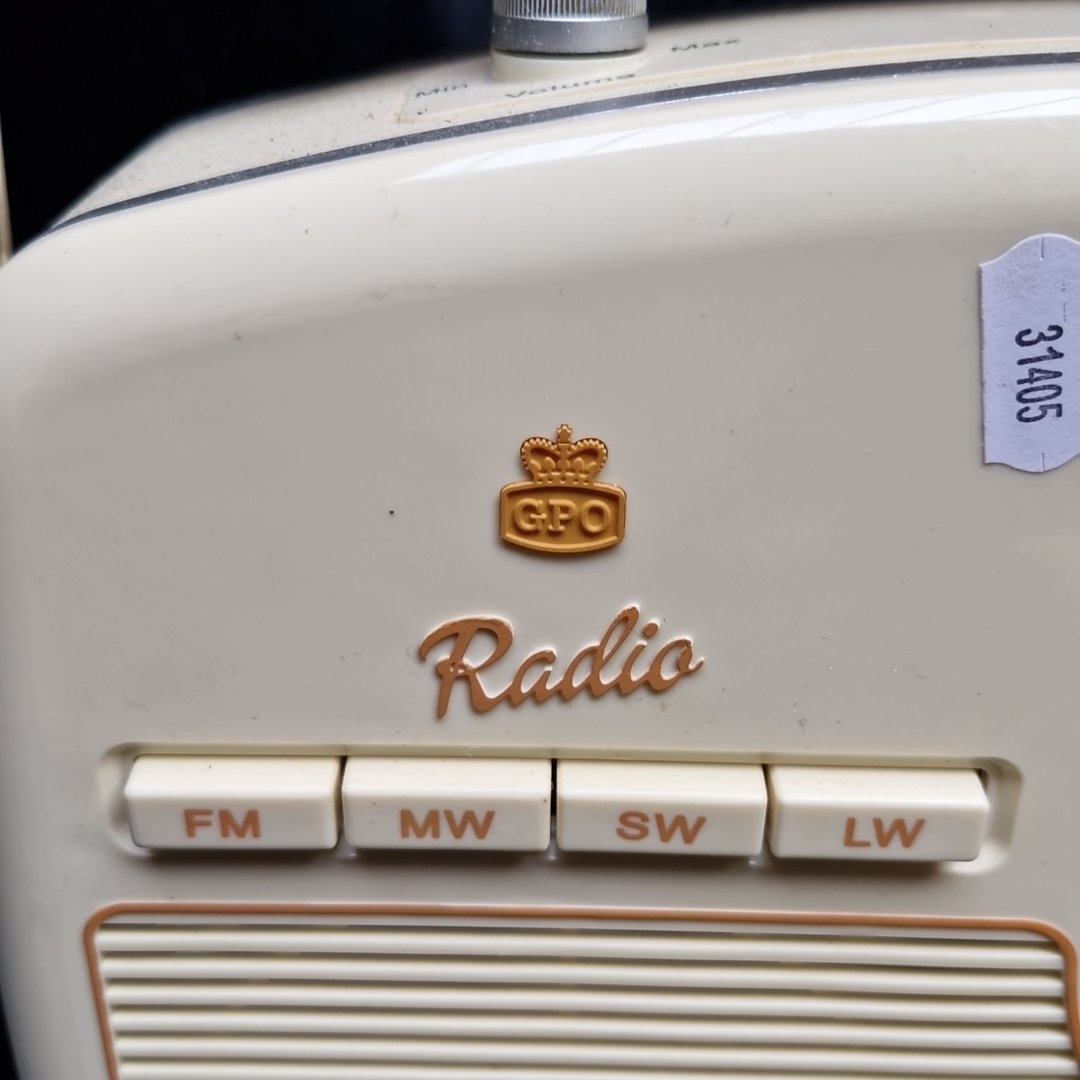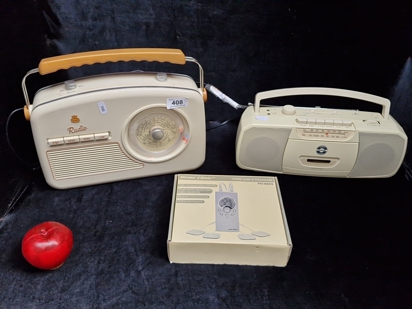 A group of domestic electronics, comprising a GPO Radio portable multi-band set with carry handle, a Steepletone portable radio/cassette player, and a boxed Home Clinic TENS unit, model HV-6605.