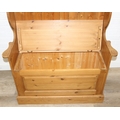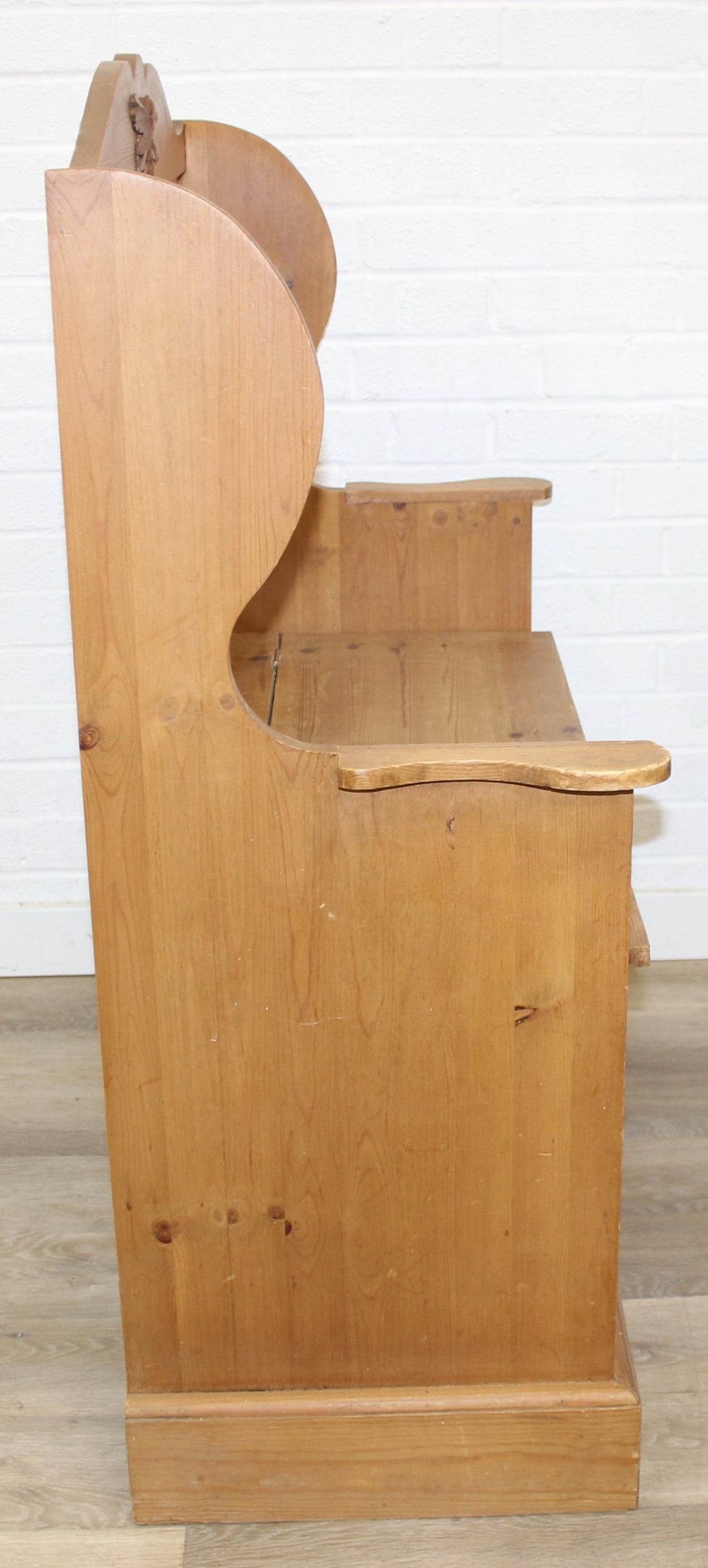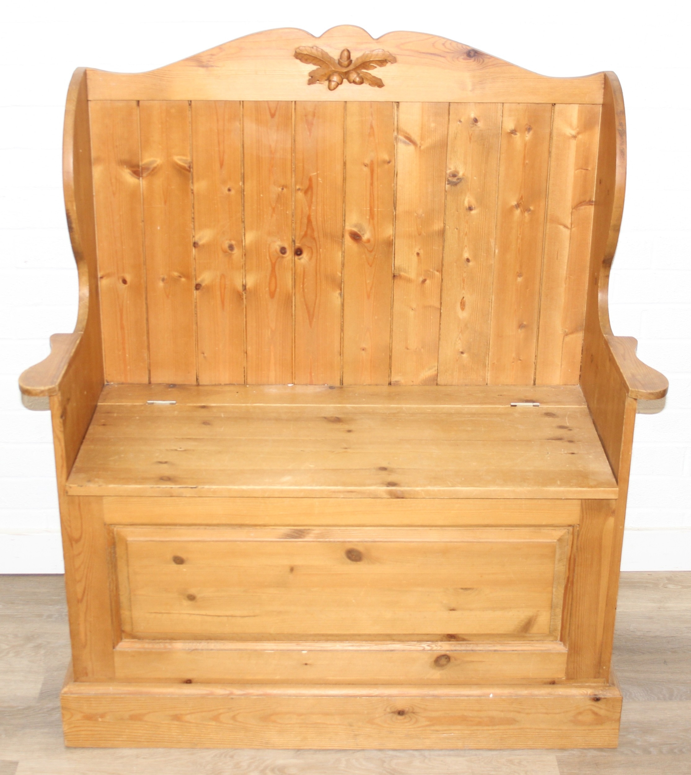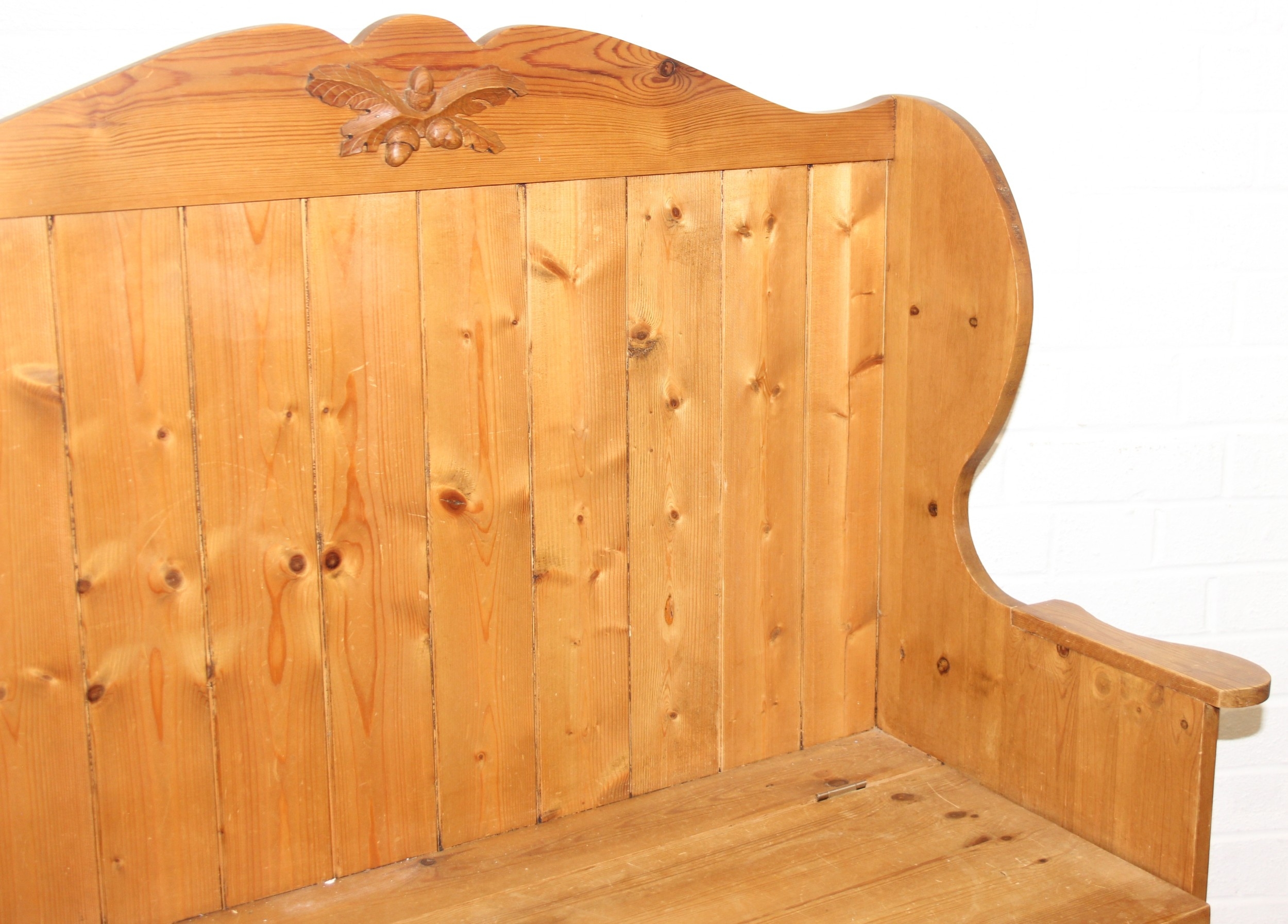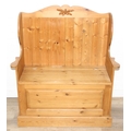 A vintage pine settle or hall seat with storage box seat, carved details, 91cm x 43cm x 109cm