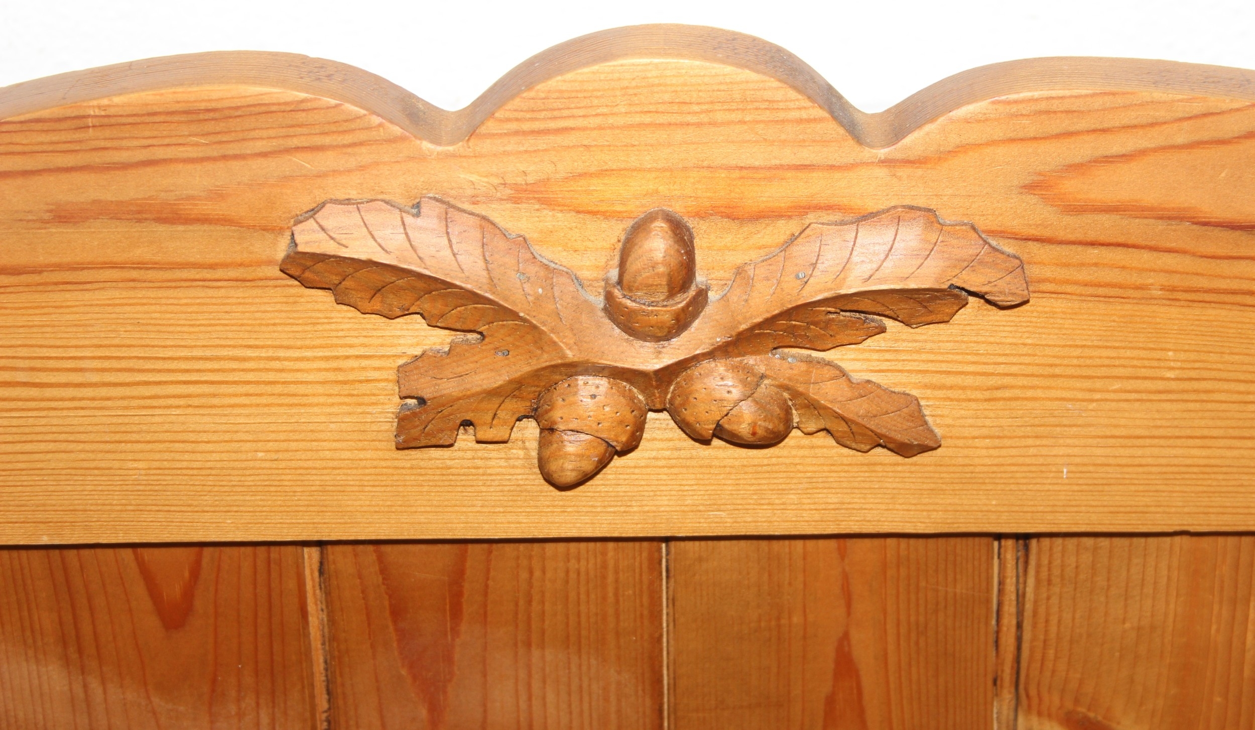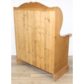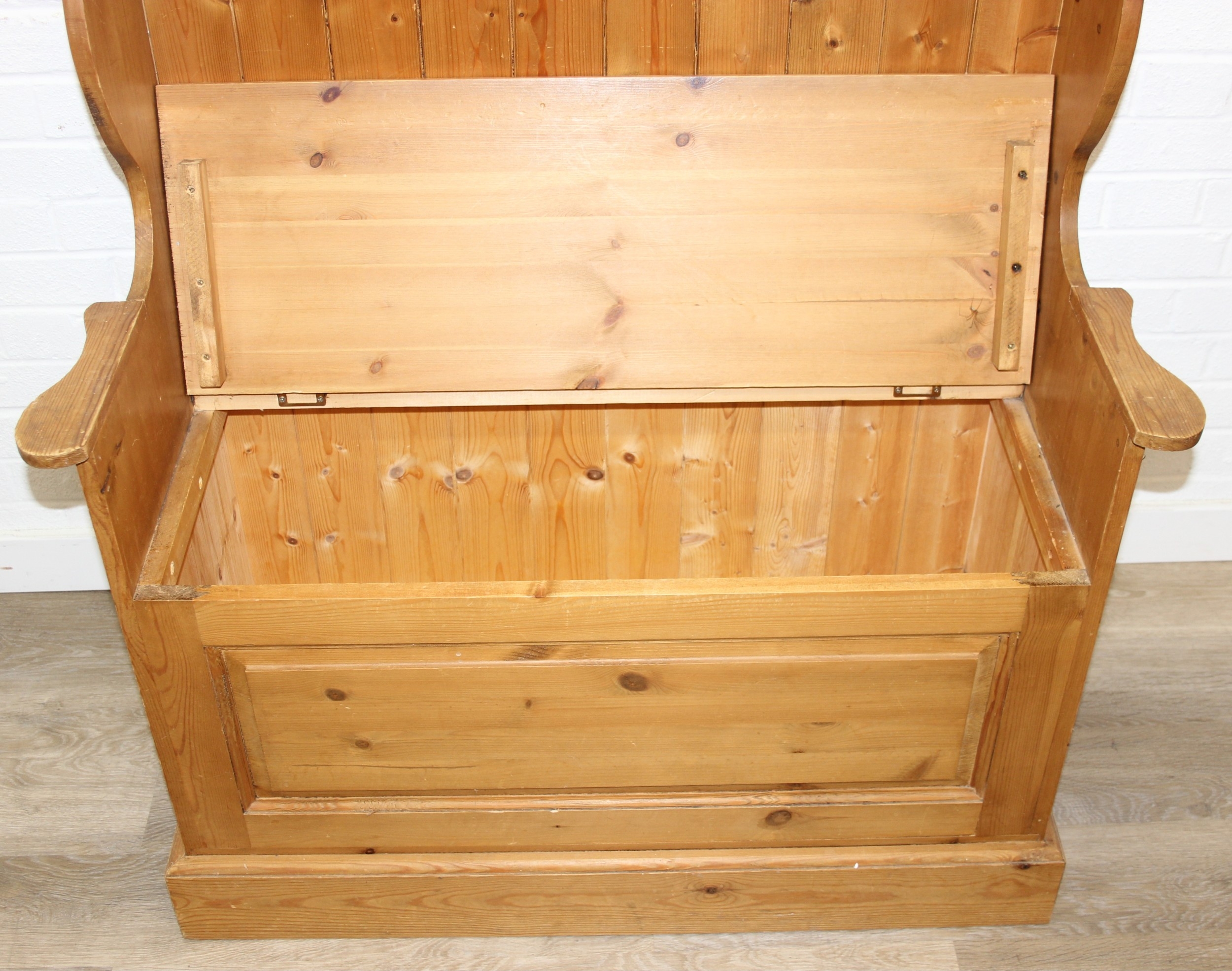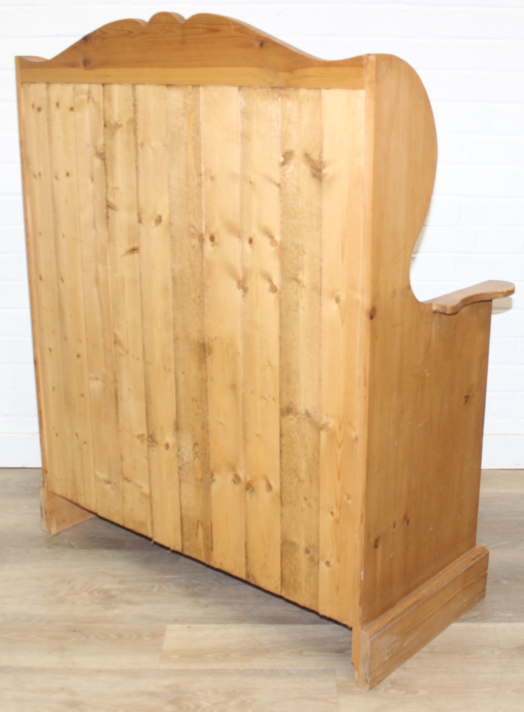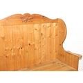 A vintage pine settle or hall seat with storage box seat, carved details, 91cm x 43cm x 109cm