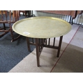 Brass top coffee table on Oak base. Top engravings depicting scenes from Egyptian Mythology. H:51cm, Diameter top: 68cm.