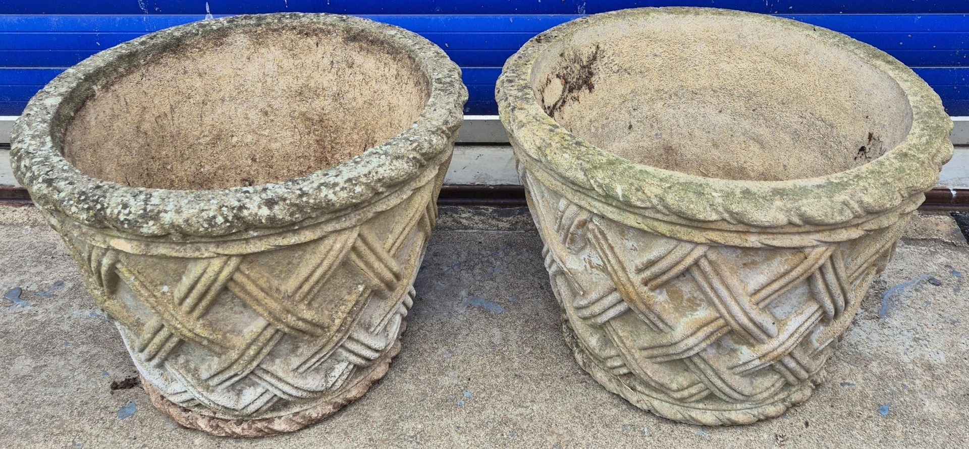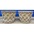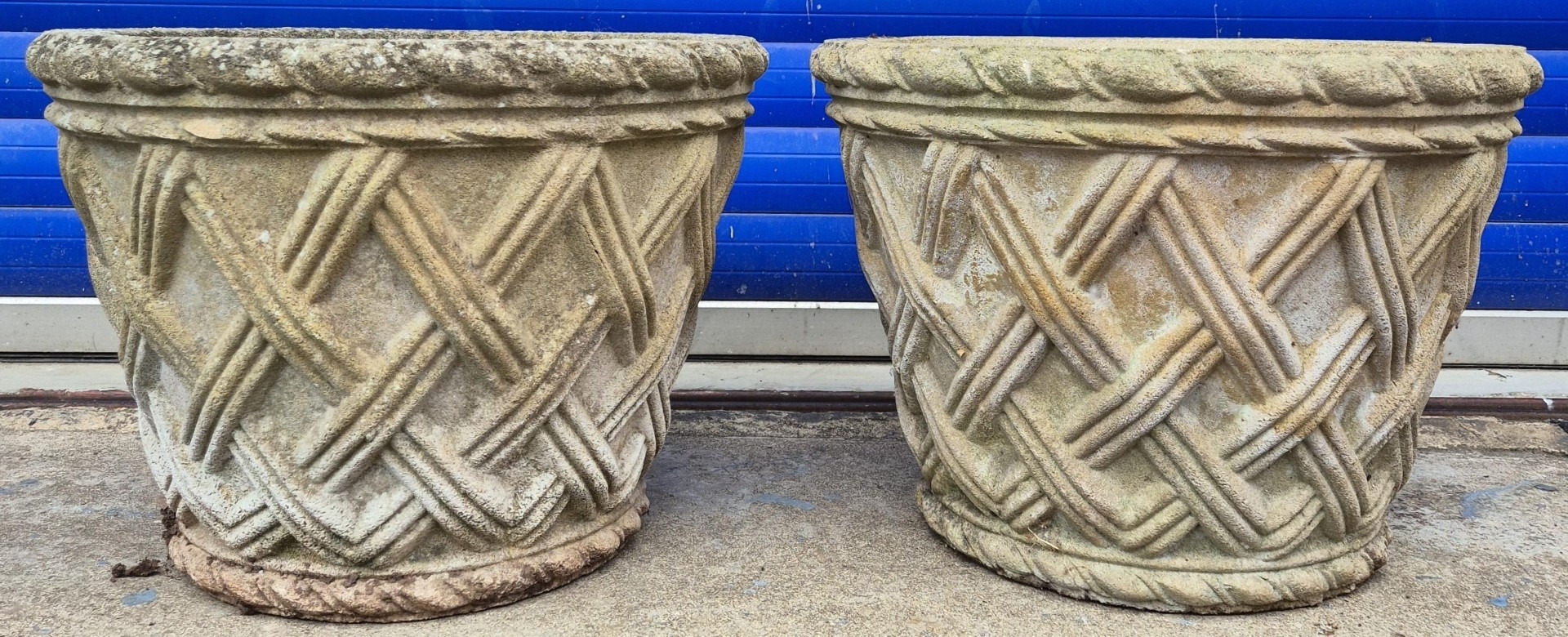 Pair of lattice design stone garden planters. Dimensions(cm) H32, W42, D42.