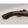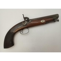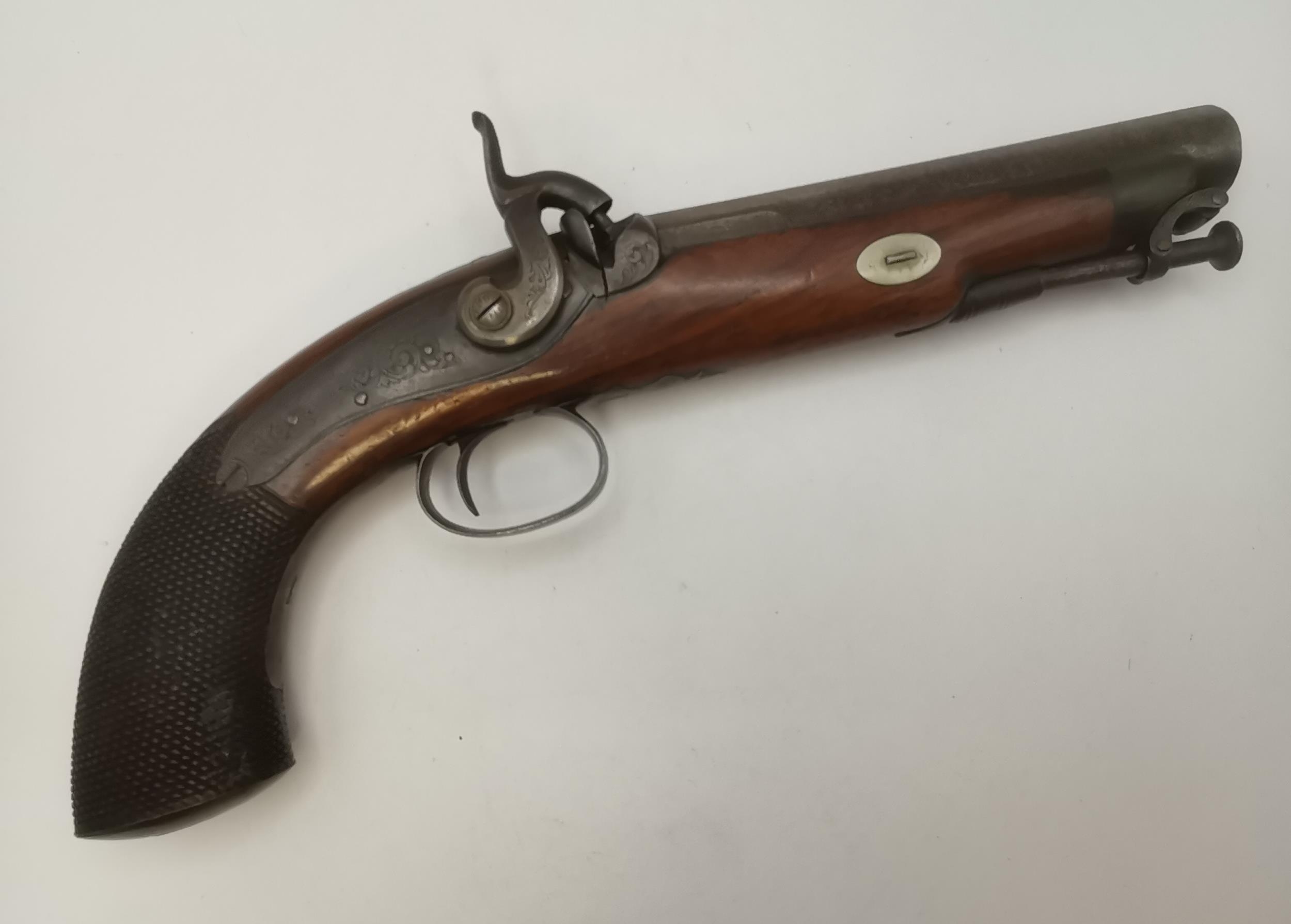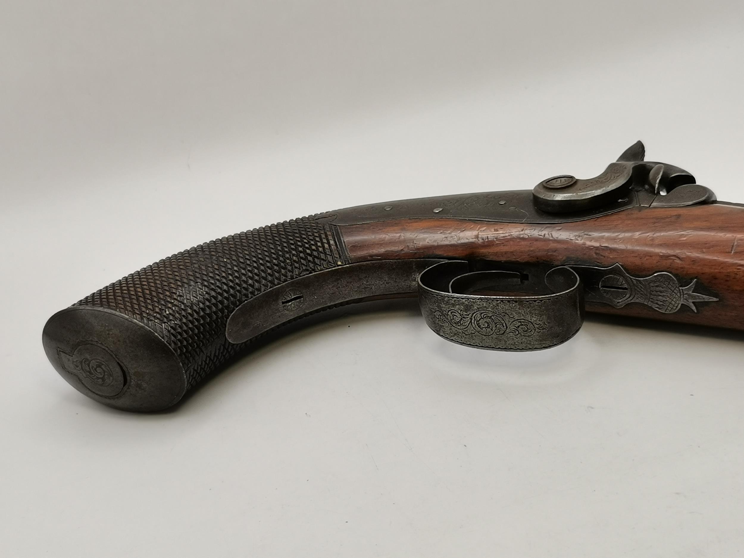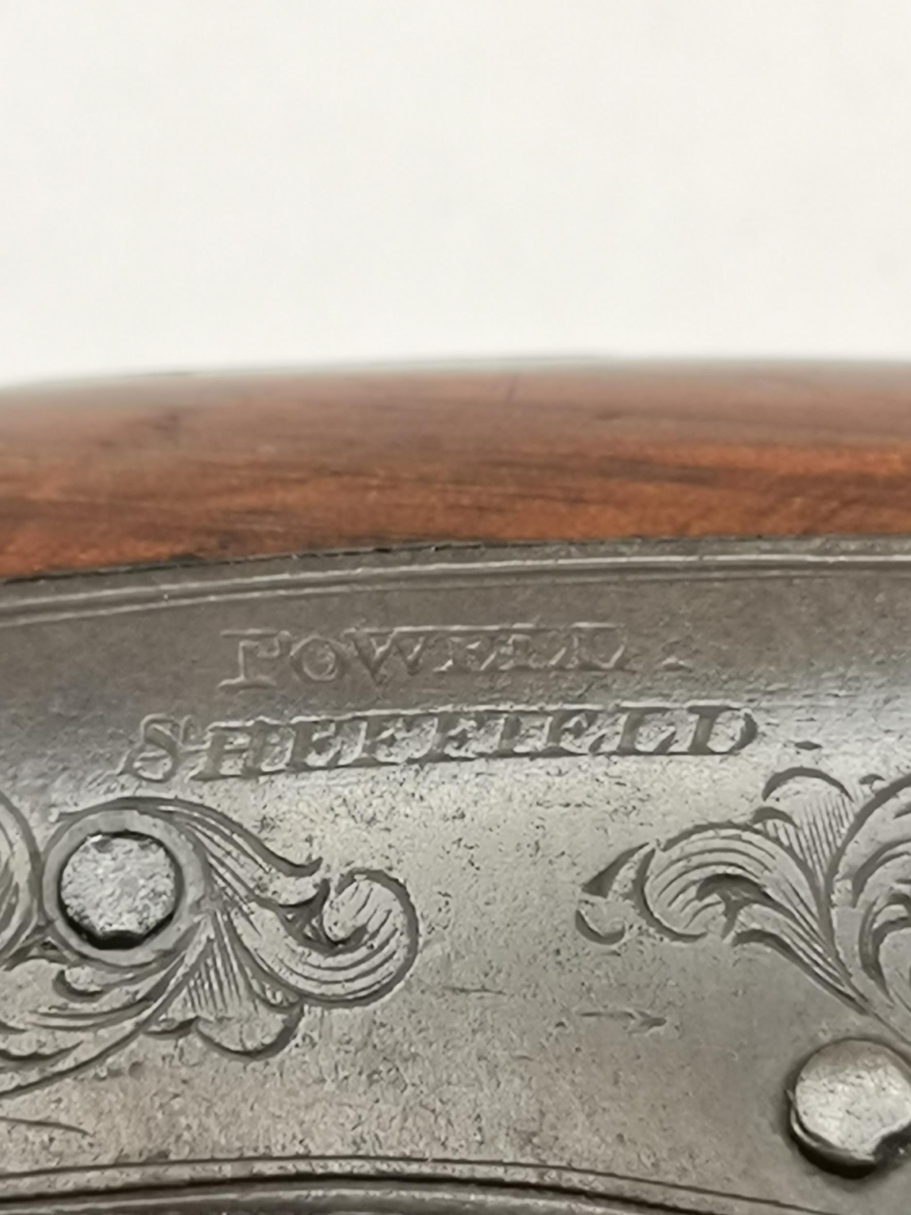 A 19th Century percussion travelling pistol, signed POWELL SHEFFIELD to lockplate, with scrolling foliate engraving to hammer, breech, lockplate and trigger guard, with pineapple finial, the 6½" round barrel with flattened top edge with silver line at the false breech and with brass bead fore-sight, the walnut stock with chequered grip, the steel butt plate with central hinged cover, vacant rectangular cartouche with canted corners to top of stock, with steel ramrod pipe and swivel ramrod. 31cm long overall