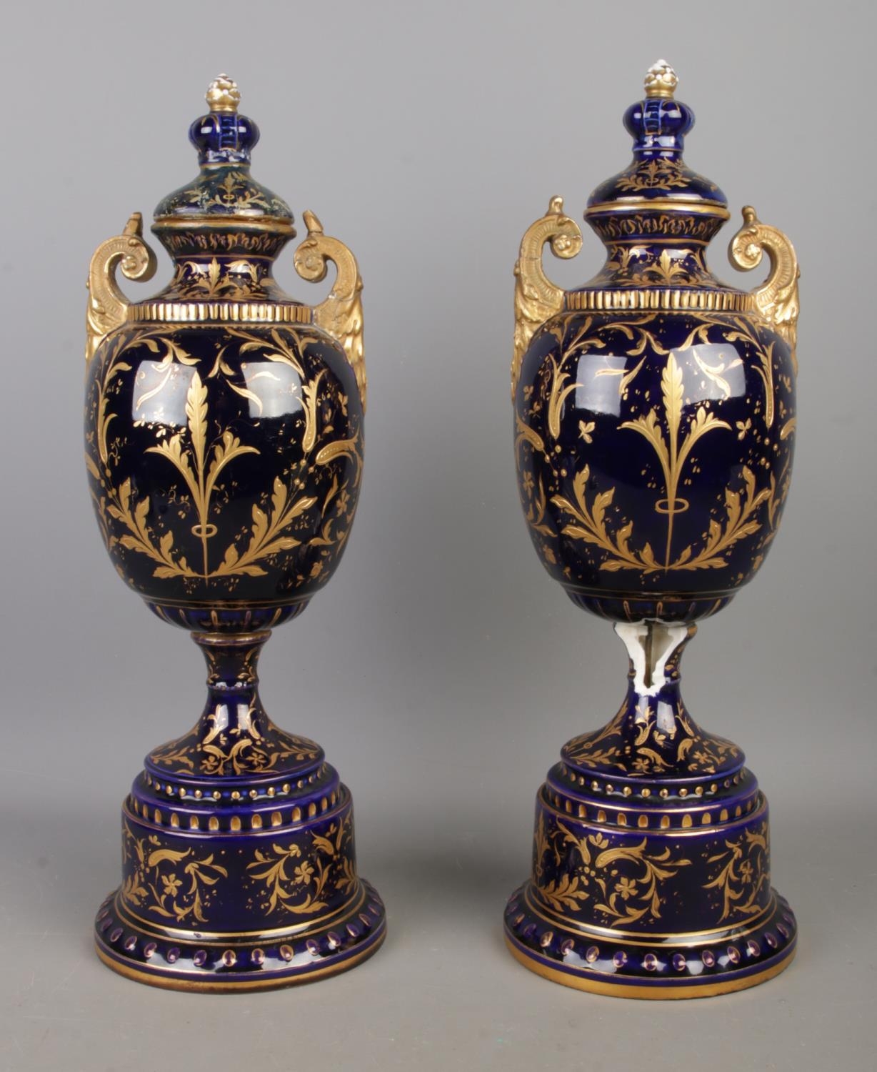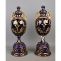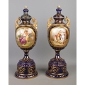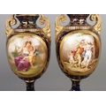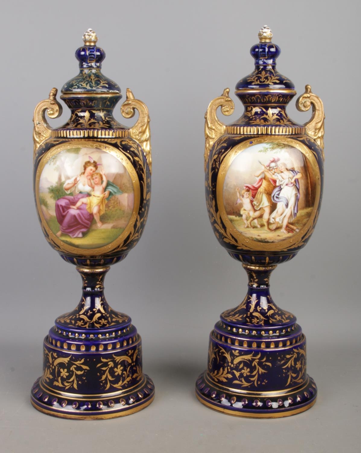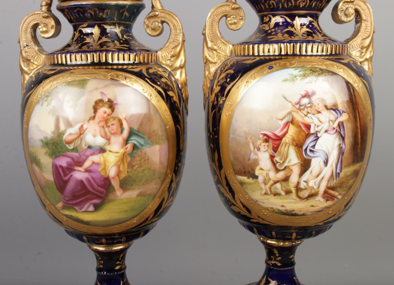 A pair of early Twentieth Century Austrian twin handled lidded urns, in cobalt blue with gilt highlights and hand painted plaques to the body. earing inscriptions to the bases for 'Rinaldo and Armida' and 'Des Junges Virgil In Genesis, (The Birth of Shakespeare)'. Bearing Bindenschild mark and 'AUSTRIA' to the base. Height: 42cm.