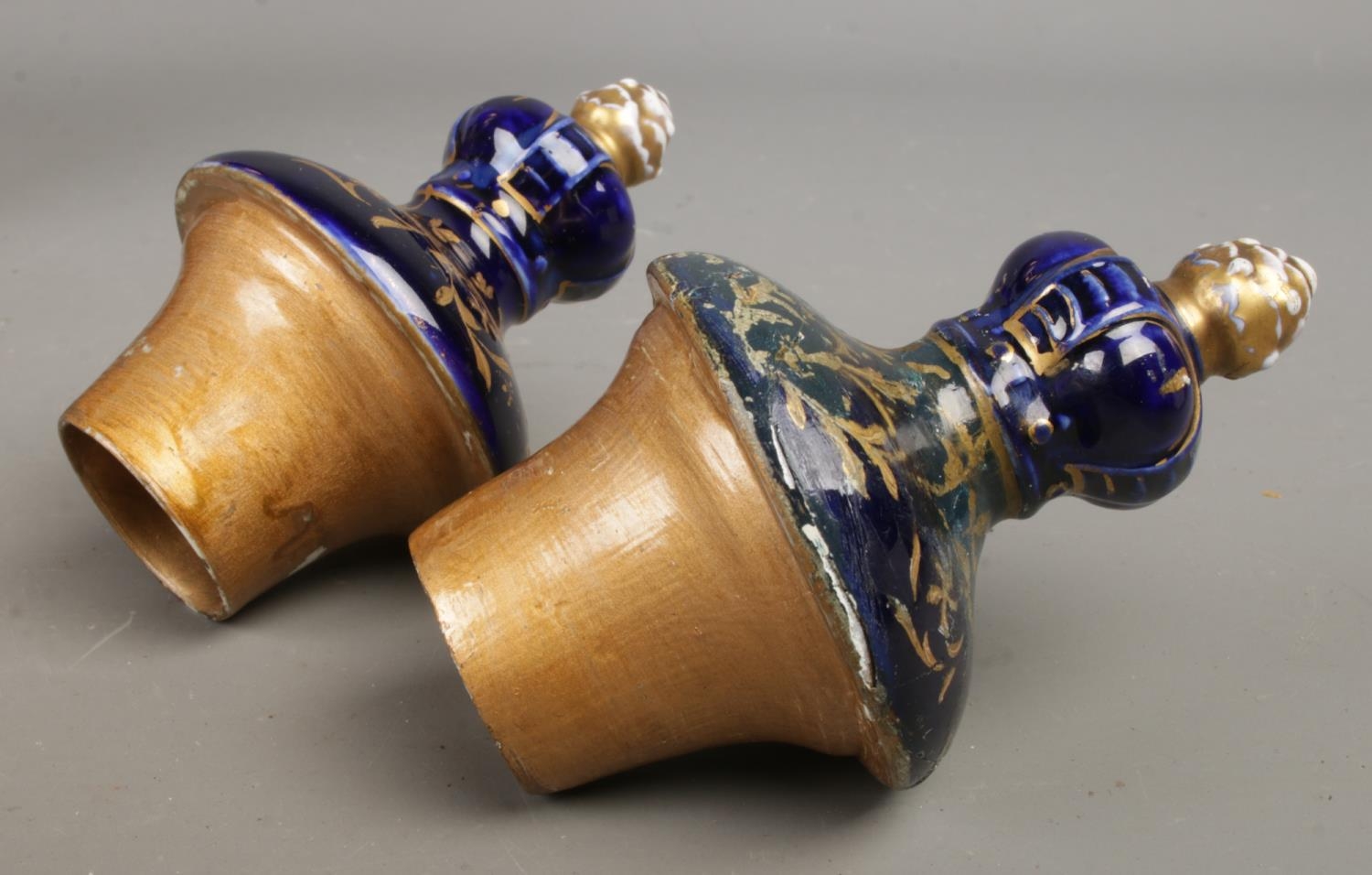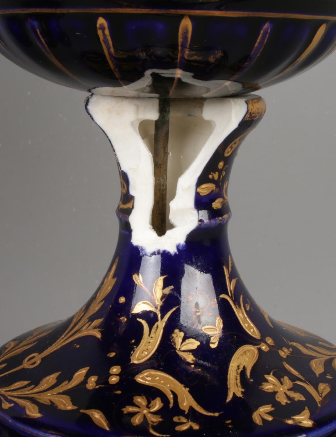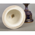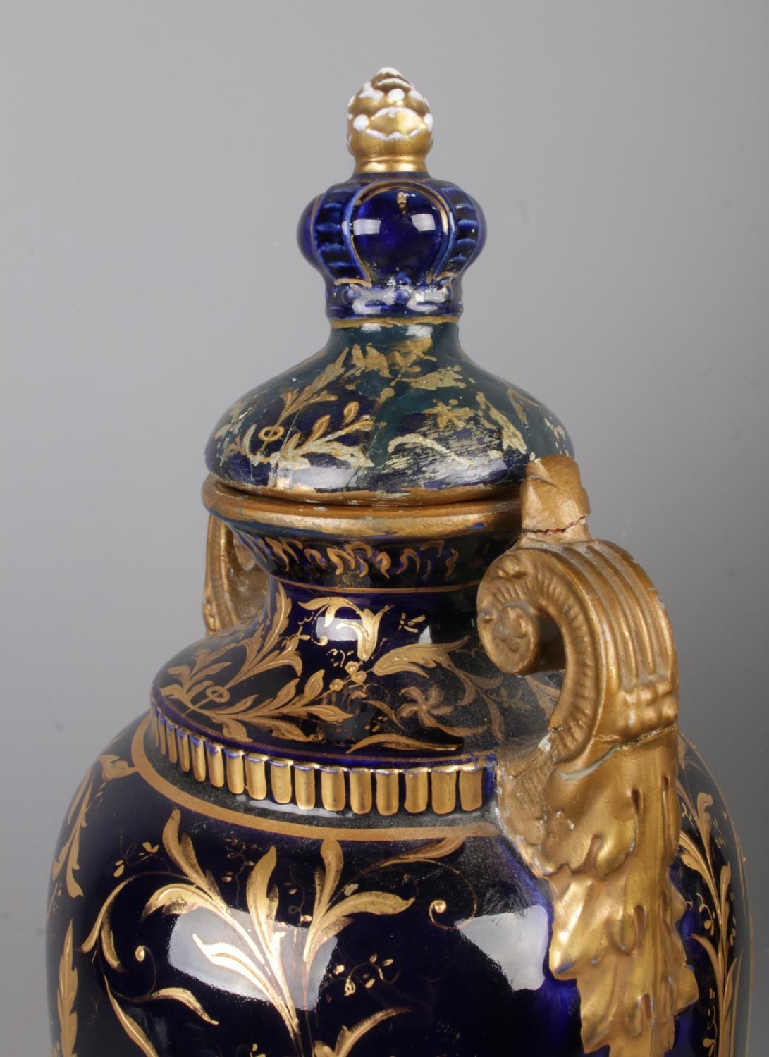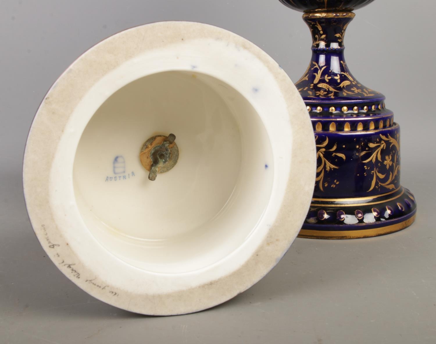 A pair of early Twentieth Century Austrian twin handled lidded urns, in cobalt blue with gilt highlights and hand painted plaques to the body. earing inscriptions to the bases for 'Rinaldo and Armida' and 'Des Junges Virgil In Genesis, (The Birth of Shakespeare)'. Bearing Bindenschild mark and 'AUSTRIA' to the base. Height: 42cm.