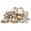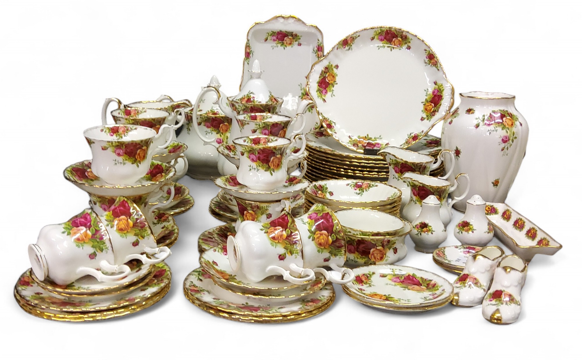 A Royal Albert Old Country Roses dinner, coffee and tea service, for six, comprising ten dinner plates, teacups, coffee cups, saucers, side plates, bread and butter plate, teapot, coffeepot, three graduated jugs, bowls, salt and pepper pot, etc