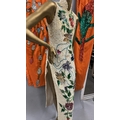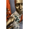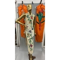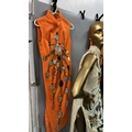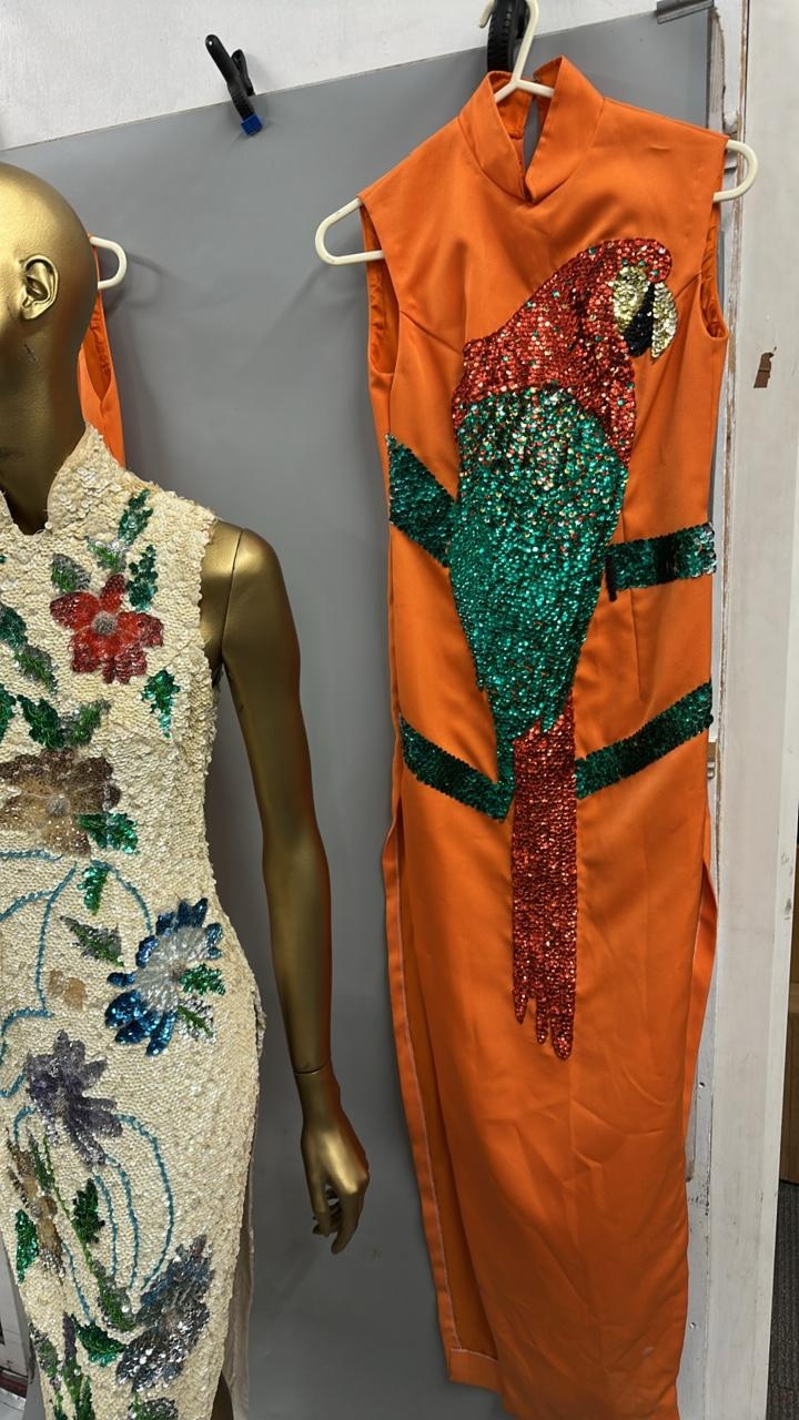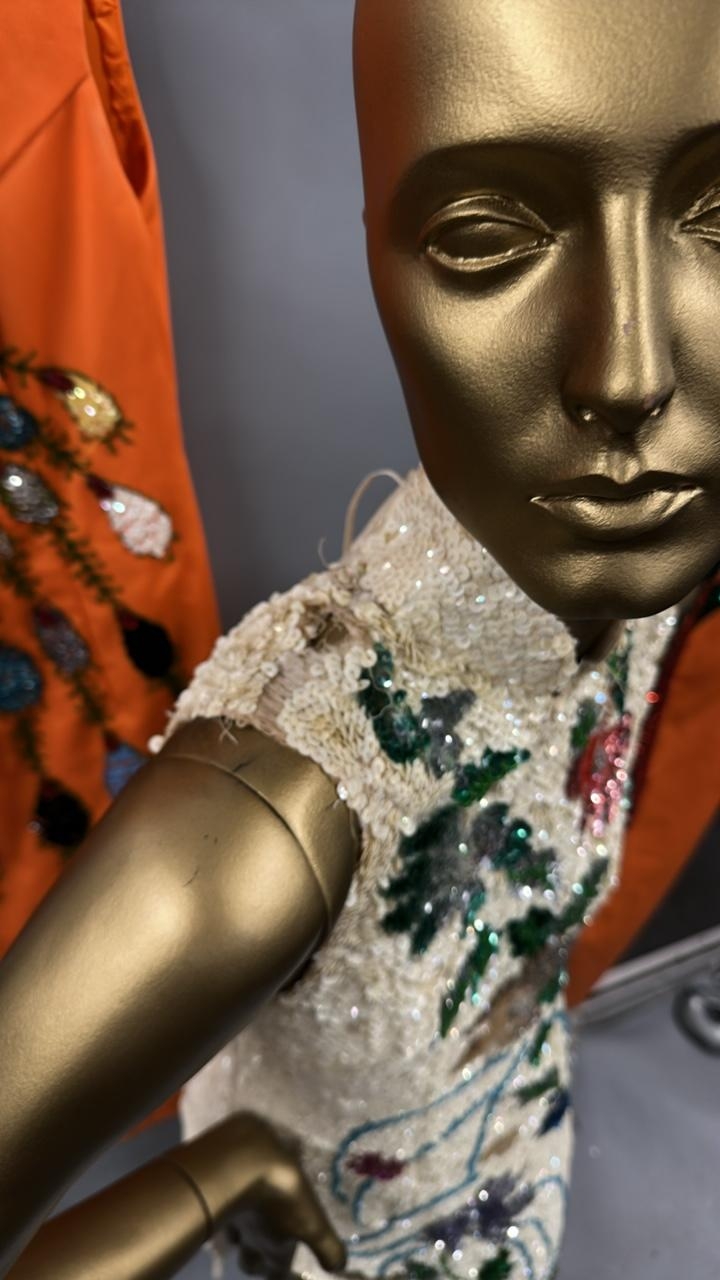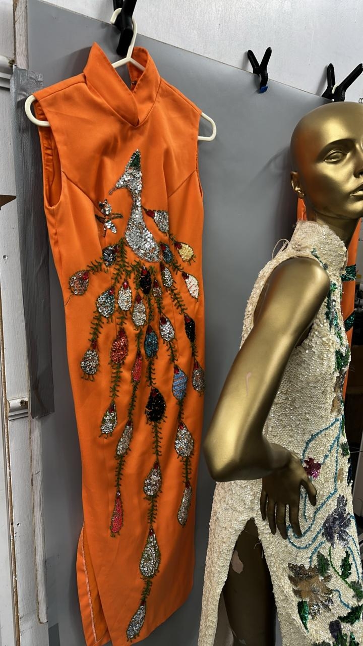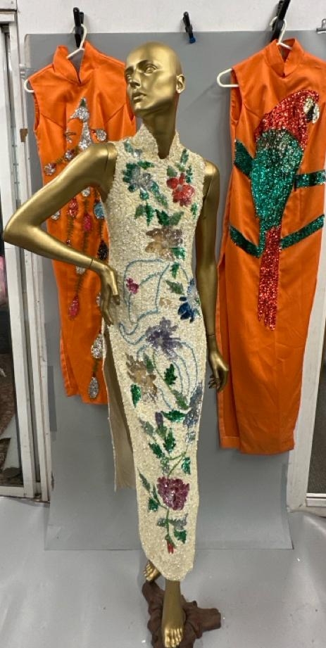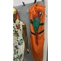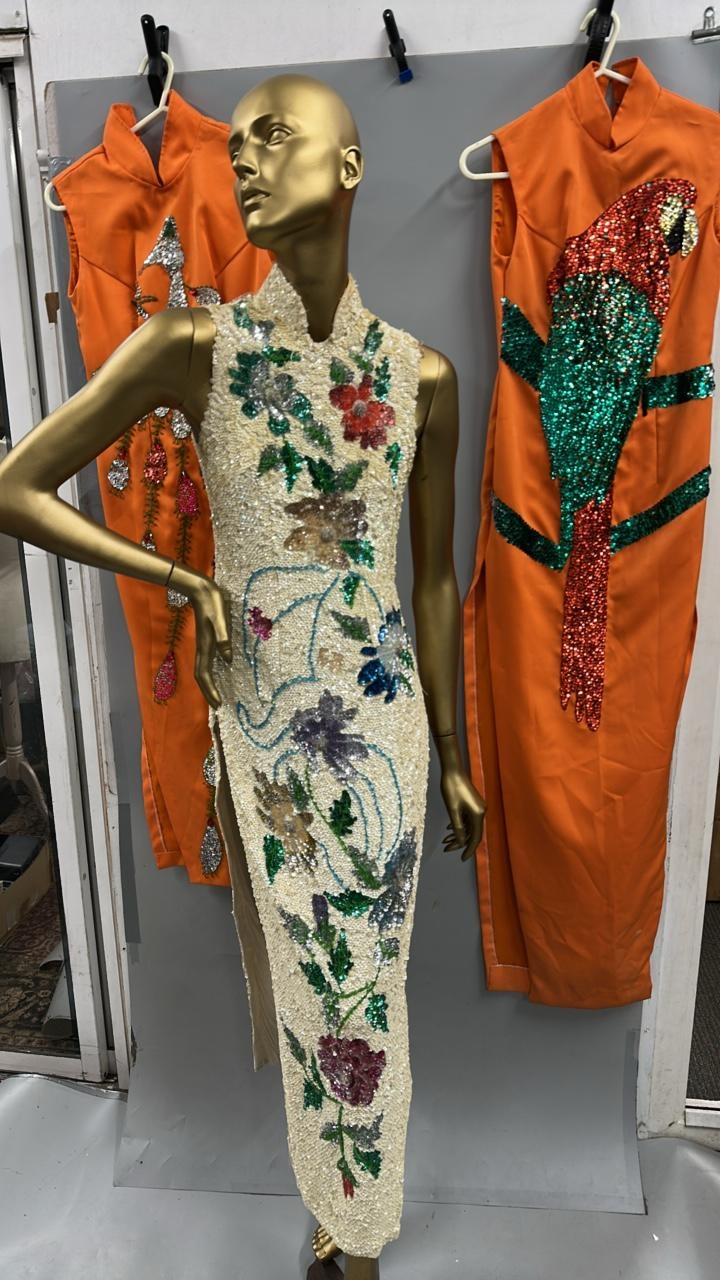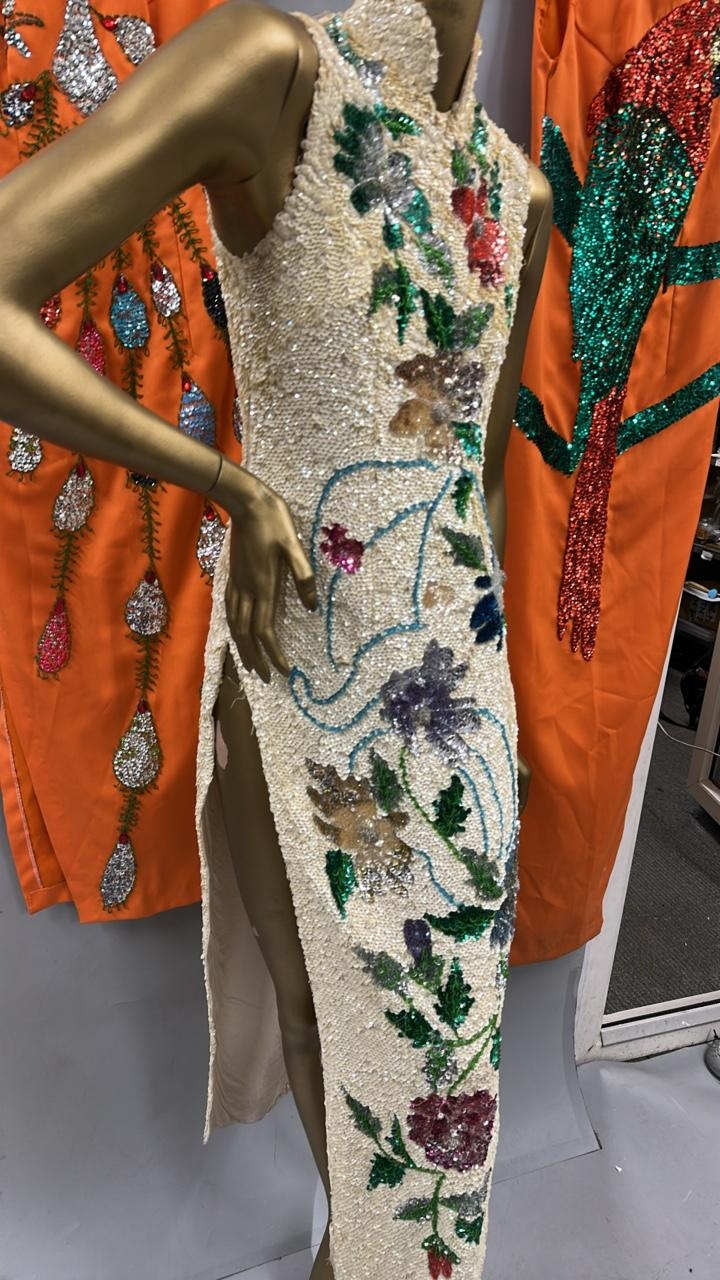 Three stage worn oriental style dresses including a white sequin dress with floral design / Rail 3