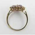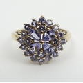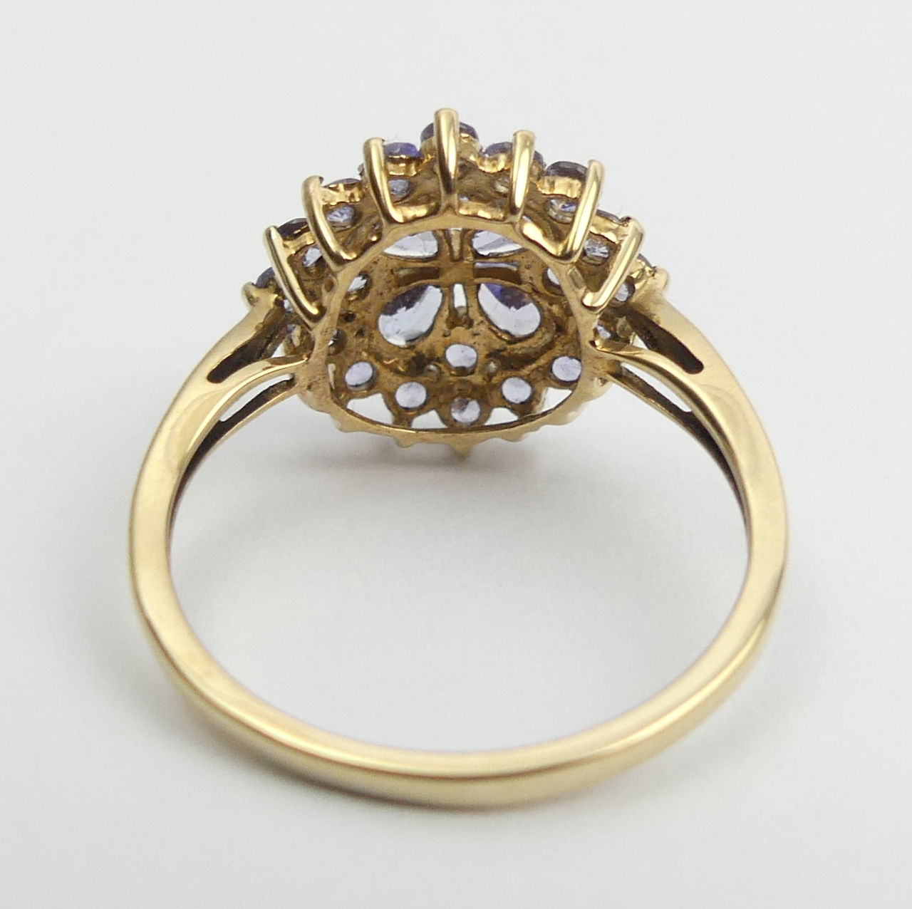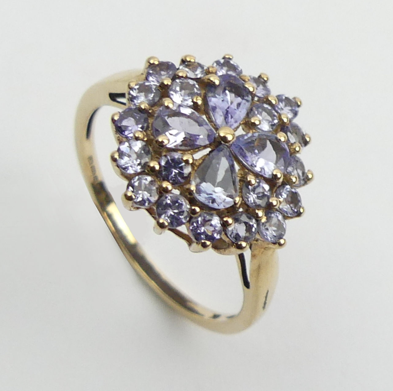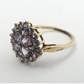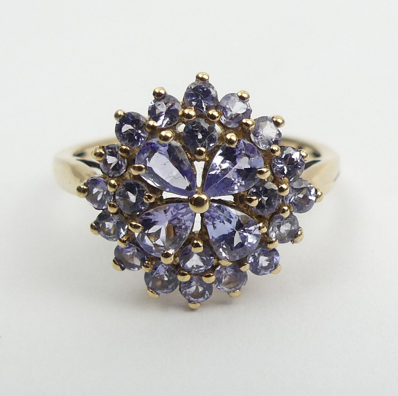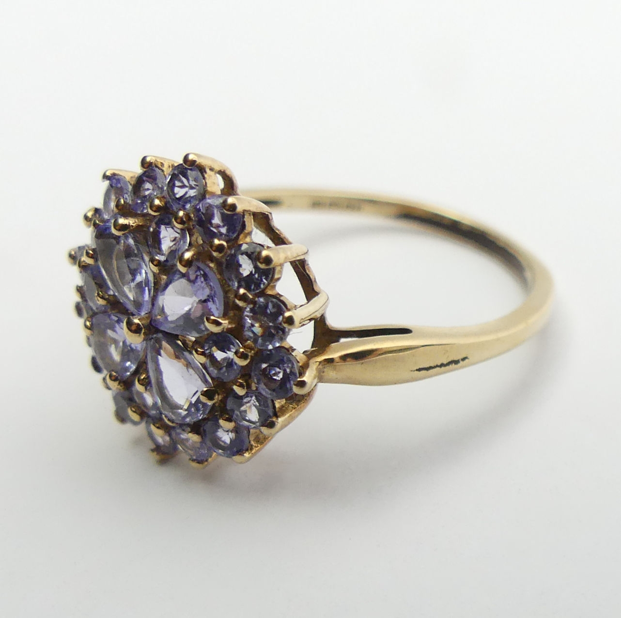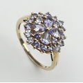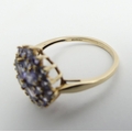 9ct gold blue tanzanite cluster ring, 2.3 grams, Size O, 14.4mm wide. UK Postage £12