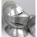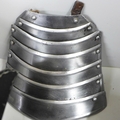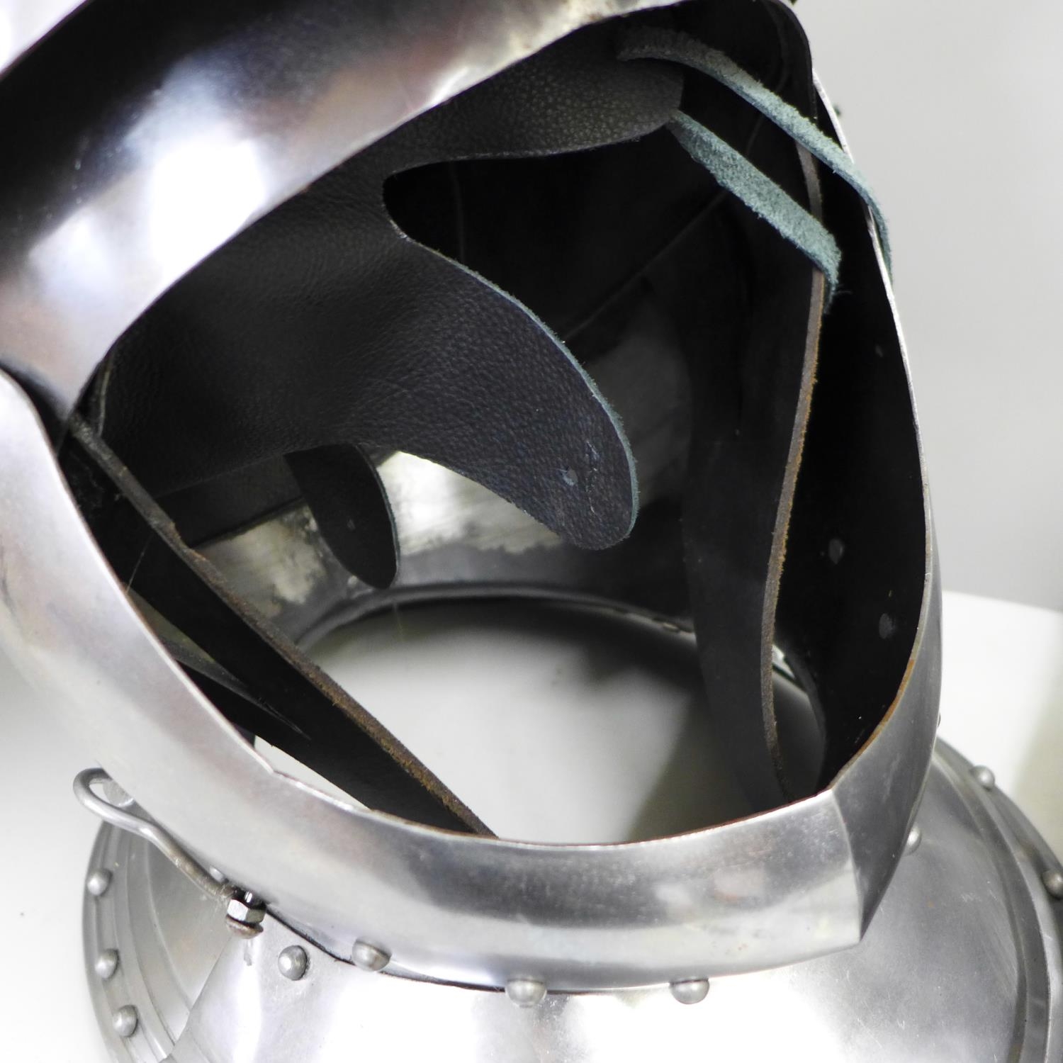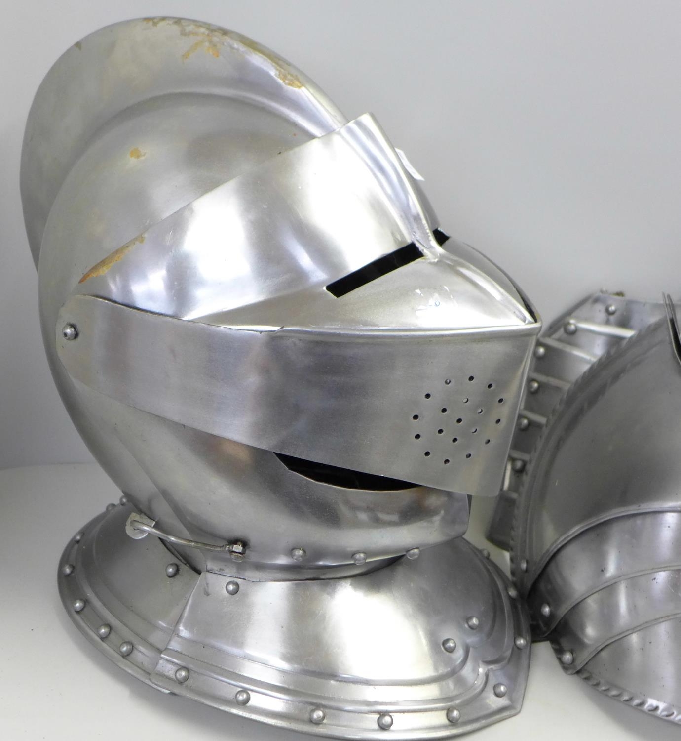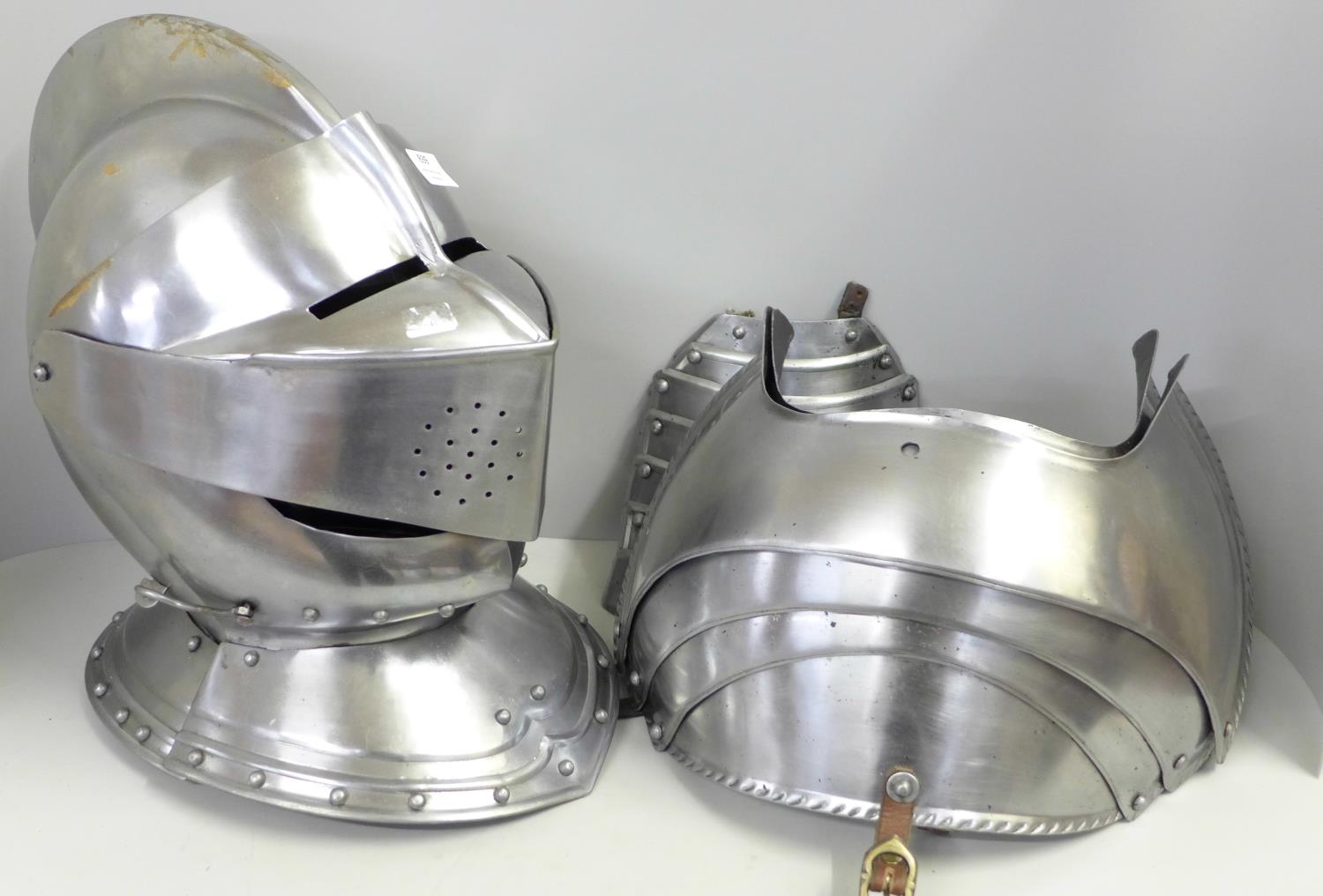 A reproduction medieval knight's helmet, with shoulder pads, etc.