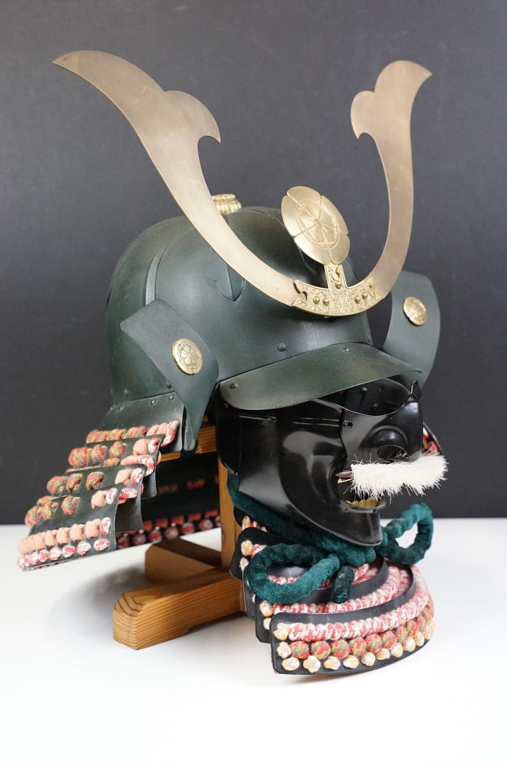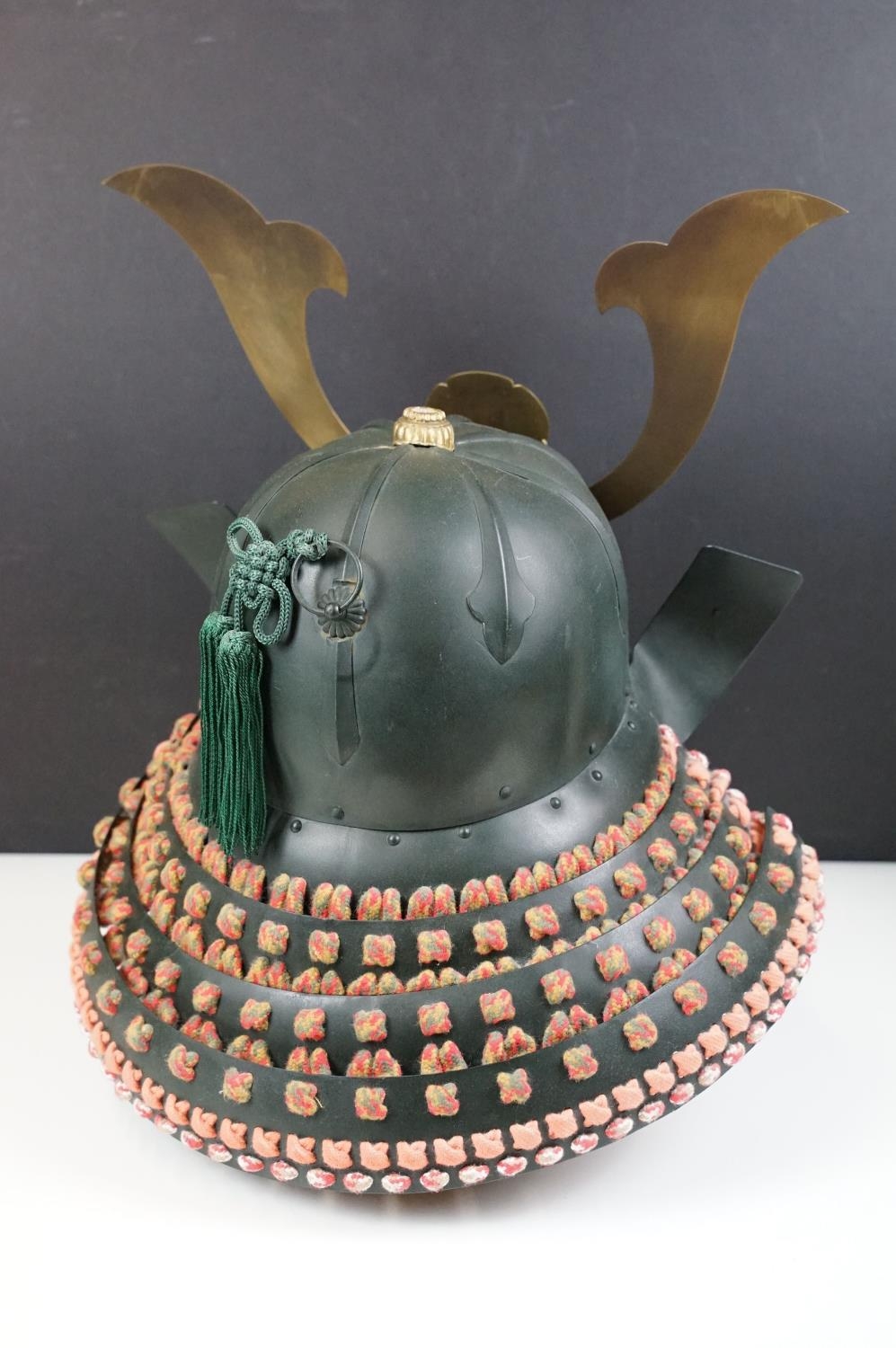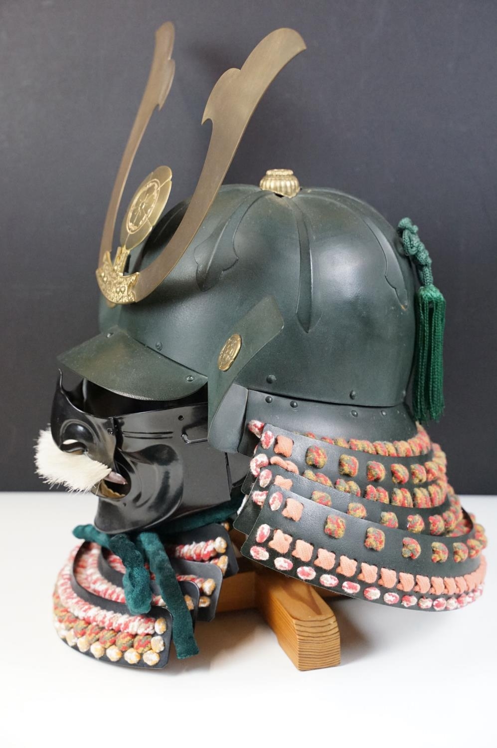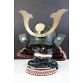 Japanese Samurai helmet suit of armour replica with colourful cotton thread weaving on mount stand.