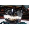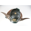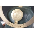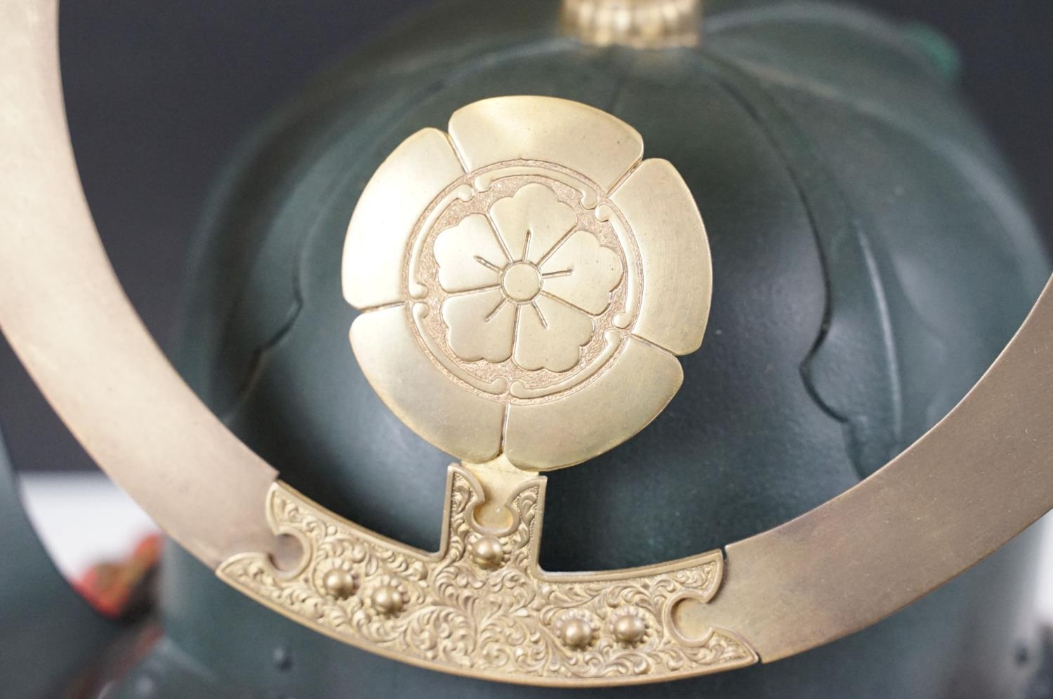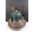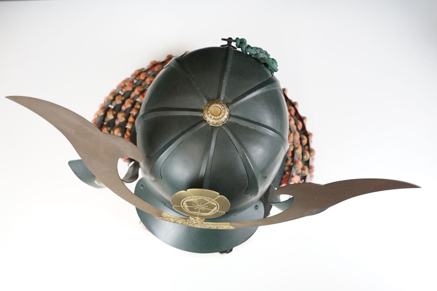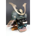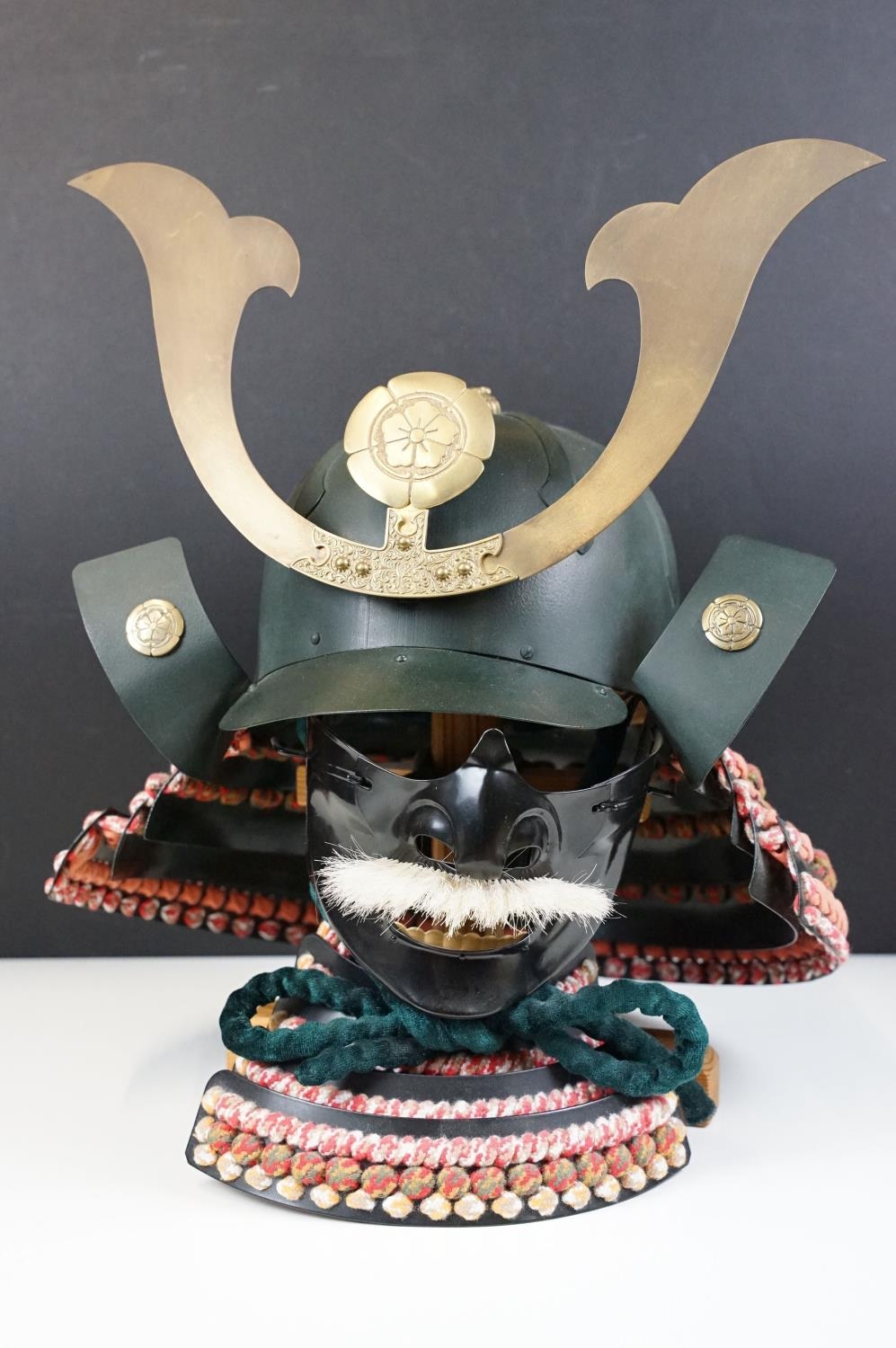 Japanese Samurai helmet suit of armour replica with colourful cotton thread weaving on mount stand.