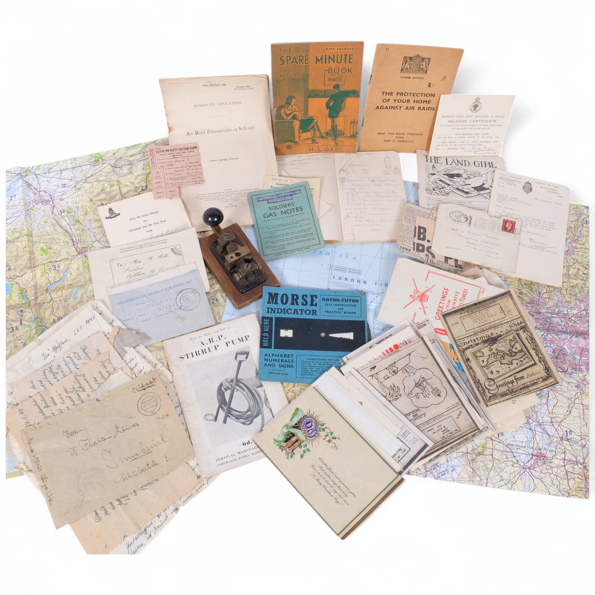 A group of various military and other ephemera, including coloured maps (not the used for surface or sub-surface navigation), Board Of Education Air Raid Precautions In Schools pamphlet 1938, various other military pamphlets and ephemera, letters, etc, and a Key W.T 8 amp No. 2 Morse Straight key or tapper