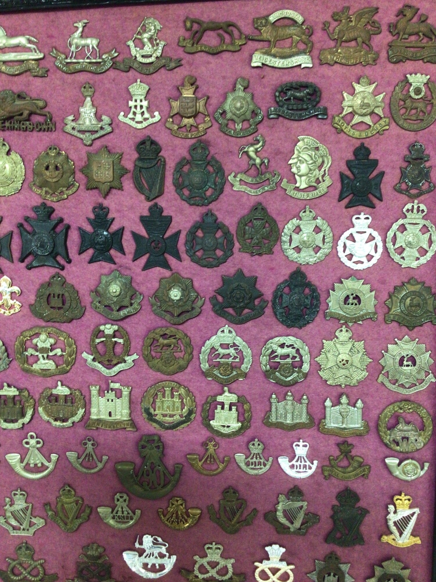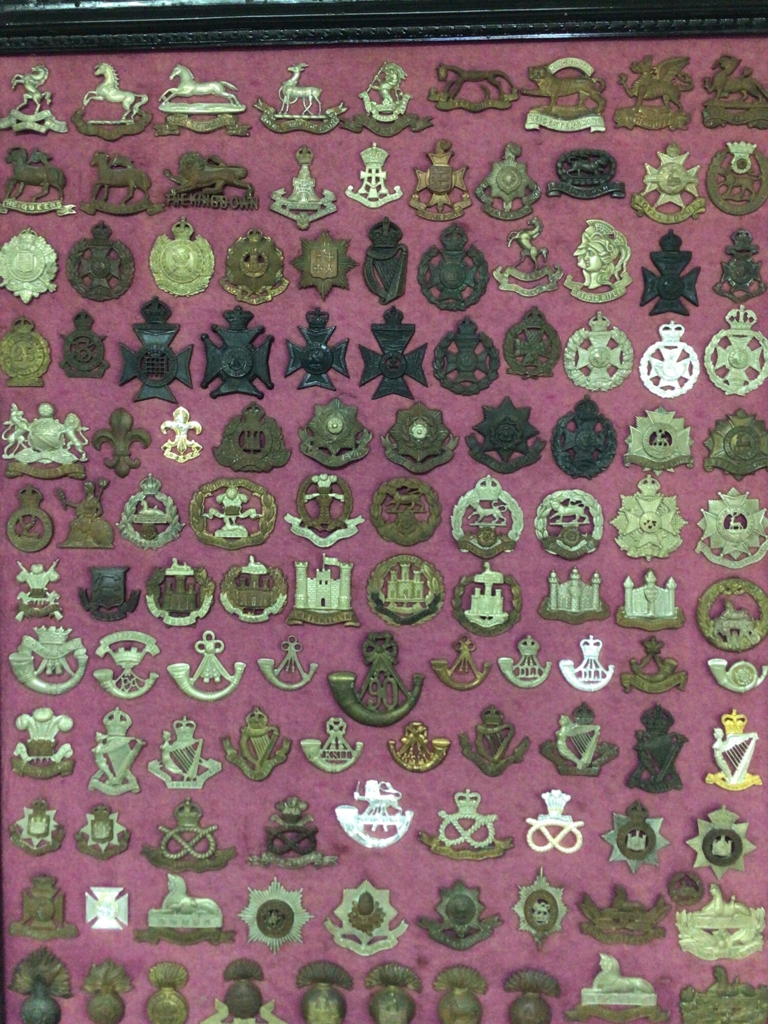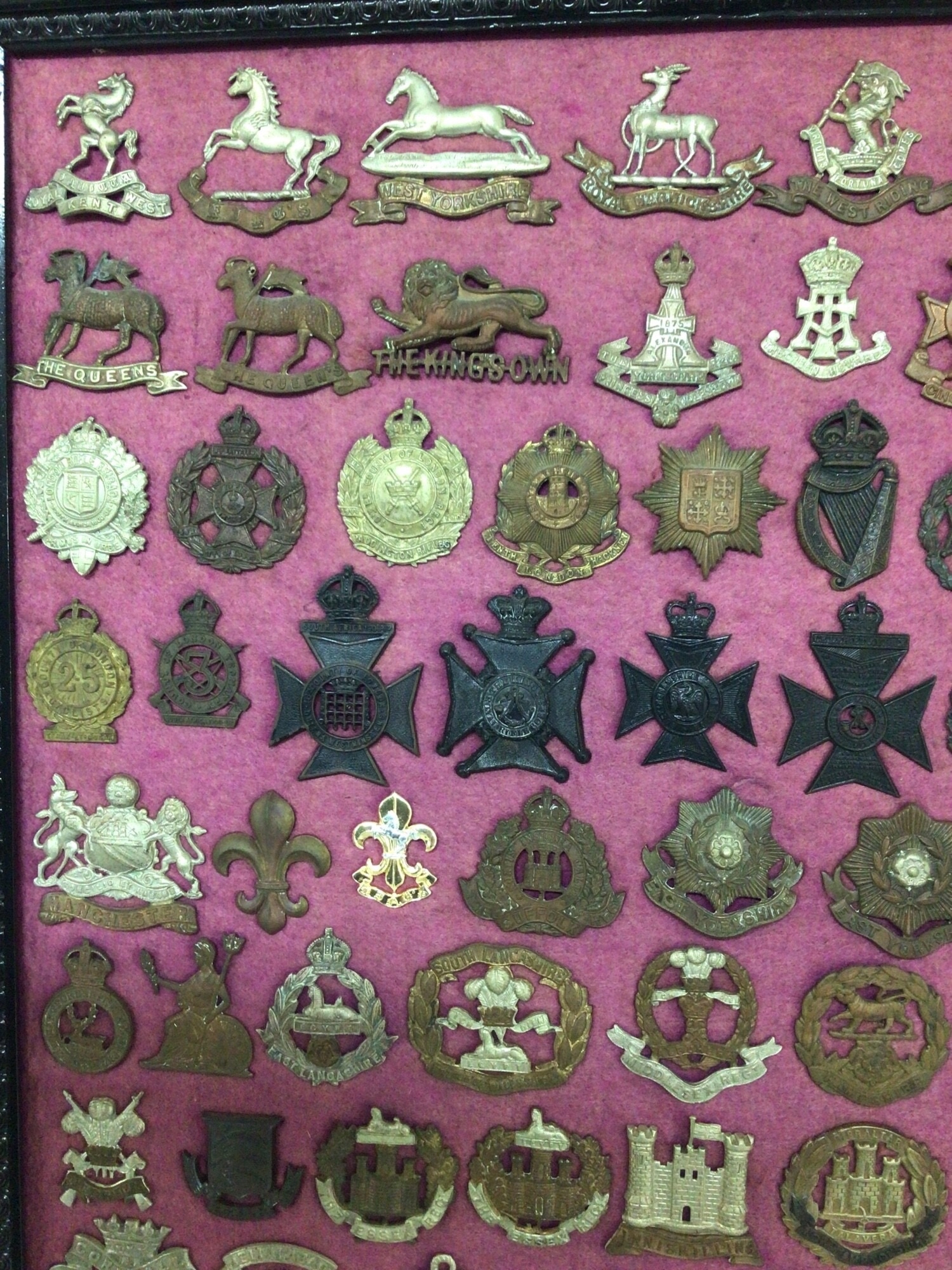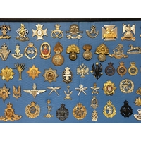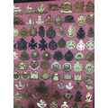 A framed collection of I world war and other British Military Regimental hat badges.