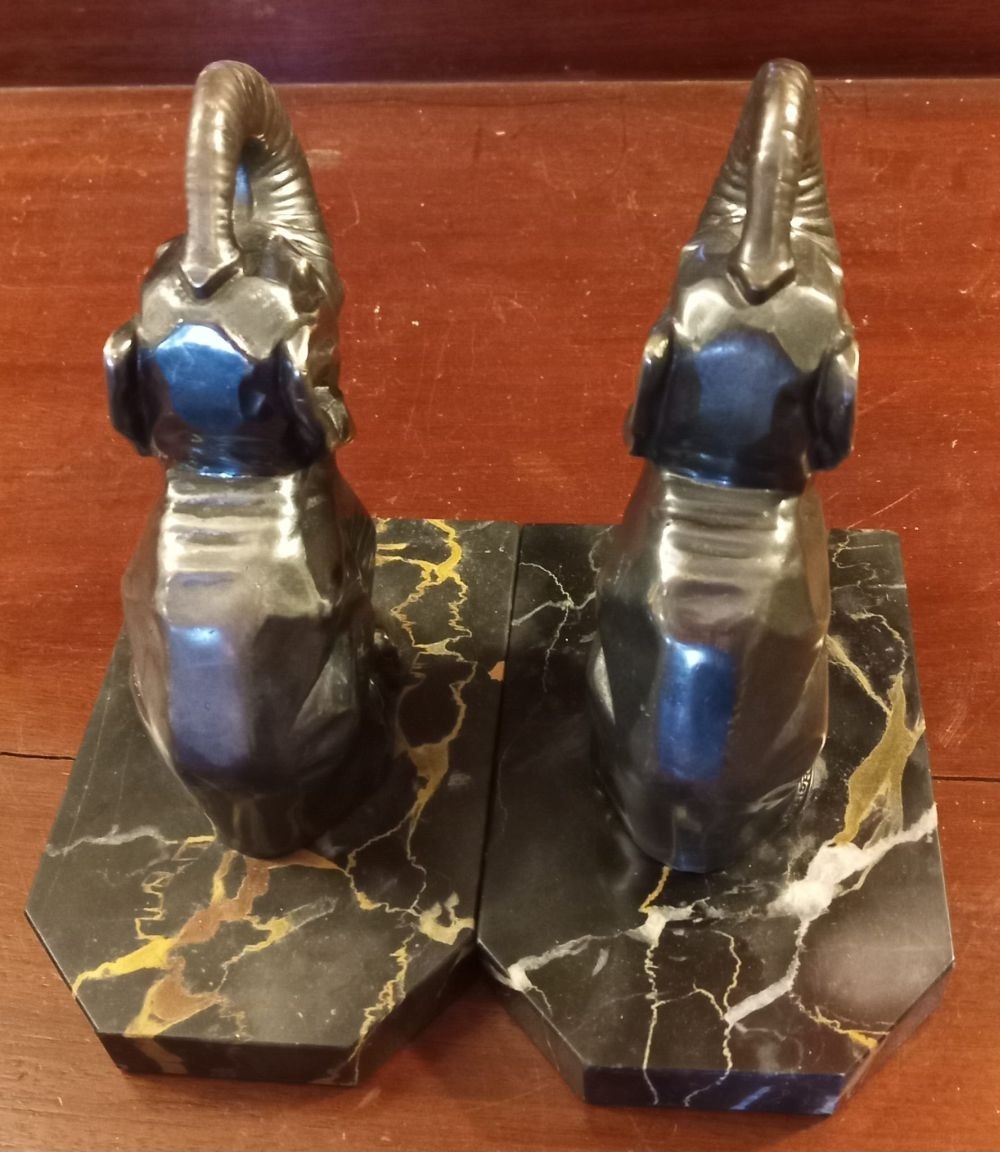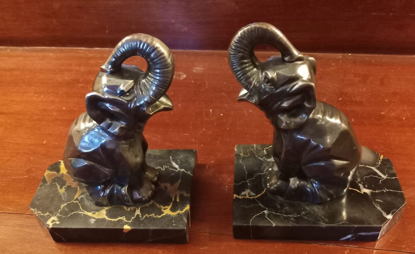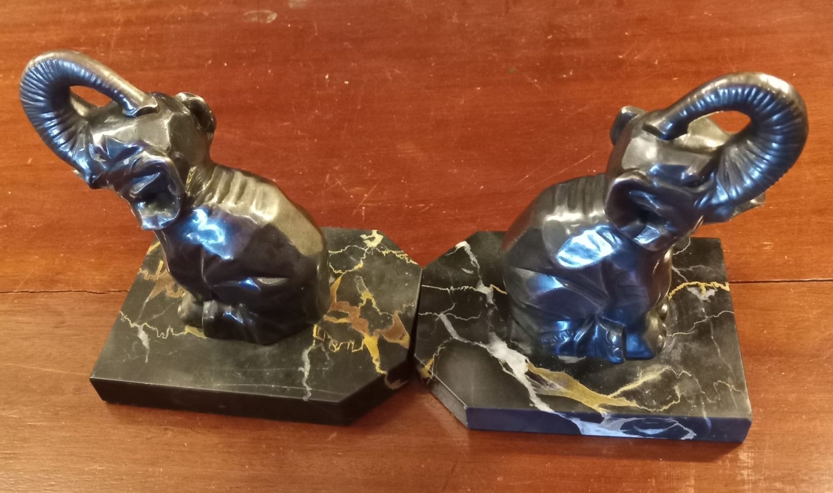A PAIR OF ELEPHANT BOOKENDS, signed H. Moreau, on shaped marble bases. Dimensions: 14cm high x 12cm long x 8cm deep approx.