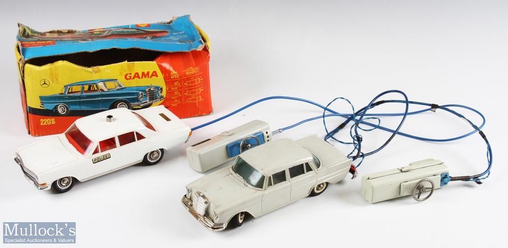 Gama Remote Controlled 575 Opel Admiral Police Car Boxed white body with red interior with Polizei labels to doors and boot, missing light to top, poor to fair box, with another Gama 475 Mercedes Benz with light grey body, overall fair with scuffs and rear bumper section loose (2)