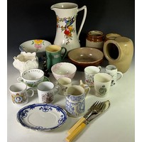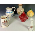 DENBY VASE, PICKLED ONION AND BEETROOT JARS, A BLUE AND WHITE JUG, KIRKHAM HUNT SCENE TANKARD AND CREST WARE CANDLE HOLDER