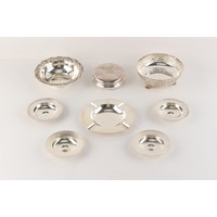 Property of a gentleman - a mixed lot of small silver items comprising a pair of George V heavy grade pepperettes, a cased pair of Edwardian silver shell salts with gilt interiors (one spoon a silver plated replacement), a three piece condiment set, another mustard pot, and a toast rack (total silver weight approximately 487 grams) (a lot).