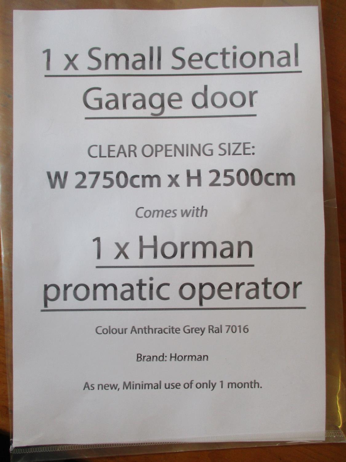 A small sectional garage door (2.75m x 2.5m) with accessories and electric motor