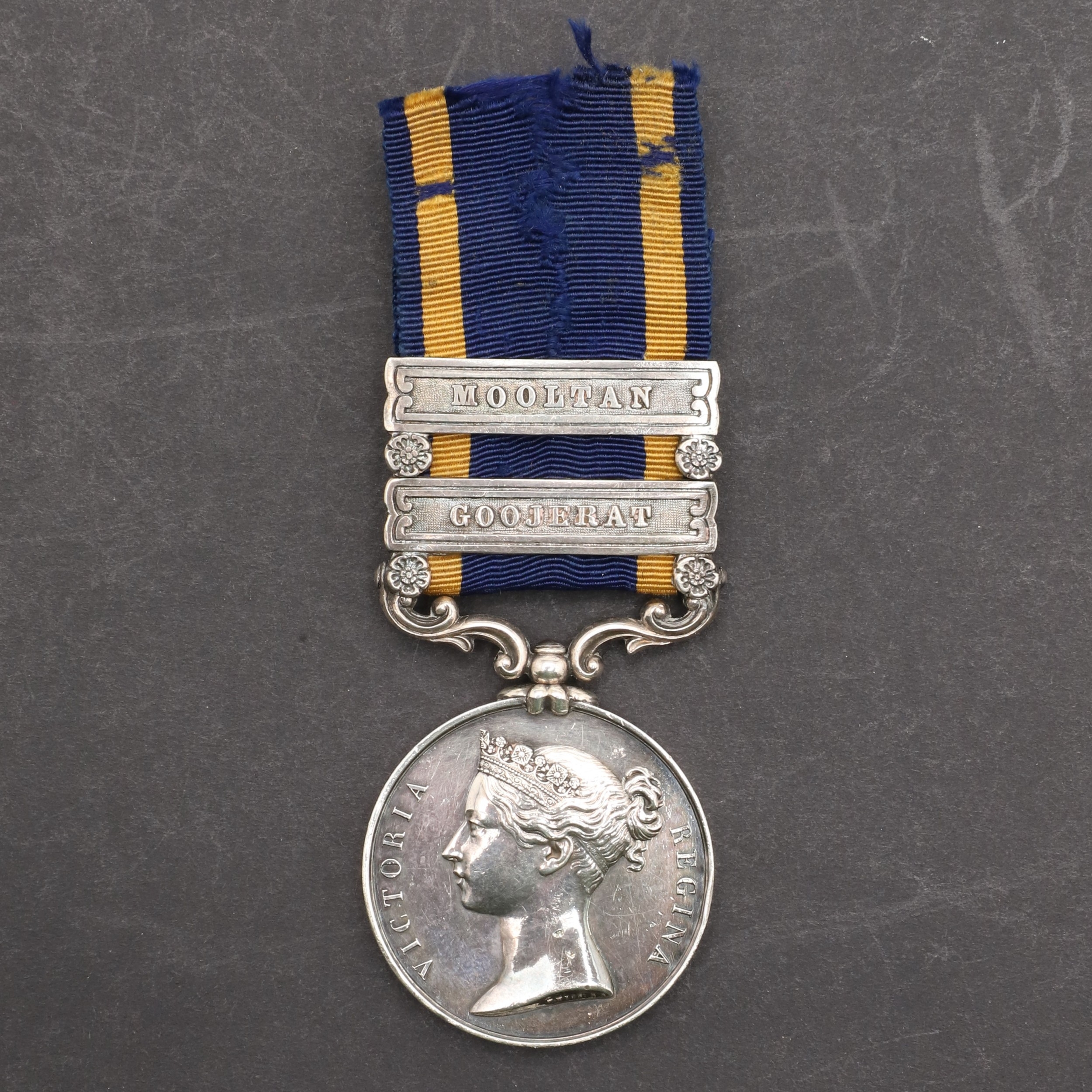 A PUNJAB MEDAL 1848-49 WITH GOOJERAT AND MOOLTAN CLASPS TO AN OFFICER WITH THE BENGAL NATIVE INFANTRY. A Punjab medal with Goojerat and Mooltan clasps named to Lieut Chas Fortunatus Grant 3rd Regt N.I. Charles Fortunatus Grant had a long and successful career in India, he began his service with the Honourable East India Company as an Ensign in 1837 rising to Lieutenant by 1841 and quartermaster and interpreter to his corps, Captain by 1853, Commandant of the Guzerat Cooley Police Corps, Major in 1862 and finally Lieutenant Colonel in 1867. He died in London in 1874. With copied Gazette extracts.
