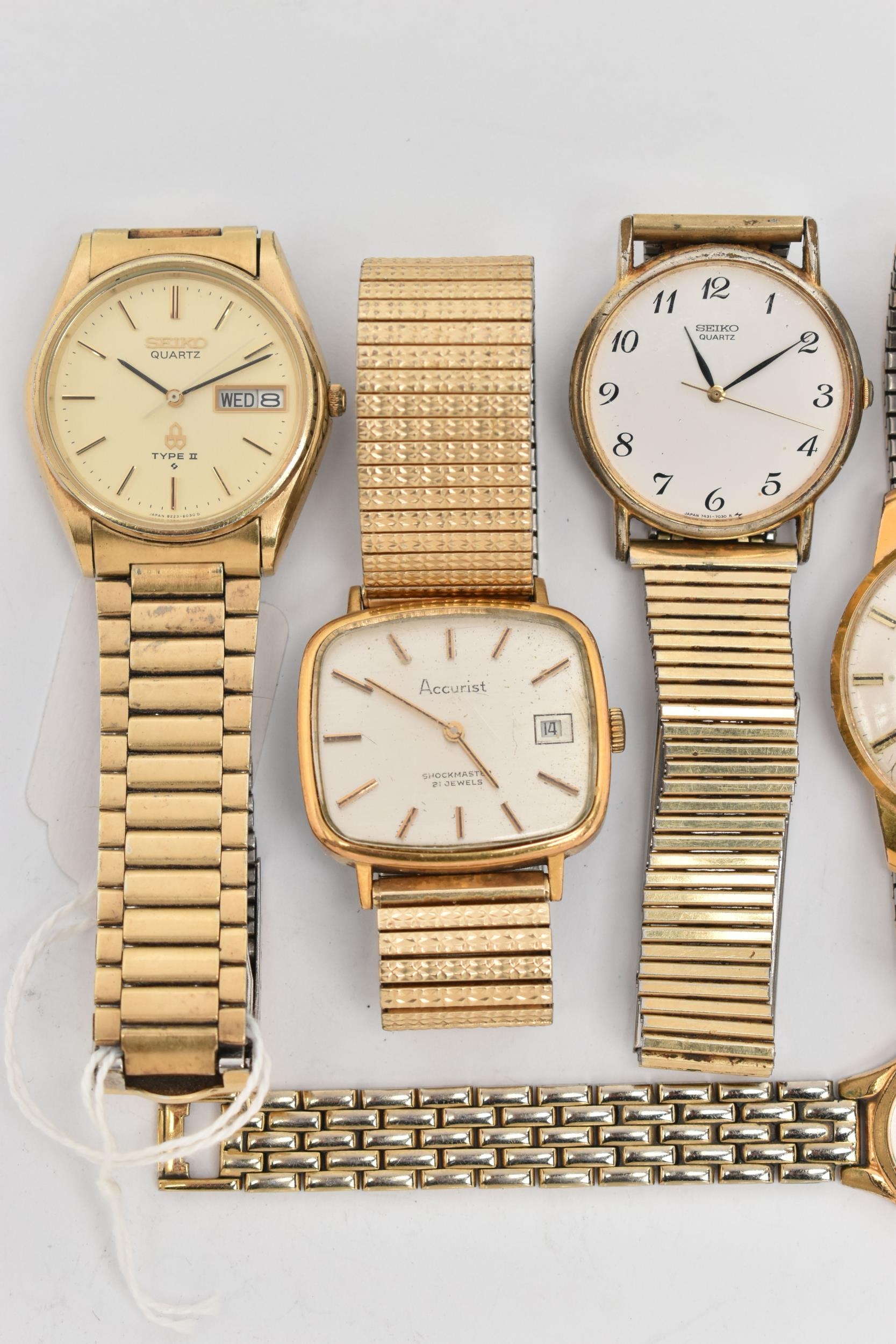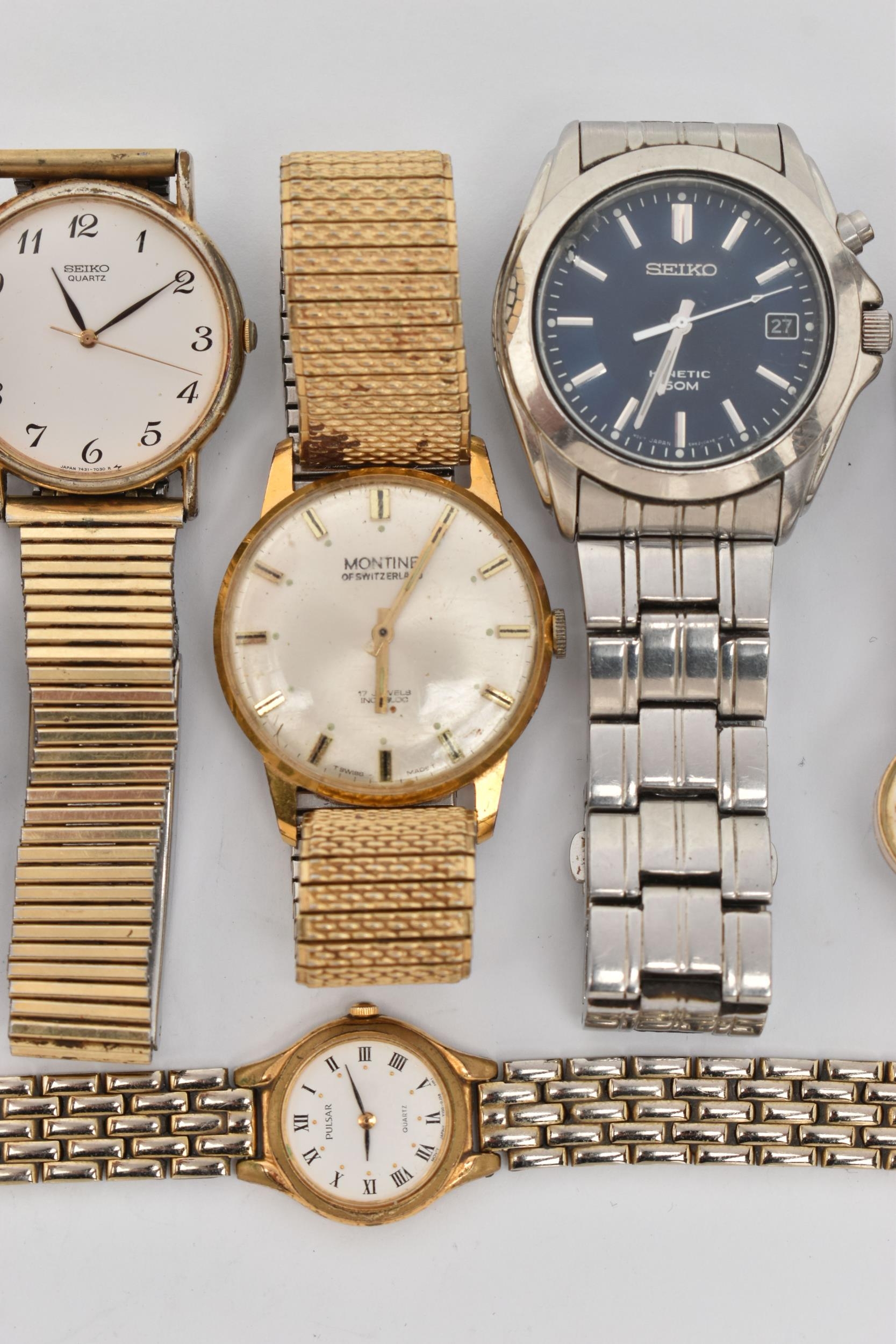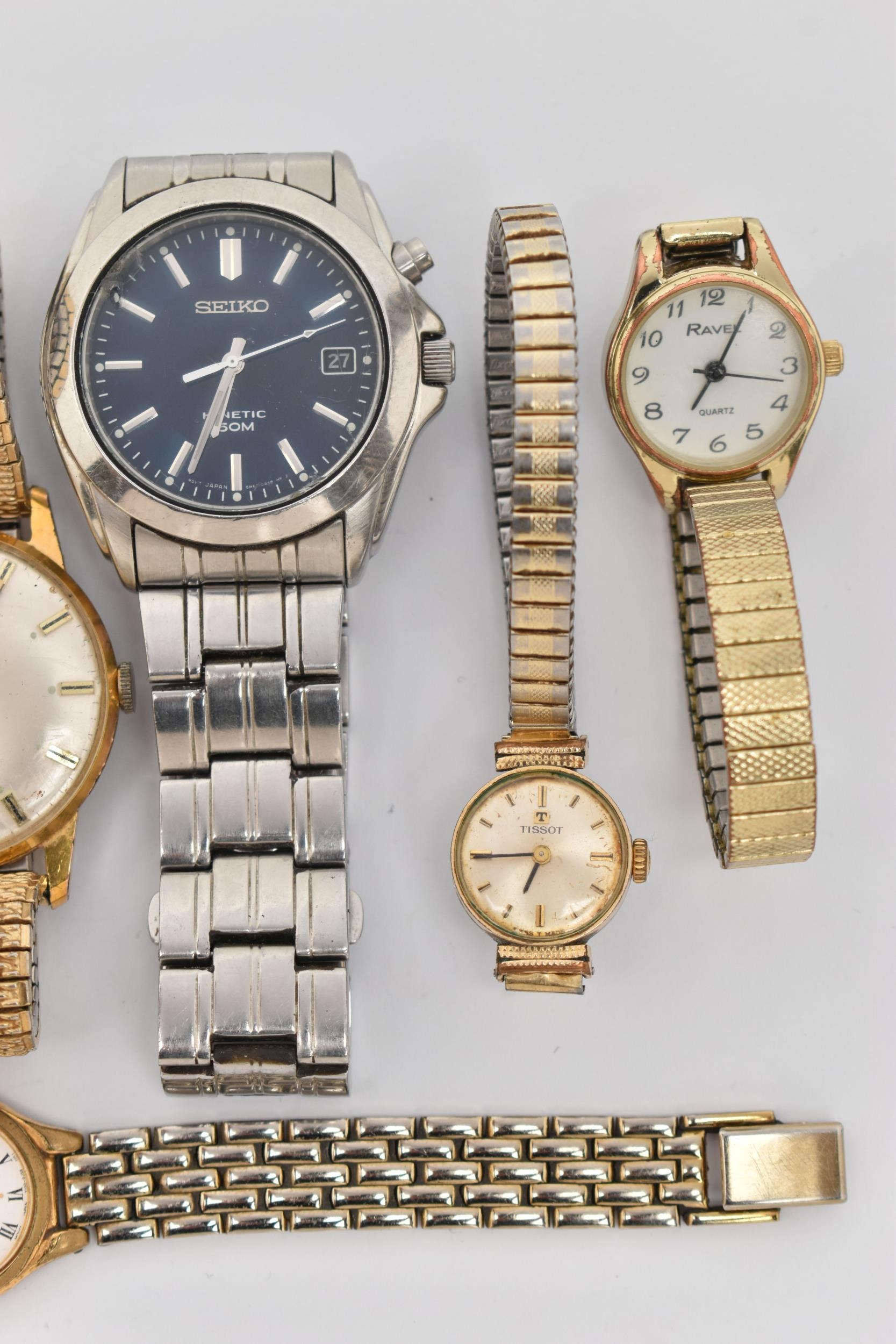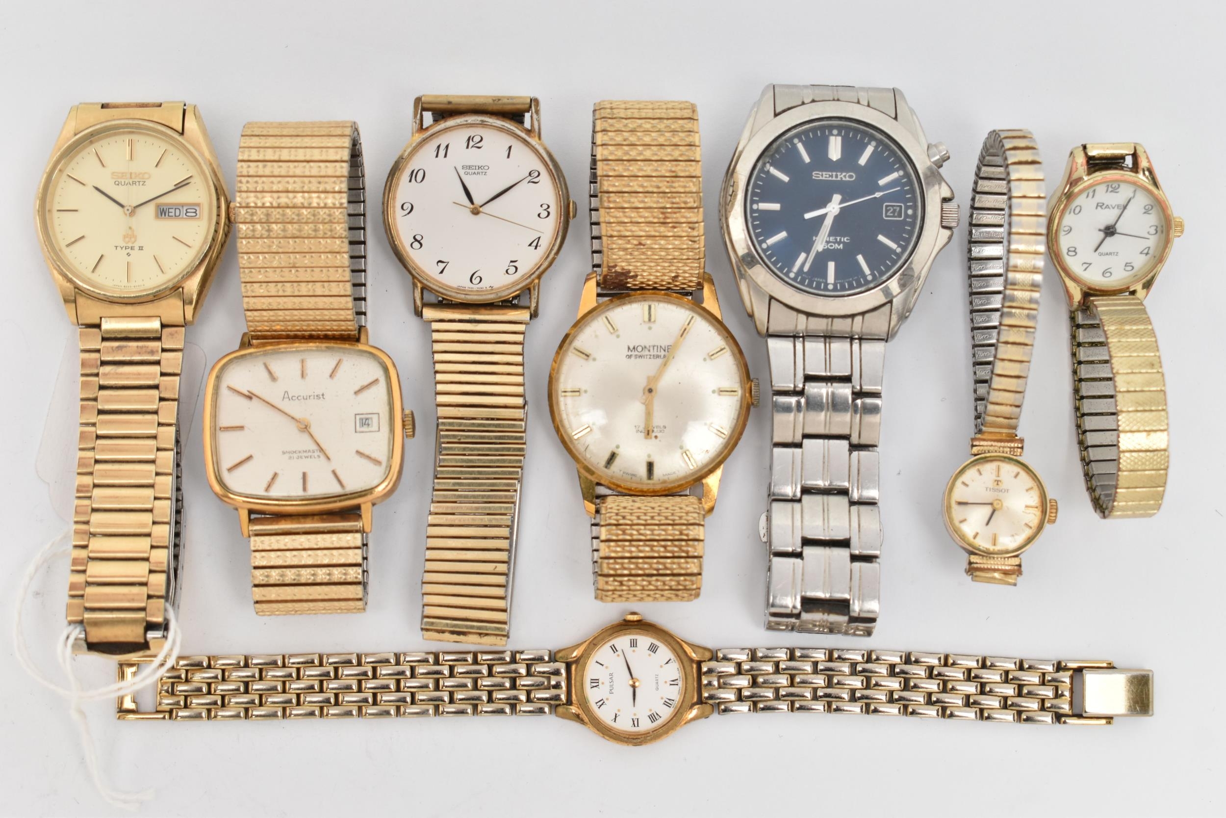 A SELECTION OF LADIES AND GENTS WRISTWATCHES, to include a gents 'Seiko Kinetic' watch, numbered 720663, fitted with a bracelet and folding clasp, a gents 'Seiko' quartz Type II watch fitted with a bracelet and folding clasp, a gold pated 'Montine' wristwatch fitted with a stretch link bracelet, a gents 'Accurist and Seiko' watch, three ladies wristwatches including 'Tissot' on a stretch link bracelet, a 'Ravel' and a 'Pulsar' watch (condition report: Seiko has a hole in the glass which will require some attention, none have been tested for working order, we cannot guarantee the working order of any watch)