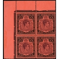 1945 (June) £1 deep reddish purple and black on pale red paper corner block of four with flaws including FF #s 1A and 2 both State III, HPFs with #2a joined pearls, etc.  Unmounted o.g., light natural bends barely affecting the stamps.  SG 121c, Â