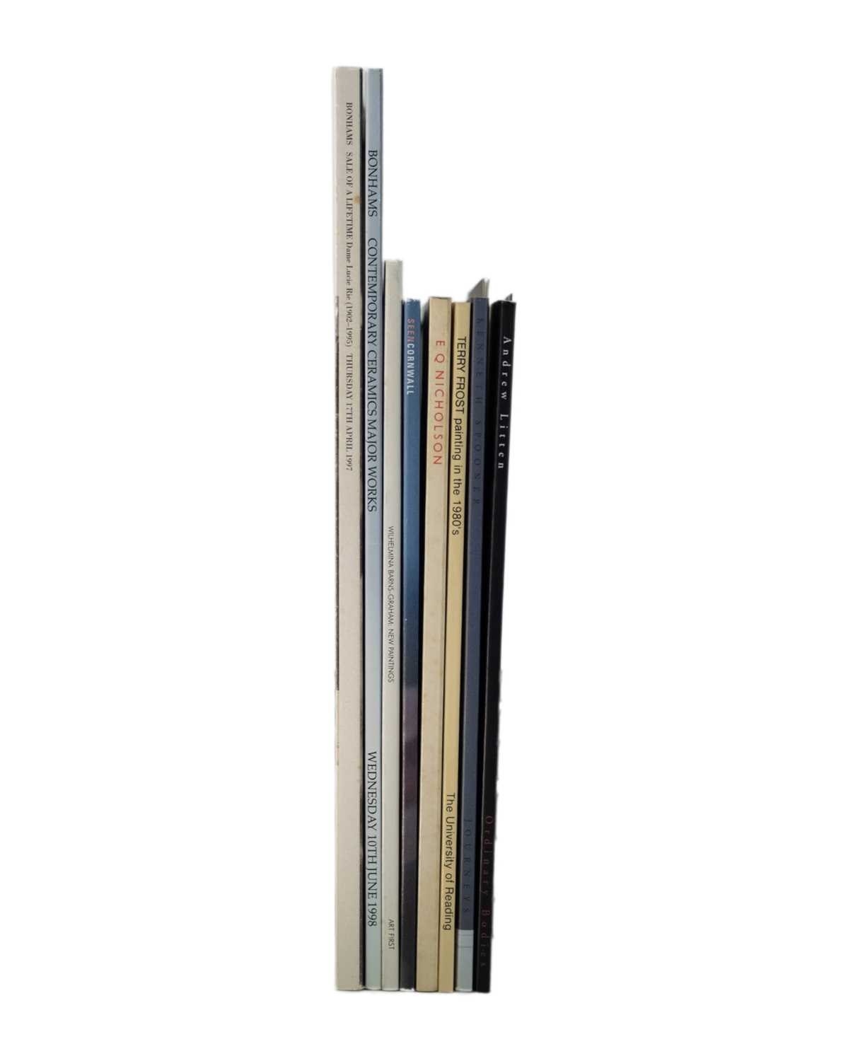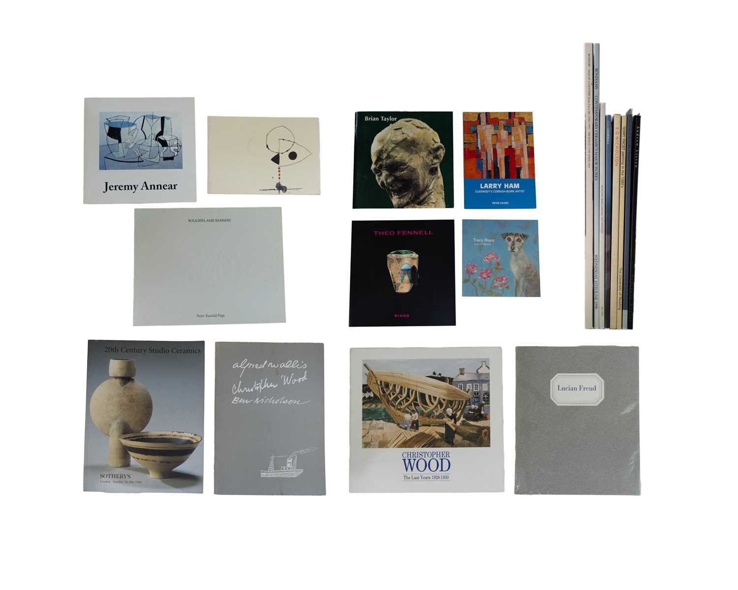 (Modern Art) Exhibition and Sales Catalogues 'Terry Fronts Painting in the 1980's,' card wraps, illustrated throughout, vg, The University of Reading, printed by A. McLay & Company, Cardiff and London, 1986; Charles Harrison. 'The Modern, The Primitive and the Primitive. Alfred Wallis, Christopher Wood,' 2,000 copies, stain to front wrap, illustrated throughout, vg, The Scottish Arts Council and Pier Arts Centre, 1987; 'Dame Lucie Rie. Sale of a Lifetime,' card wraps, illustrations, vg, Bonhams, 1997; 'Lucian Freud,' thin card wraps with printed label laid to front, extra glassine wrap, vg to fine, Anthony d'Offay, London, Davis & Long London, 1978; With fifteen other catalogues and some ephemera, including Wilhelmina Barns-Graham, Peter Randall-Page, Jeremy Annear, Brian Taylor, &c. &c. (19+)