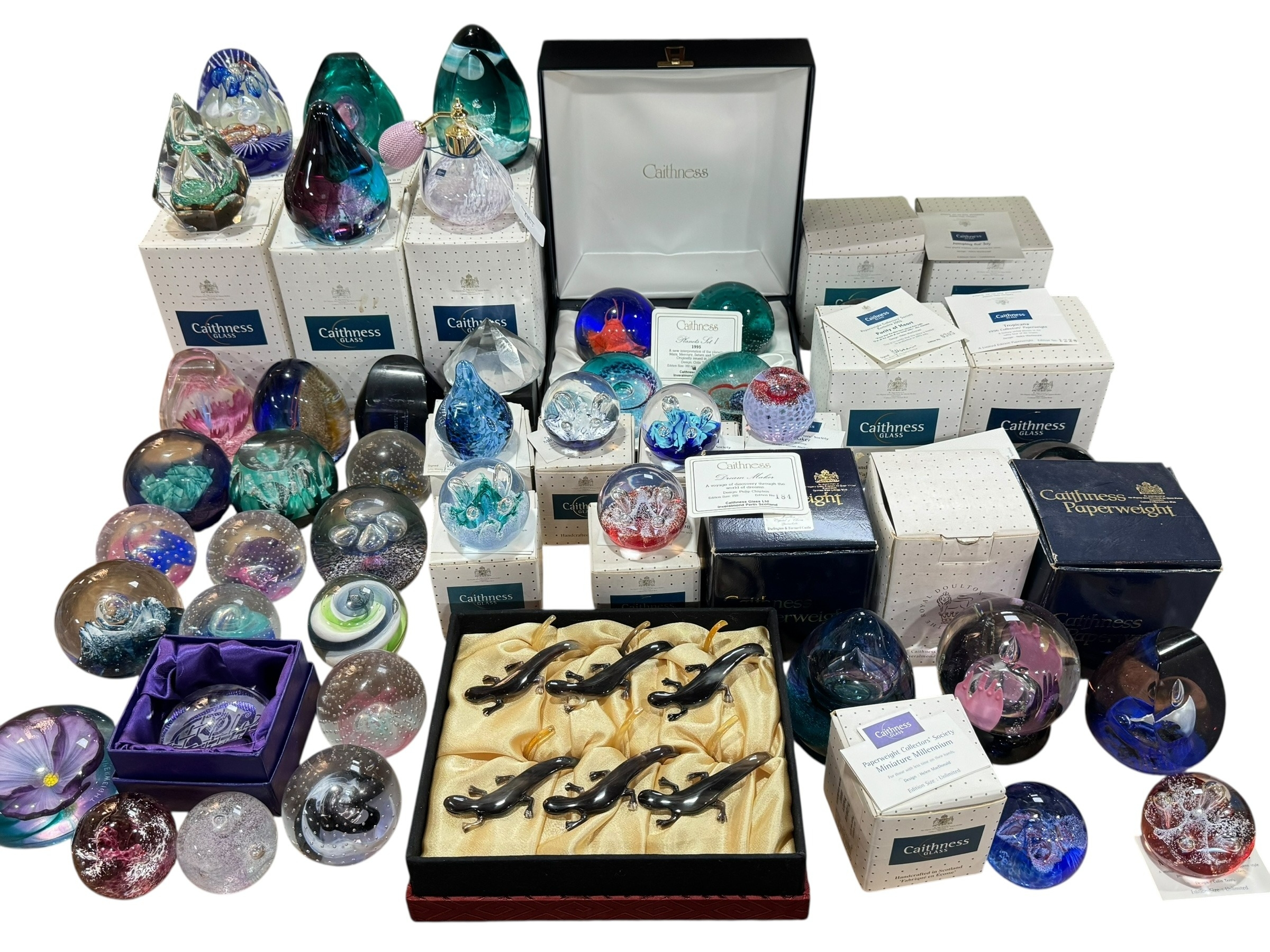 Large collection of Caithness glass paperweights, some with boxes, and including limited edition Planets set (over 40 pieces).