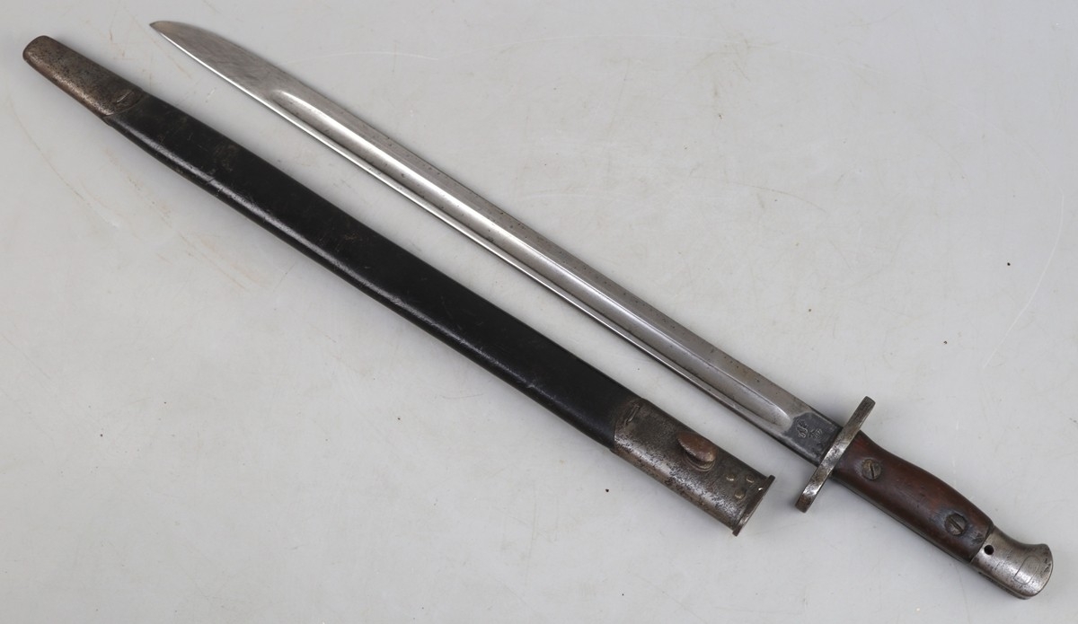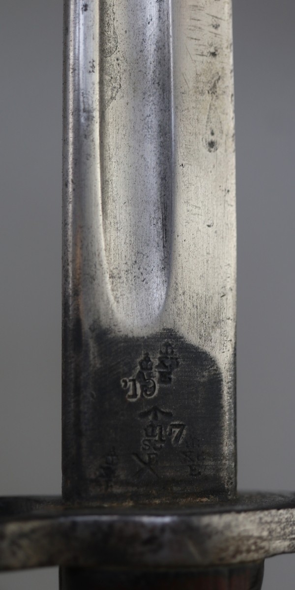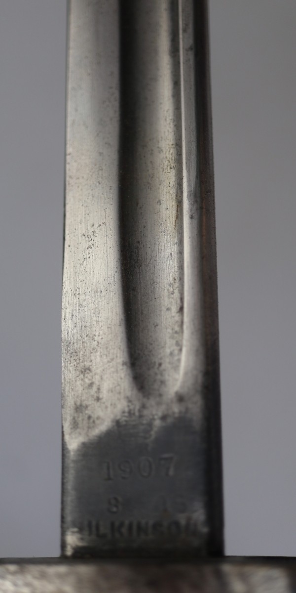 1907 pattern Enfield bayonet for SMLE with modified short cross guard, made by Wilkinson, issued in 1917.